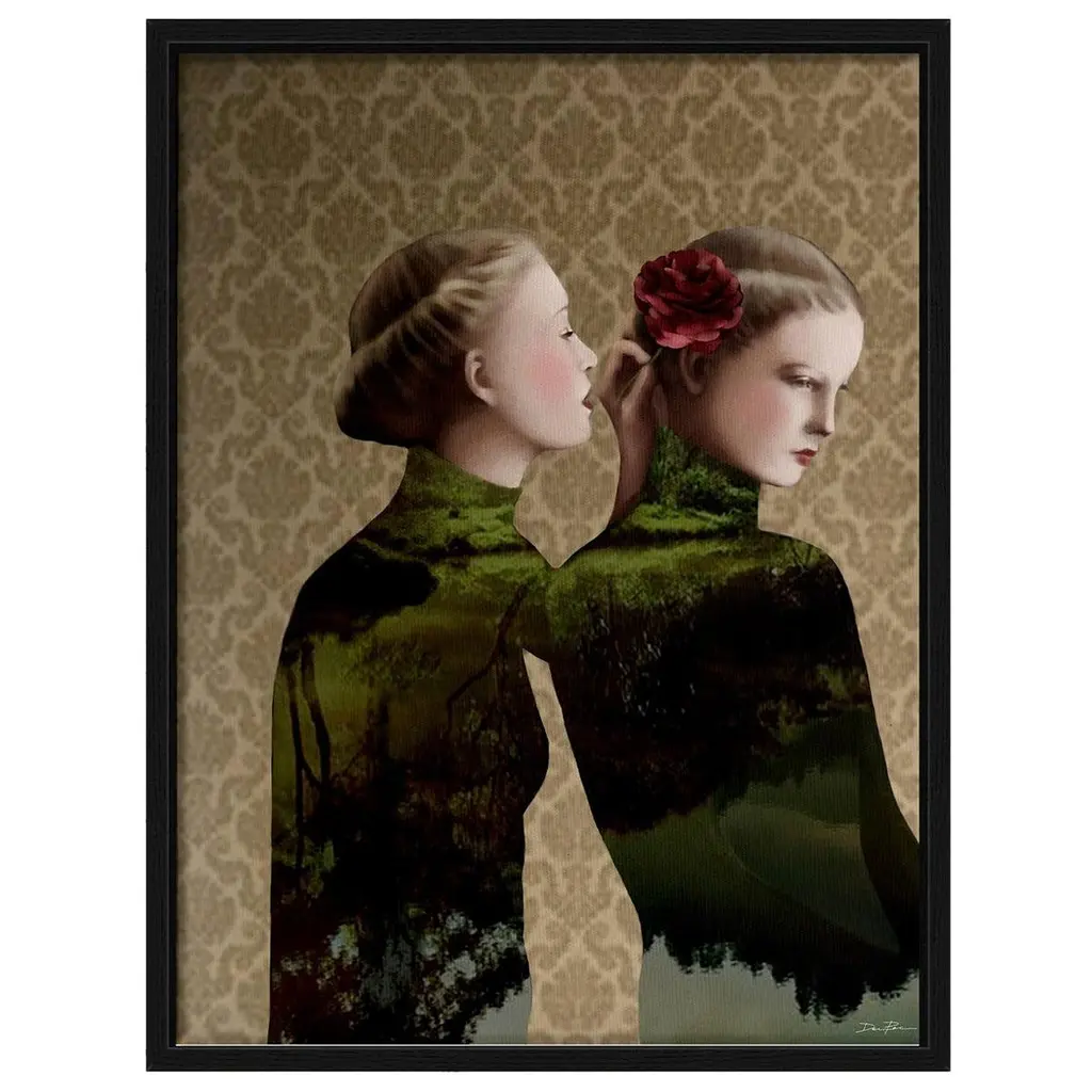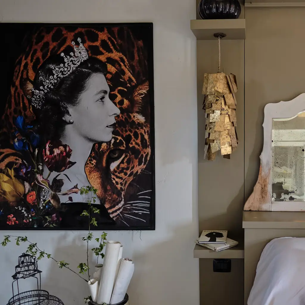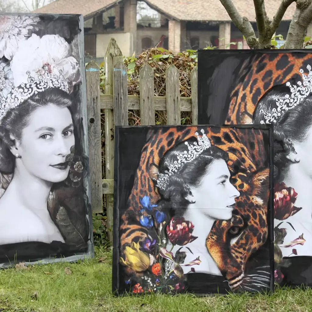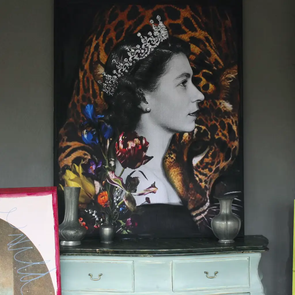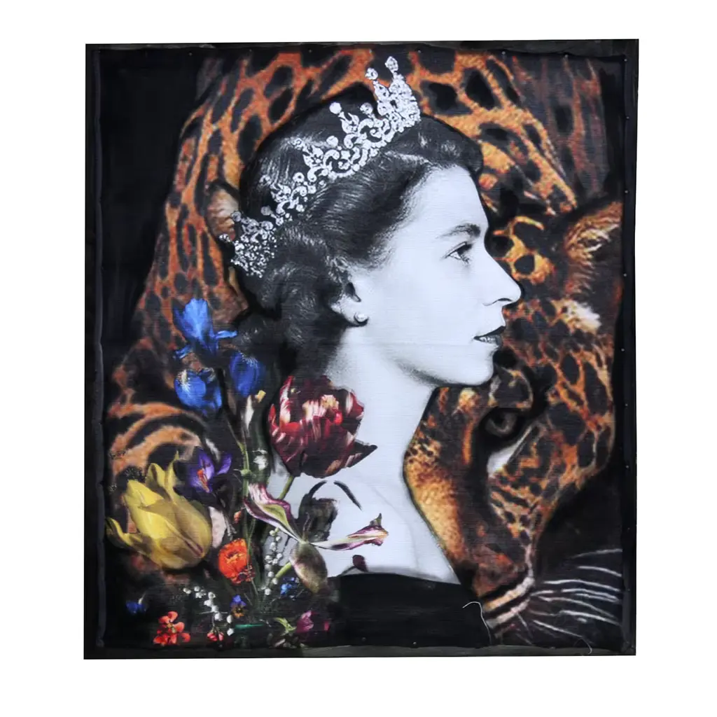 A bold, captivating artwork by set and costume designer Barbara Petrecca, this stunning tapestry depicts a black and white portrait of a young Queen Elizabeth II set against an arrangement of flowers and a cheetah. Printed on fabric and finished with hand-painted details in acrylic colors, it is framed on a rough wooden canvas. This piece may feature slight variations from the pictured item due to its handcrafted nature.