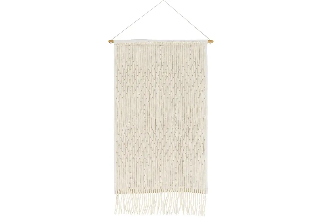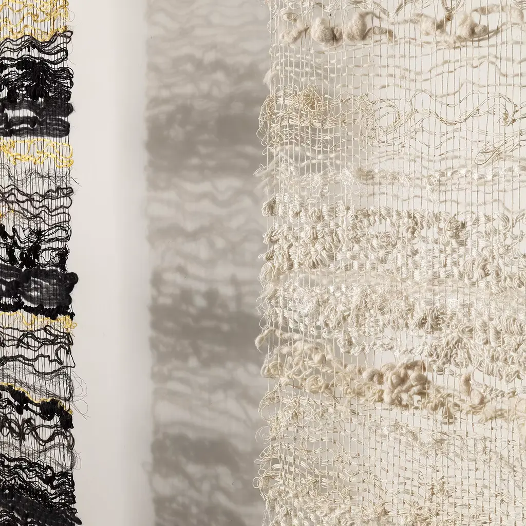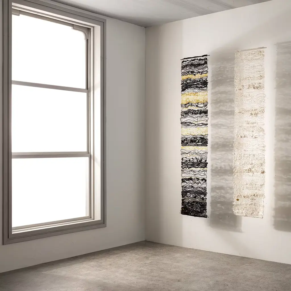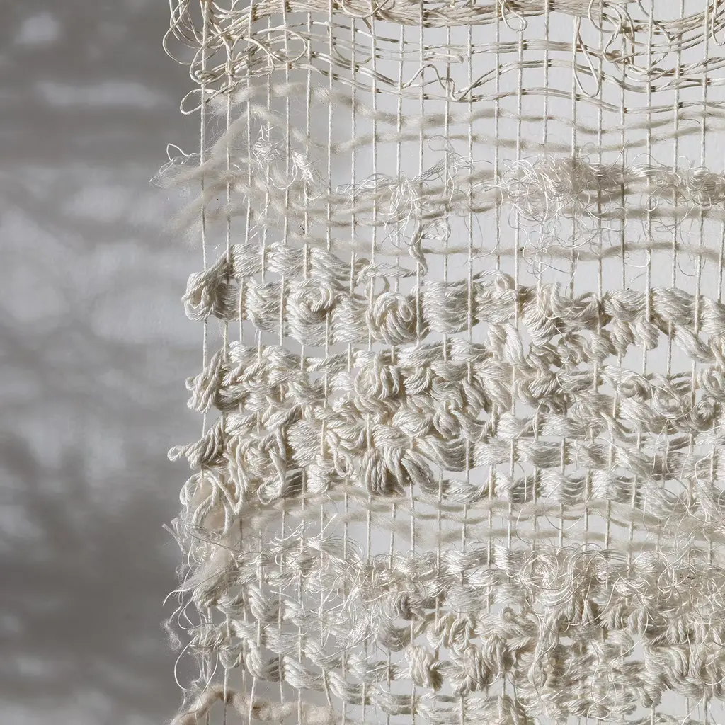 This fascinating hand woven vertical tapestry uses traditional techniques in a composition of linen, hemp, silk, shantung silk, wool and cotton. Seeking to represent a dialogue on The Home, the tapestry is best hung at a distance of 7 - 10 cm from the wall, so as to create delightful and decorative shadow plays. Size and coloring are customizable.