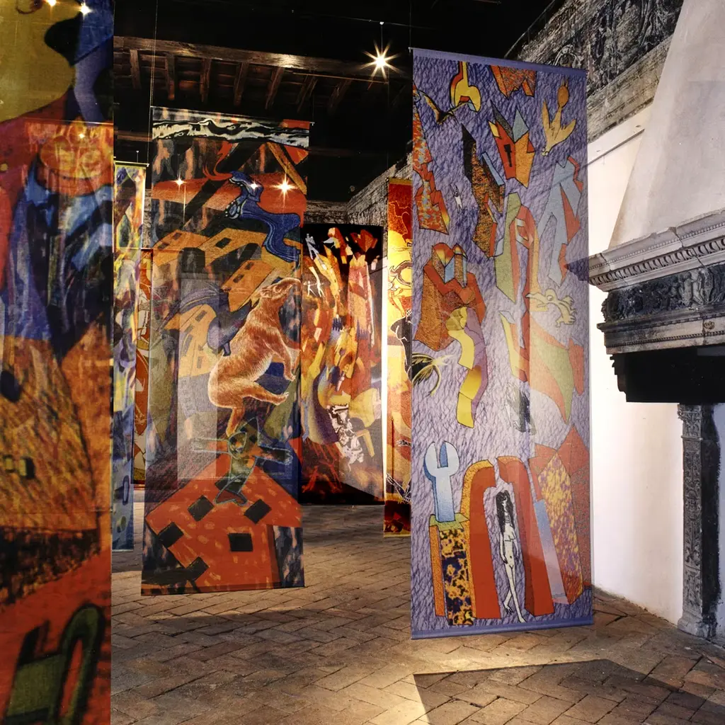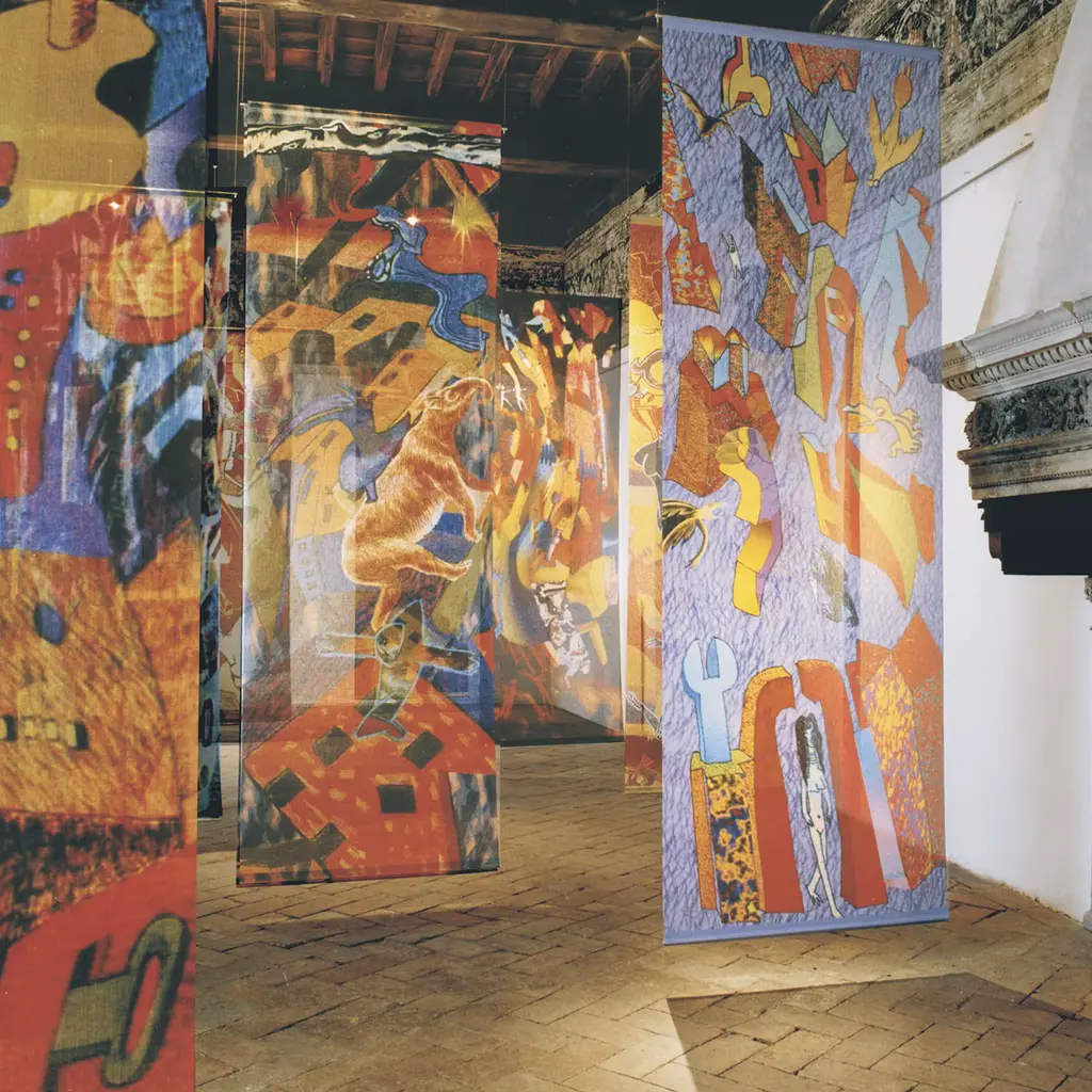 A triumph of vibrant, contrasting hues was selected for this eccentric tapestry of superb surrealist inspiration. Vaguely anthropomorphic and zoomorphic figures are depicted in the midst of a labyrinth city, whose distorted traits and daring shades allow to convey a sense of simultaneous anguish and loneliness that still cast a shadow on the dimension of discovery. The piece will be ideally fitted to ceilings, more functional to let its light filtering quality emerge.