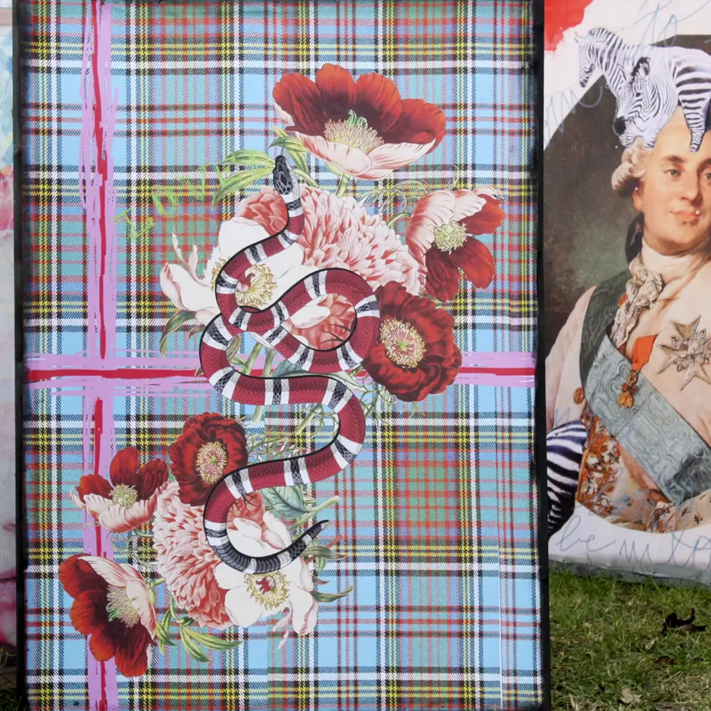 A spectacular design piece of vintage elegance, this tapestry will make a bold and iconic statement in any interior. Framed on a rough wooden canvas, its printed fabric decoration is finished with exquisite details painted by hand with acrylic colors, adding to its handcrafted character. Named the "The Dance of the Snake" in Italian, it depicts a snake juxtaposed to a flower backdrop contrasting with a colorful tartan vintage motif.