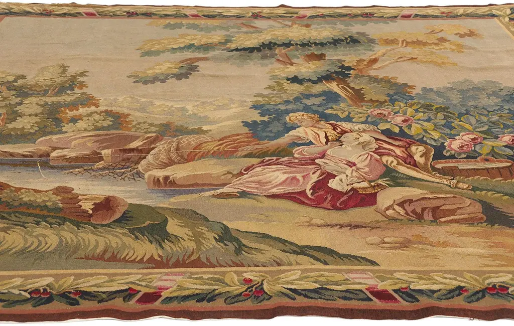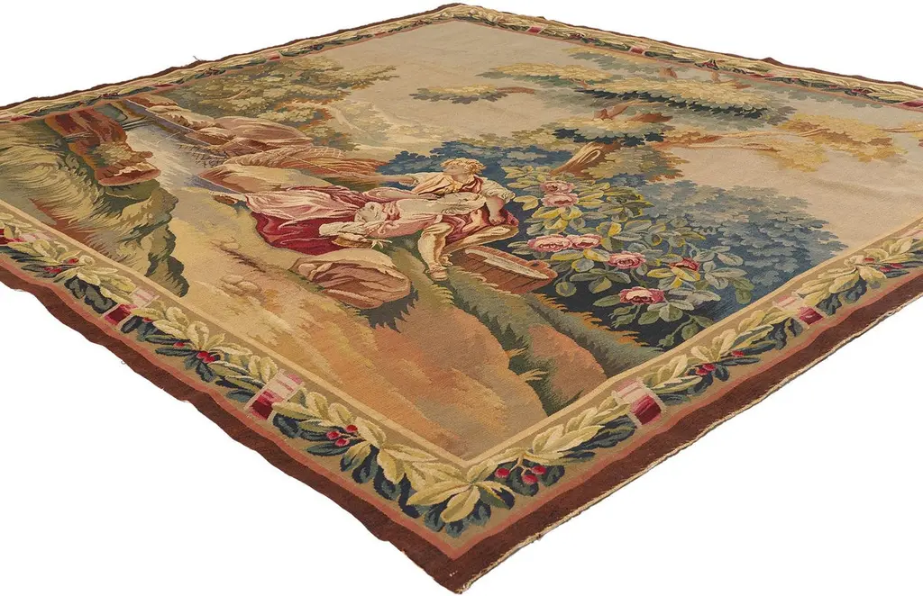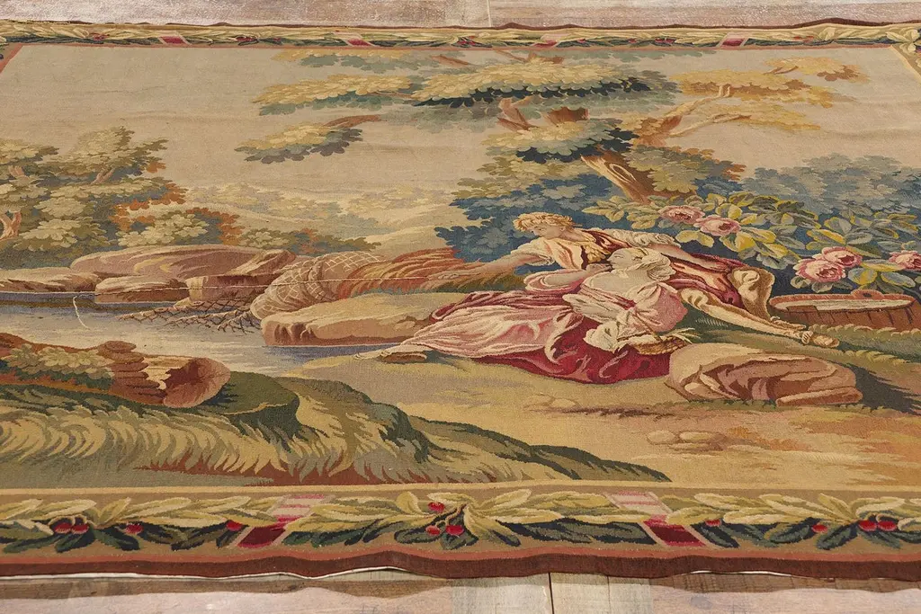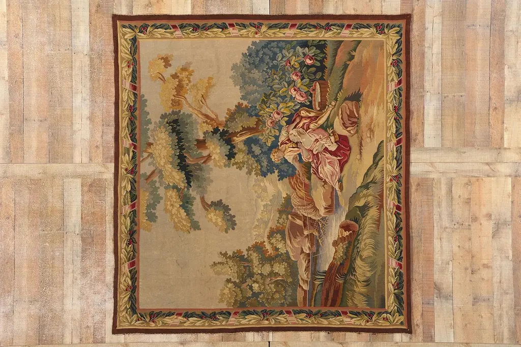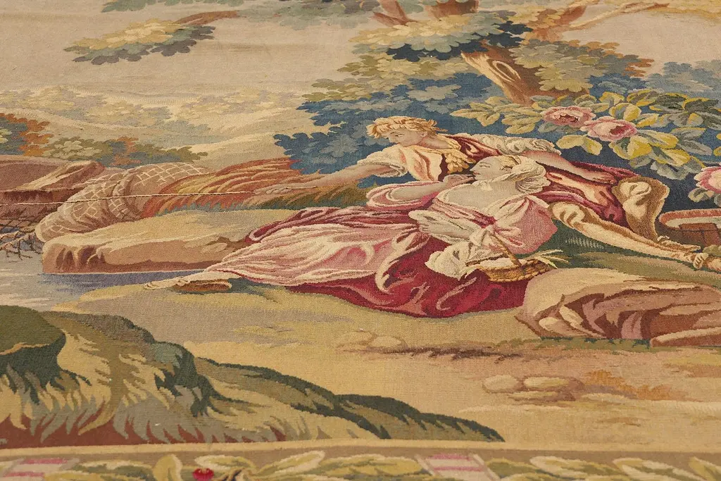 77257 Late 19th Century Antique French Aubusson Tapestry, 06'08 x 07'01. Woven with the soul of a bygone aristocracy, this handwoven antique French Aubusson tapestry is a singular treasure of cultivated legacy—an ultra-rare, one-of-a-kind heirloom reserved for the world’s most discerning collectors. A poetic homage to the romantic brushwork of François Boucher, this museum-caliber masterpiece conjures the very essence of 18th-century French elegance. In its pastoral composition, a pair of lovers lounge beside a crystalline stream beneath the dappled shade of ancient trees, their repose a meditation on cultivated leisure. The lake shimmers like liquid gold, wild roses bloom with painterly poise, and the atmosphere is hushed with the luxury of time slowed to perfection. This is not just a scene—it is a bespoke moment of elite escape, designed for connoisseurs who collect not for ornament, but for legacy.Framed by an opulent acanthus border, adorned with scrolling rinceaux, classical foliage, and regal pink ribbon motifs, this tapestry elevates its surroundings into a realm of editorial-level sophistication. The softly structured palette—soft blushes, celestial blue, antique gold, and romantic celadon—was selected not for spectacle, but for refined harmony, curated for interiors that whisper wealth through taste. This is the language of visionary curators and legacy investors, those who favor authentic luxury and archival value over trend-driven ornamentation. Each woven flourish echoes the sensibility of a haute couture atelier, where every detail is rendered with elite craftsmanship and ancestral memory.As golden light falls across its woven surface, the whimsical tapestry reveals its multi-layered brilliance—not painted, but breathed into life through the interlacing of wool, silk, and spirit. Its textures move with the grace of an oil painting, yet speak in the tactile language of textile connoisseurship. What unfolds is not merely a decorative story, but a narrative of permanence, of values carried forward through centuries. This is slow luxury at its most intimate—an ode to artistry, emotion, and rarity, wrapped in the heritage of France’s most treasured weaving tradition.To own this precious Aubusson is to enter a lineage of cultural guardianship—to acquire not just an object, but a voice in the dialogue between art and memory. It is a bespoke investment in distinction, one that graces Parisian salons, Hamptons retreats, and historic estates alike. This is not décor; it is a sacred inheritance, a quietly commanding artifact of identity, provenance, and purpose. In a world chasing the fleeting, this magnificent work of art is the ultimate statement of enduring elegance, a symbol of values that cannot be rushed or replicated—the new standard for meaningful luxury. Abrash. Desirable Age Wear. Handwoven wool. Made in France. Measures: 06'08 x 07'01.Date: 1890’s. Late 19th Century.