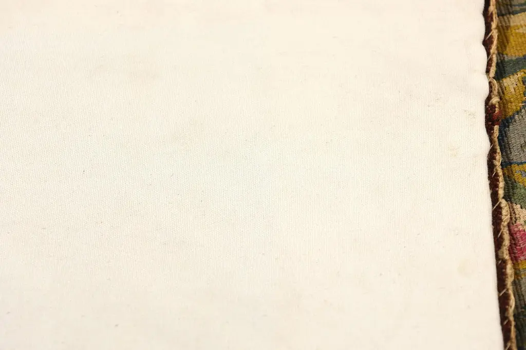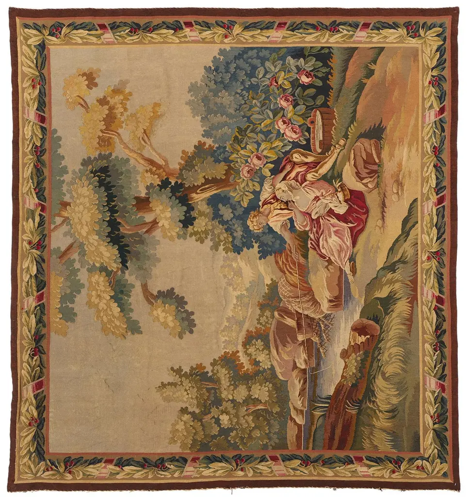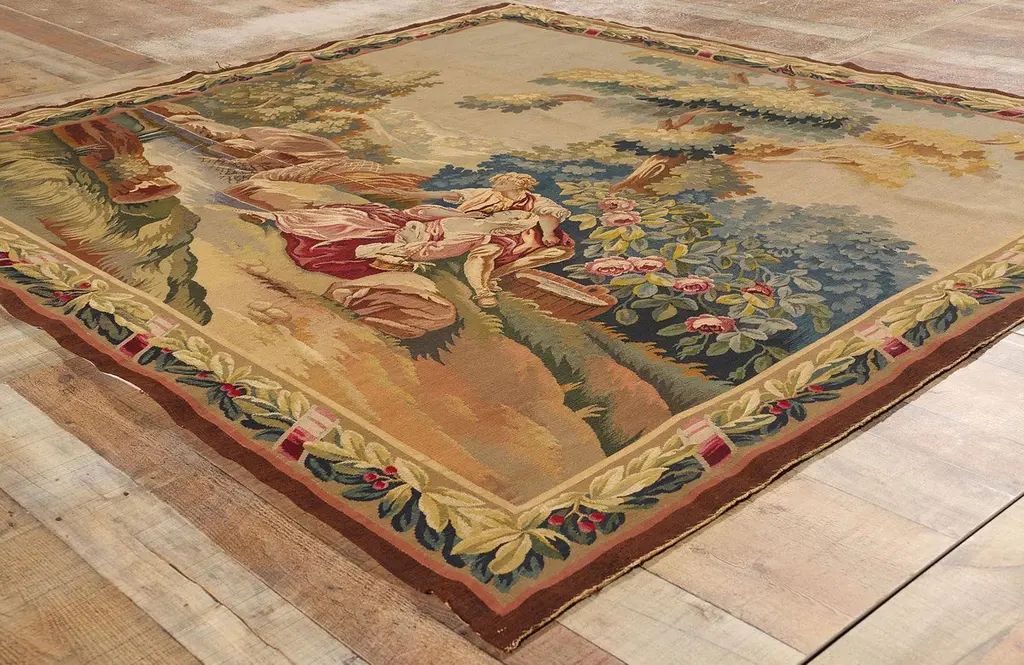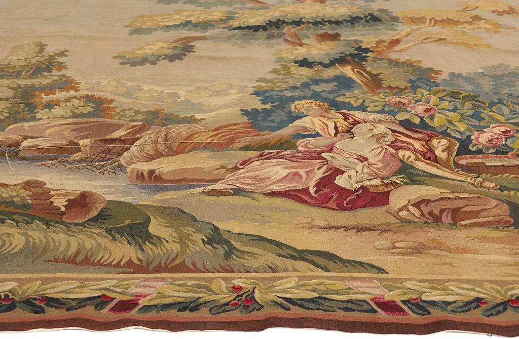 77257 Late 19th Century Antique French Aubusson Tapestry, 06'08 x 07'01. Woven with the soul of a bygone aristocracy, this handwoven antique French Aubusson tapestry is a singular treasure of cultivated legacy—an ultra-rare, one-of-a-kind heirloom reserved for the world’s most discerning collectors. A poetic homage to the romantic brushwork of François Boucher, this museum-caliber masterpiece conjures the very essence of 18th-century French elegance. In its pastoral composition, a pair of lovers lounge beside a crystalline stream beneath the dappled shade of ancient trees, their repose a meditation on cultivated leisure. The lake shimmers like liquid gold, wild roses bloom with painterly poise, and the atmosphere is hushed with the luxury of time slowed to perfection. This is not just a scene—it is a bespoke moment of elite escape, designed for connoisseurs who collect not for ornament, but for legacy.Framed by an opulent acanthus border, adorned with scrolling rinceaux, classical foliage, and regal pink ribbon motifs, this tapestry elevates its surroundings into a realm of editorial-level sophistication. The softly structured palette—soft blushes, celestial blue, antique gold, and romantic celadon—was selected not for spectacle, but for refined harmony, curated for interiors that whisper wealth through taste. This is the language of visionary curators and legacy investors, those who favor authentic luxury and archival value over trend-driven ornamentation. Each woven flourish echoes the sensibility of a haute couture atelier, where every detail is rendered with elite craftsmanship and ancestral memory.As golden light falls across its woven surface, the whimsical tapestry reveals its multi-layered brilliance—not painted, but breathed into life through the interlacing of wool, silk, and spirit. Its textures move with the grace of an oil painting, yet speak in the tactile language of textile connoisseurship. What unfolds is not merely a decorative story, but a narrative of permanence, of values carried forward through centuries. This is slow luxury at its most intimate—an ode to artistry, emotion, and rarity, wrapped in the heritage of France’s most treasured weaving tradition.To own this precious Aubusson is to enter a lineage of cultural guardianship—to acquire not just an object, but a voice in the dialogue between art and memory. It is a bespoke investment in distinction, one that graces Parisian salons, Hamptons retreats, and historic estates alike. This is not décor; it is a sacred inheritance, a quietly commanding artifact of identity, provenance, and purpose. In a world chasing the fleeting, this magnificent work of art is the ultimate statement of enduring elegance, a symbol of values that cannot be rushed or replicated—the new standard for meaningful luxury. Abrash. Desirable Age Wear. Handwoven wool. Made in France. Measures: 06'08 x 07'01.Date: 1890’s. Late 19th Century.