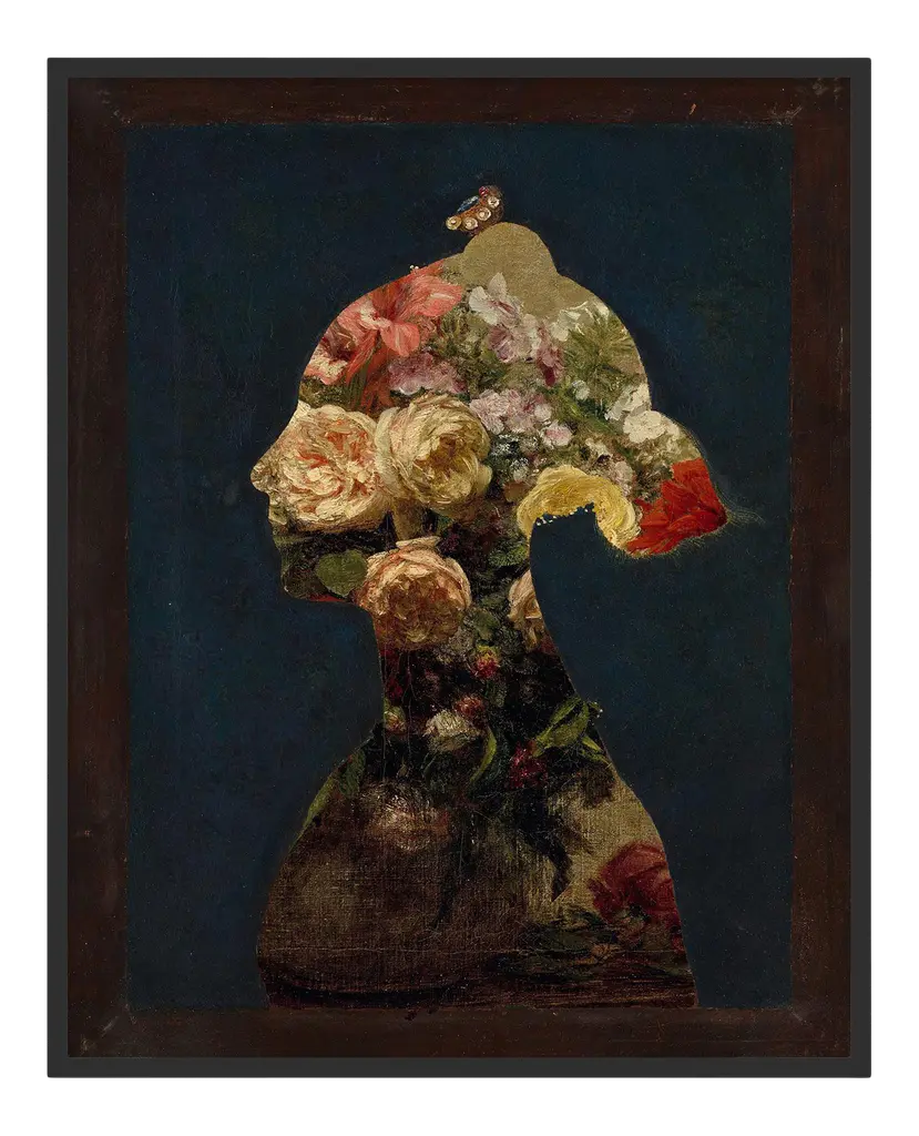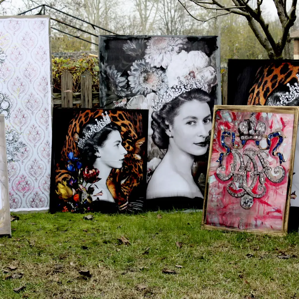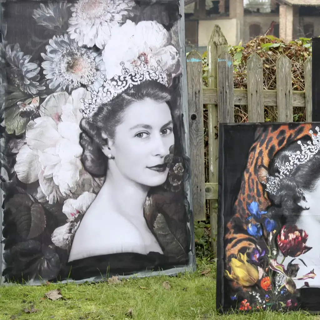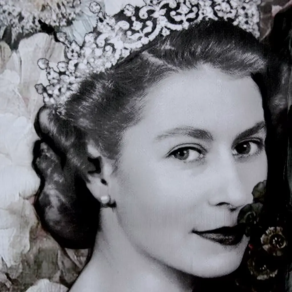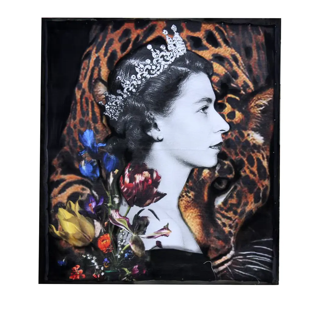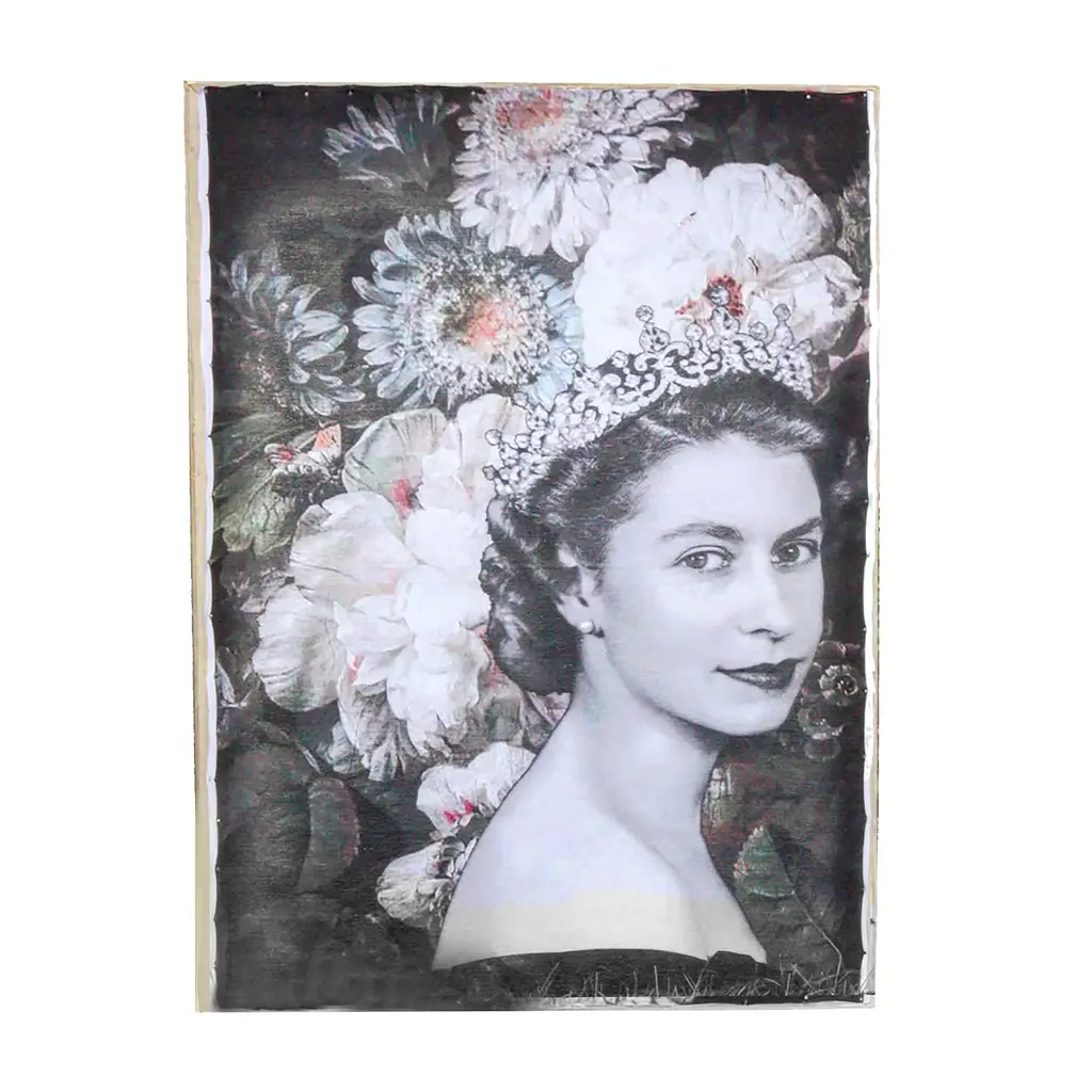 A splendid artisan-crafted work of art by Barbara Petecca, this tapestry will add a distinctively unconventional character to an eclectic interior. Fixed on a rough wooden canvas, its printed fabric features a black and white portrait of young Queen Elizabeth II. Finished with hand-painted details in acrylic colors, any variation from the pictured item is part of its handmade nature.