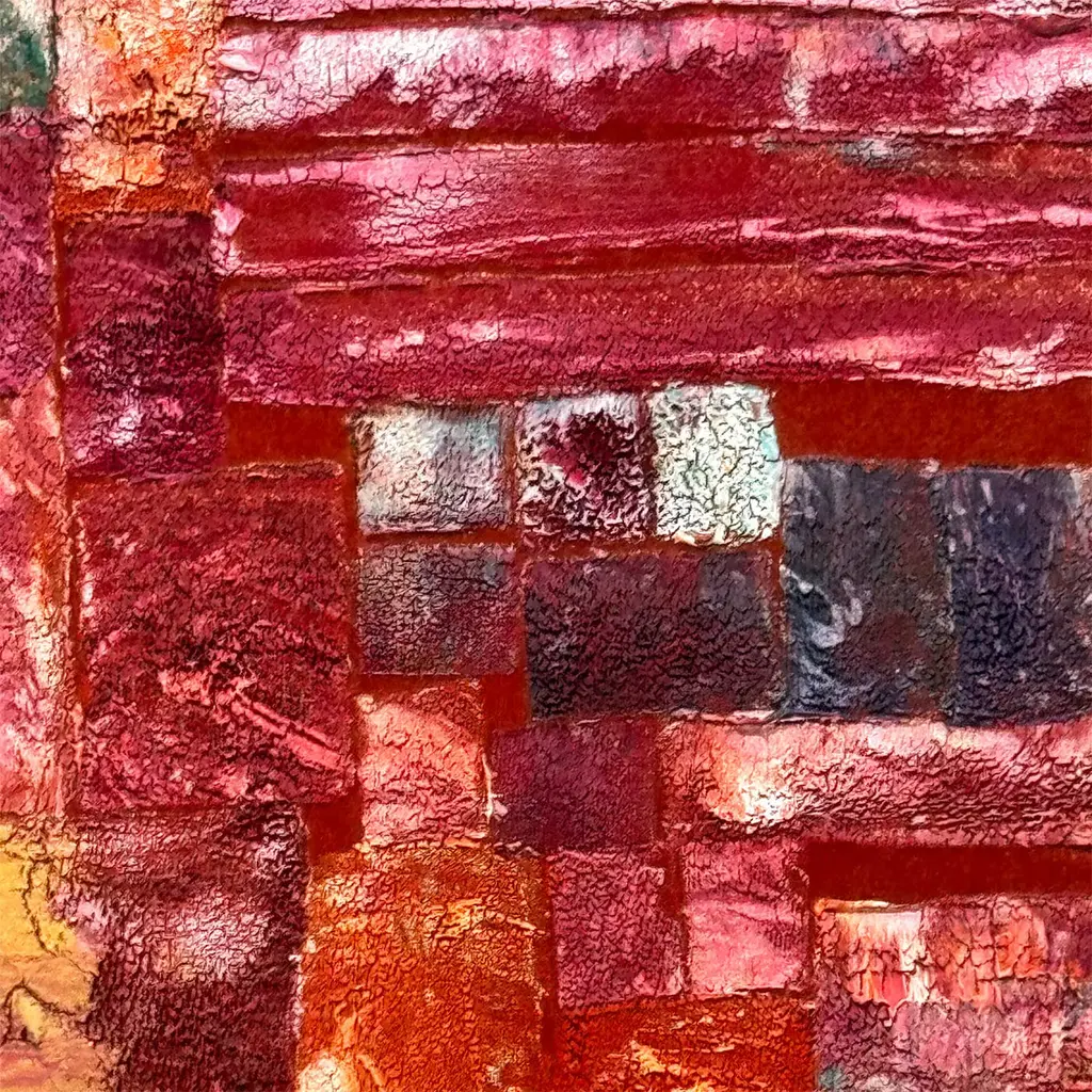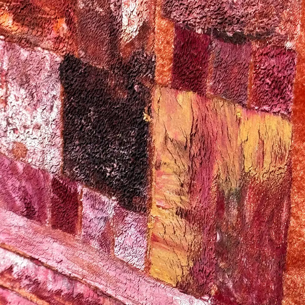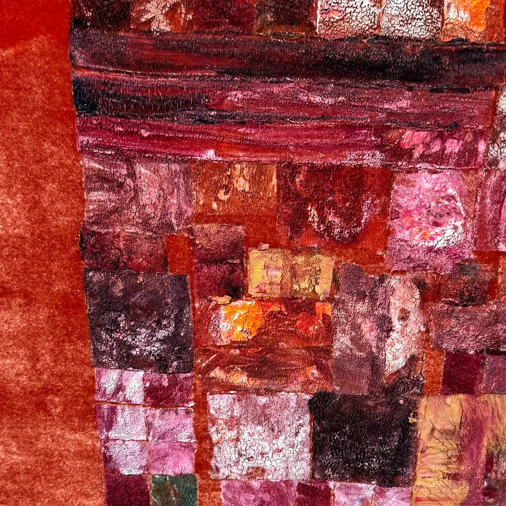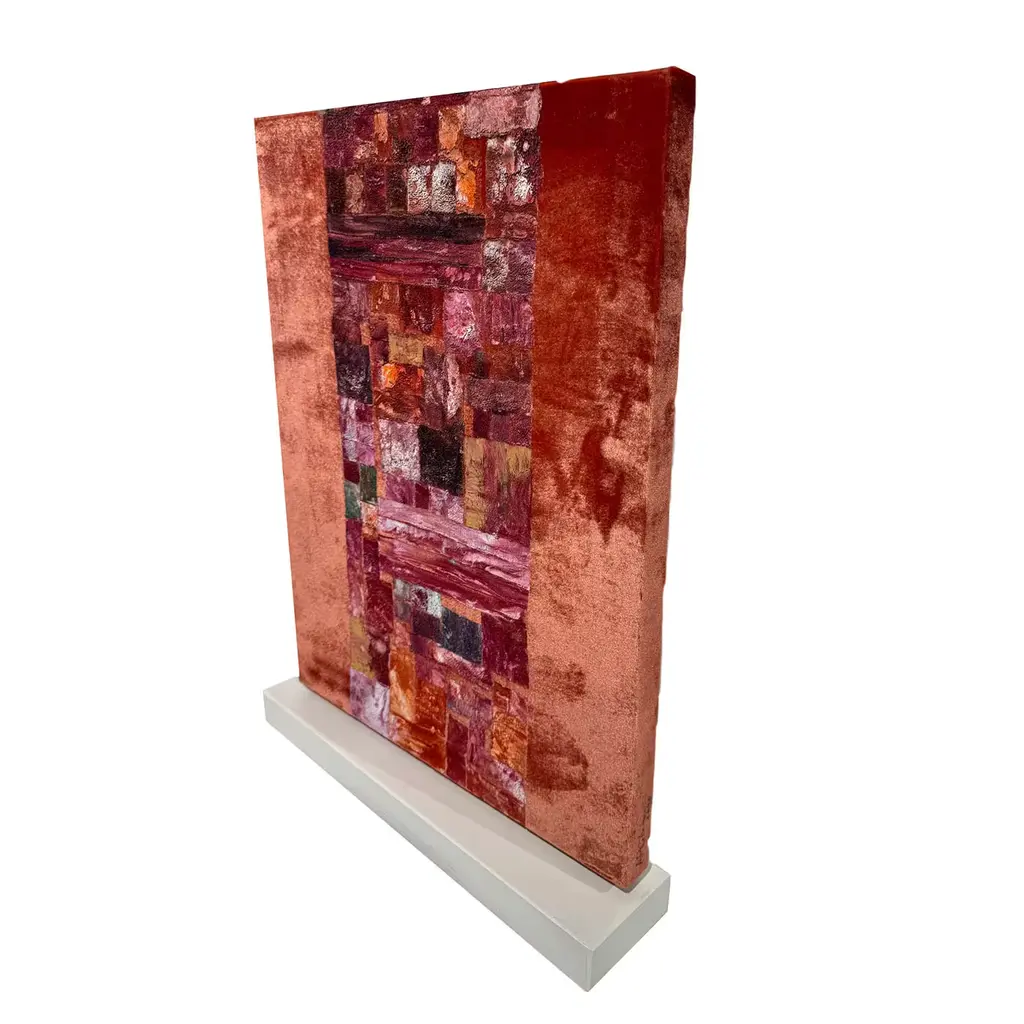 Created on silk velvet, this small tapestry is dyed with natural red pigments and painted with colored pastes to achieve a deep, intense chromatic effect. The artist's unique technique produces a sophisticated three-dimensional appearance. When displayed on a pedestal, it transforms into a sculptural piece, offering a versatile artistic presence.