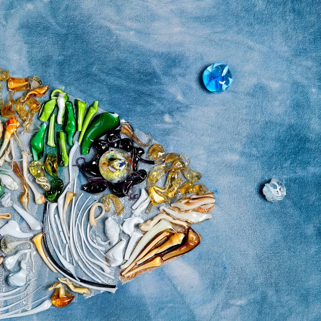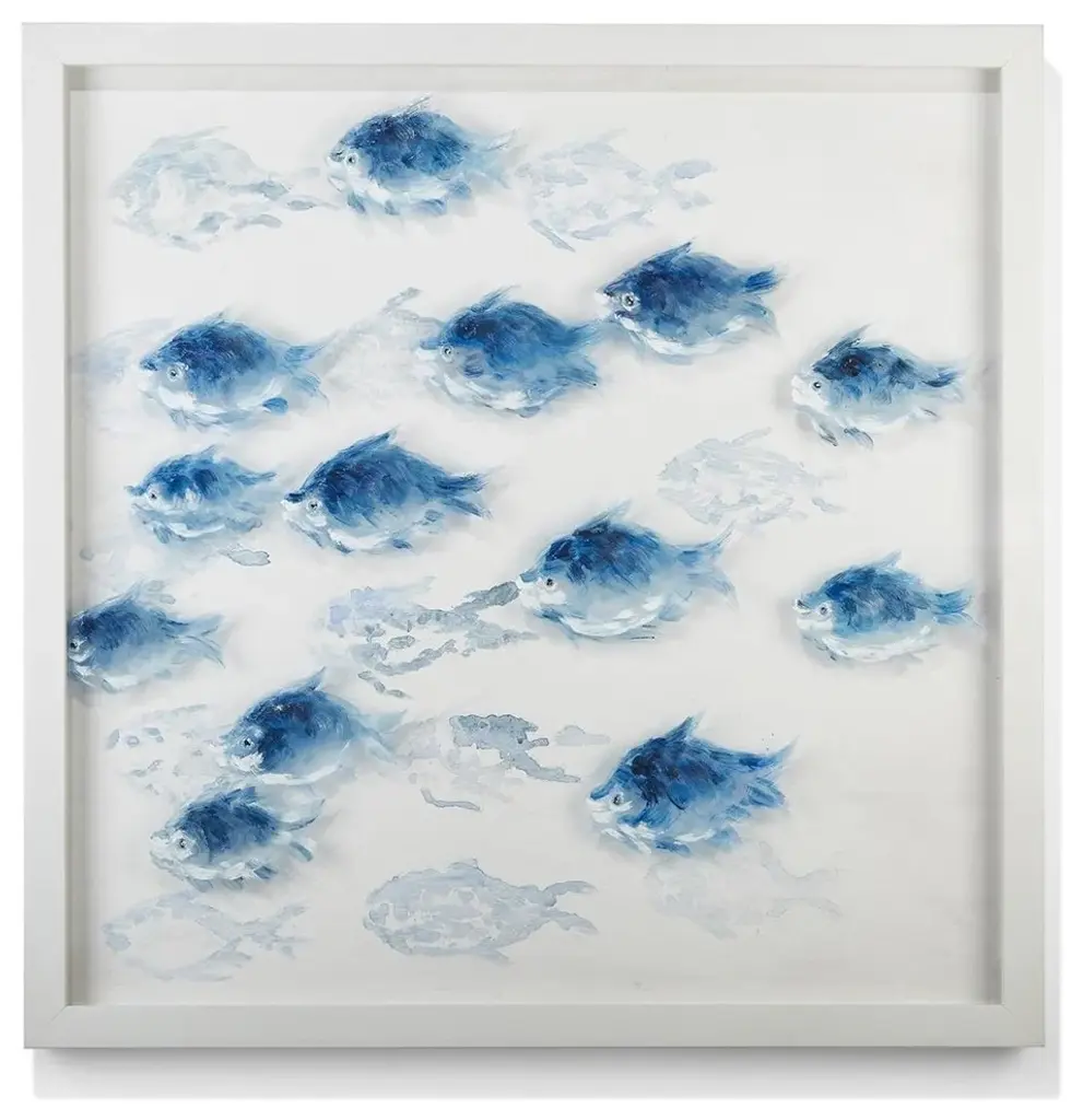 Named after the Italian words for "glass sand steenbras", this tapestry is a refined and unique objet d'art exhibited at the Venice Biennale. Part of the Velvet Lagoon Project, it is fashioned of silk velvet dyed with pigments of azure and cornflower blue, and painted by hand with color pastes depicting a sand steenbras adorned with colorful mouth-blown Murano glass details of strong visual and textural value. The tapestry is assembled on a wooden frame.