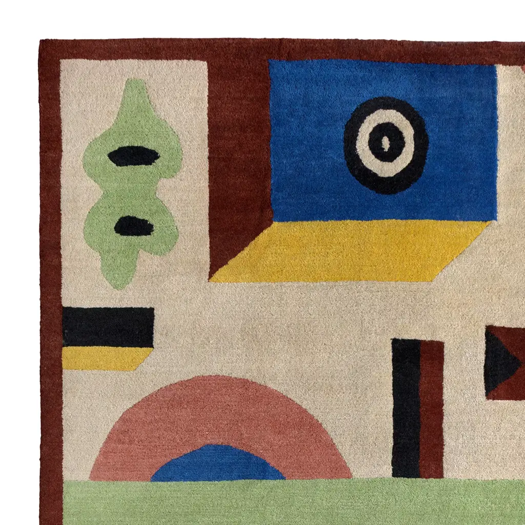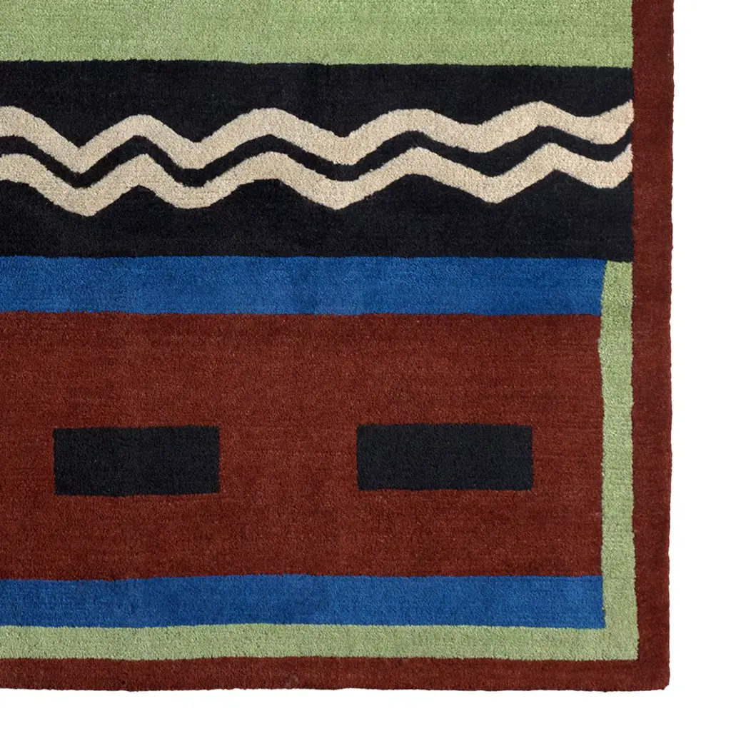 Designed by Nathalie Du Pasquier and executed in Nepal by expert artisans, this carpet is part of a series of 36 pieces that, due to their handmade preparation, might slightly vary from each other. Every one-of-a-kind piece boast rich colors and a modern decorative pattern and was crafted entirely by hand, including the preparation and dying of the Tibetan wool which was hand-knotted and mixed with cotton. Handmade by craftsmen in Uma technique. 20 Carpets Collection.