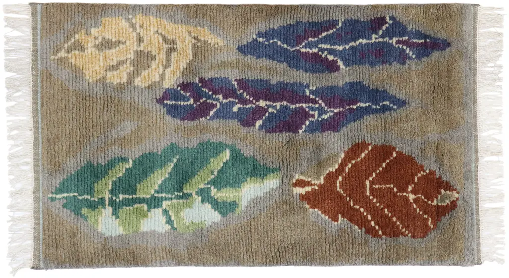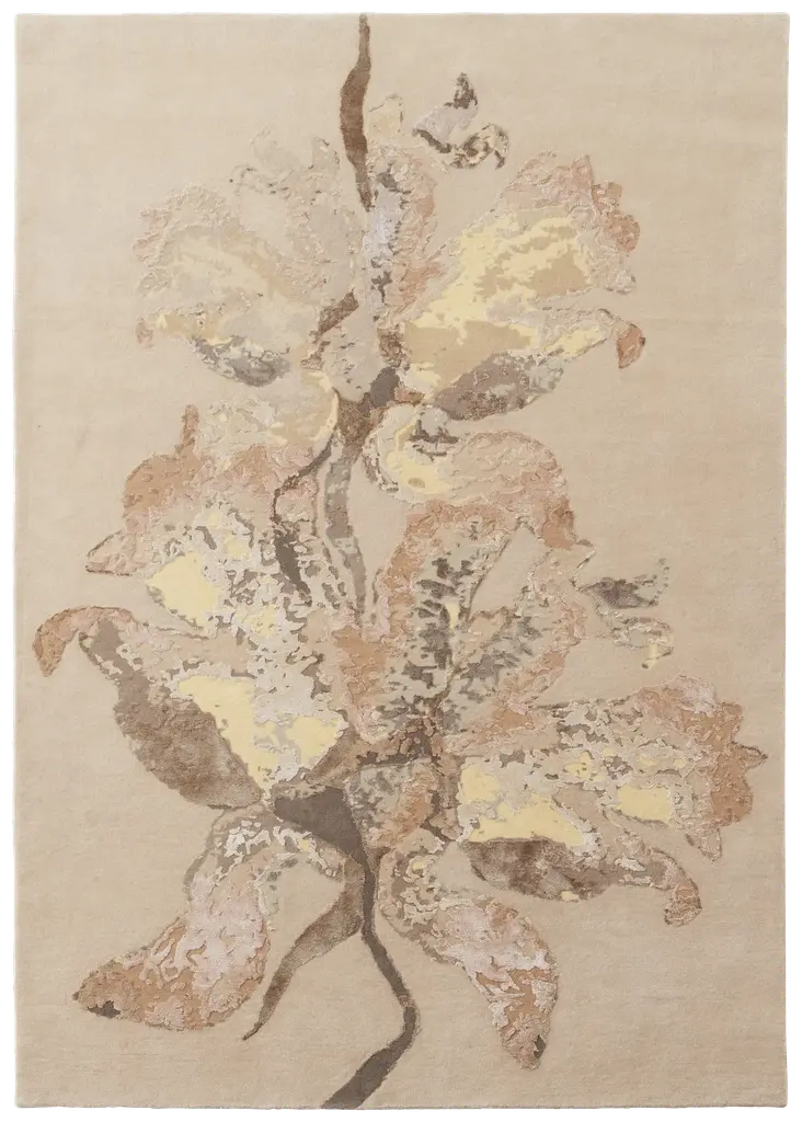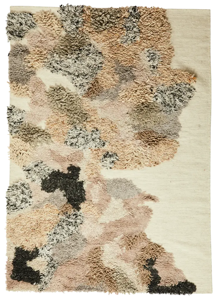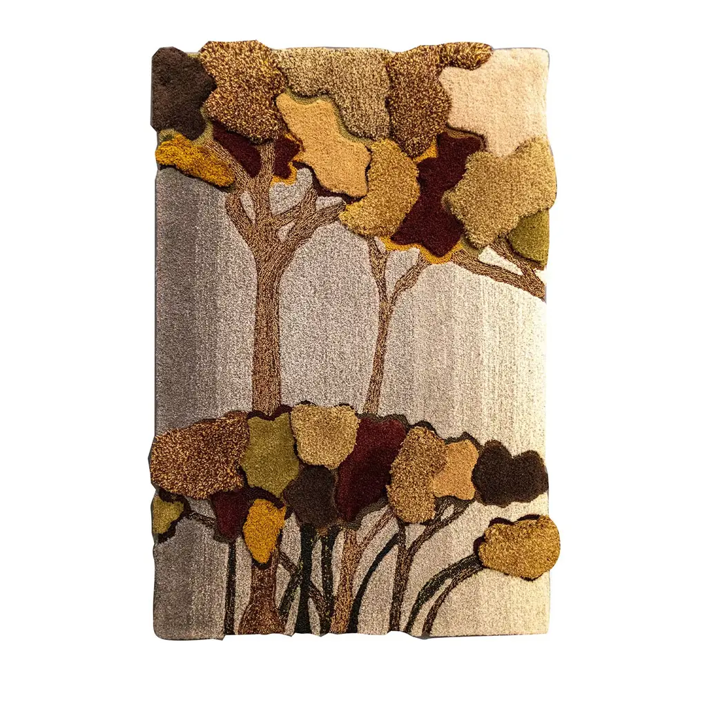 The design for the tapestry 'Pine Tree Family' was made by the artist on the basis of the pictures taken during her frequent walks around Florence. The pine tree, so characteristic for this area, are among the trees she most admires for the wonderful forms of their branches and tops. It's a delicate tree that suffers from the recent climate changes and whose numbers are decreasing. This tapestry is hand-tufted and embroidered on canvas, with New Zealand wool and fine Italian yarns.