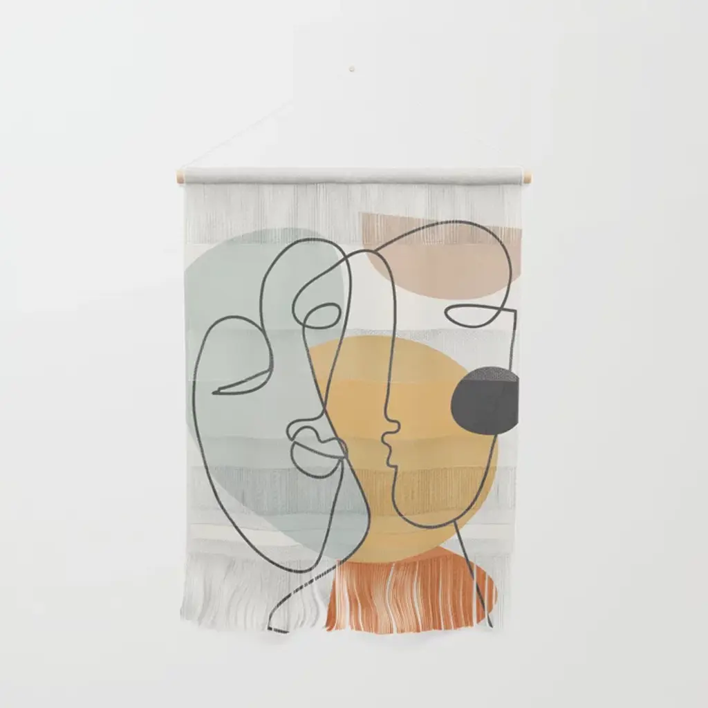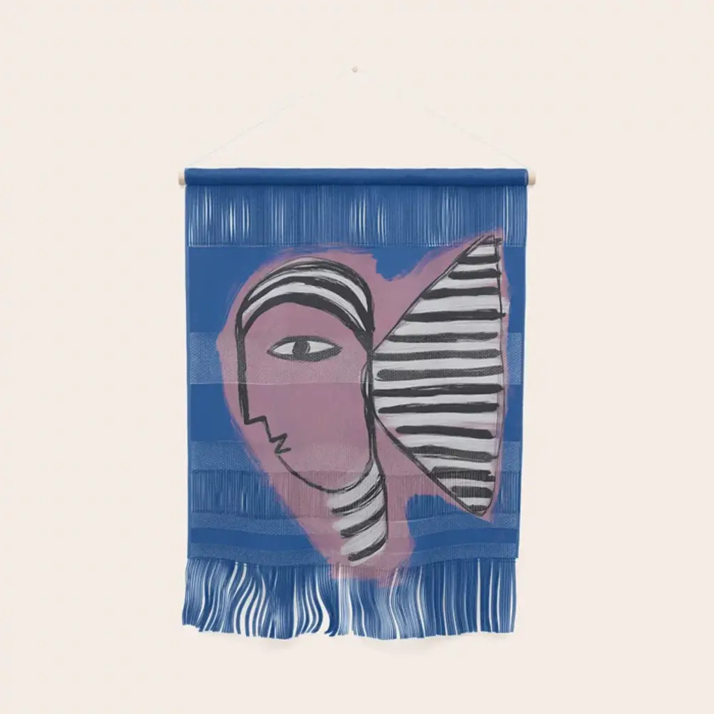 Sibylle Collection, the first collaboration between Studiopepe and Once Milano, is a celebration of the senses viewed as precious tools for exploring and interpreting reality. The frame of this wall hanging is reminiscent of tree bark and supports fabrics with textures that are both strong and soft — fabrics on which irregular brushstrokes are inextricably intertwined with wool threads that speak of femininity. The wall hanging is made in printed heavy-weight linen with wool embroidery supported by an iron bar.