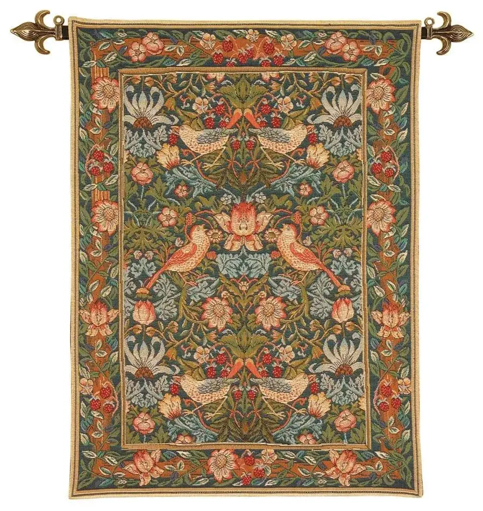 This design was produced by Morris & Co at Merton Abbey, Surrey, in 1883. The intricate design was created by William Morris, with the birds probably being drawn by Philip Webb. It was inspired by a real-life problem one which is familiar to many gardeners. In his garden at Kelmscott Manor, Morris tried to grow strawberries, but found that these were always being eaten by greedy thrushes who managed to creep under the netting. Morris allowed them to do so enjoying their efforts to remove the strawberries. Recalling their attempts, he designed this remarkable furnishing textile pattern, taken directly from the natural world. The gentle humour in this pattern helped to make it one of Morriss most successful creations. This beautiful tapestry is woven on a jacquard loom by skilled weavers, keeping alive the centuries old tradition of tapestry manufacturing from generation to generation. This tapestry is fully lined incorporating a sleeve along the top for hanging with a Hines hanging rod. Alternatively, this tapestry can be hung with a wooden batten which is a concealed method of hanging. Composition: 80% cotton, 16% viscose, 4% polyester Finish on reverse: This tapestry is fully backed with luxury cotton lining incorporating a sleeve along the top for hanging purposes. See Hanging Options below for more information.
