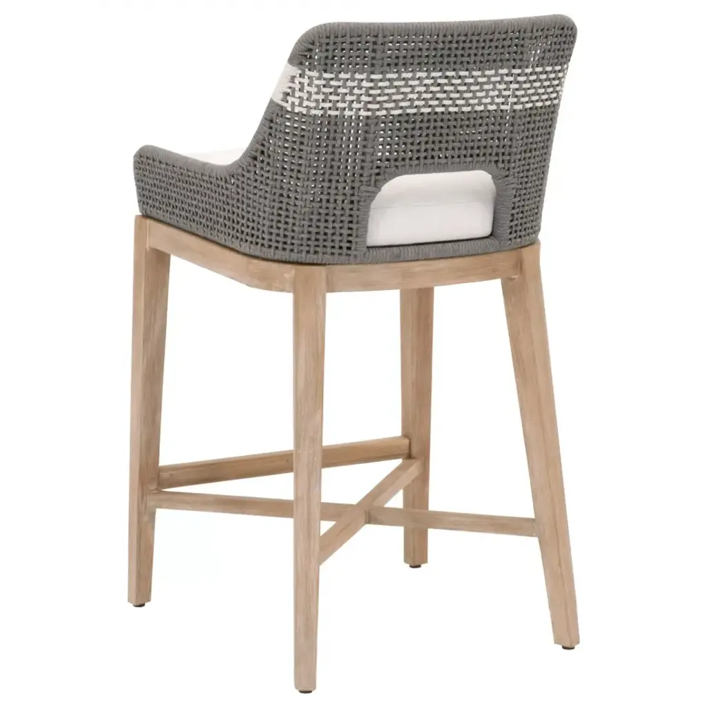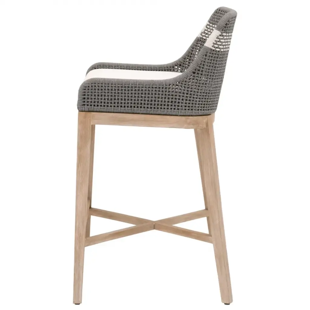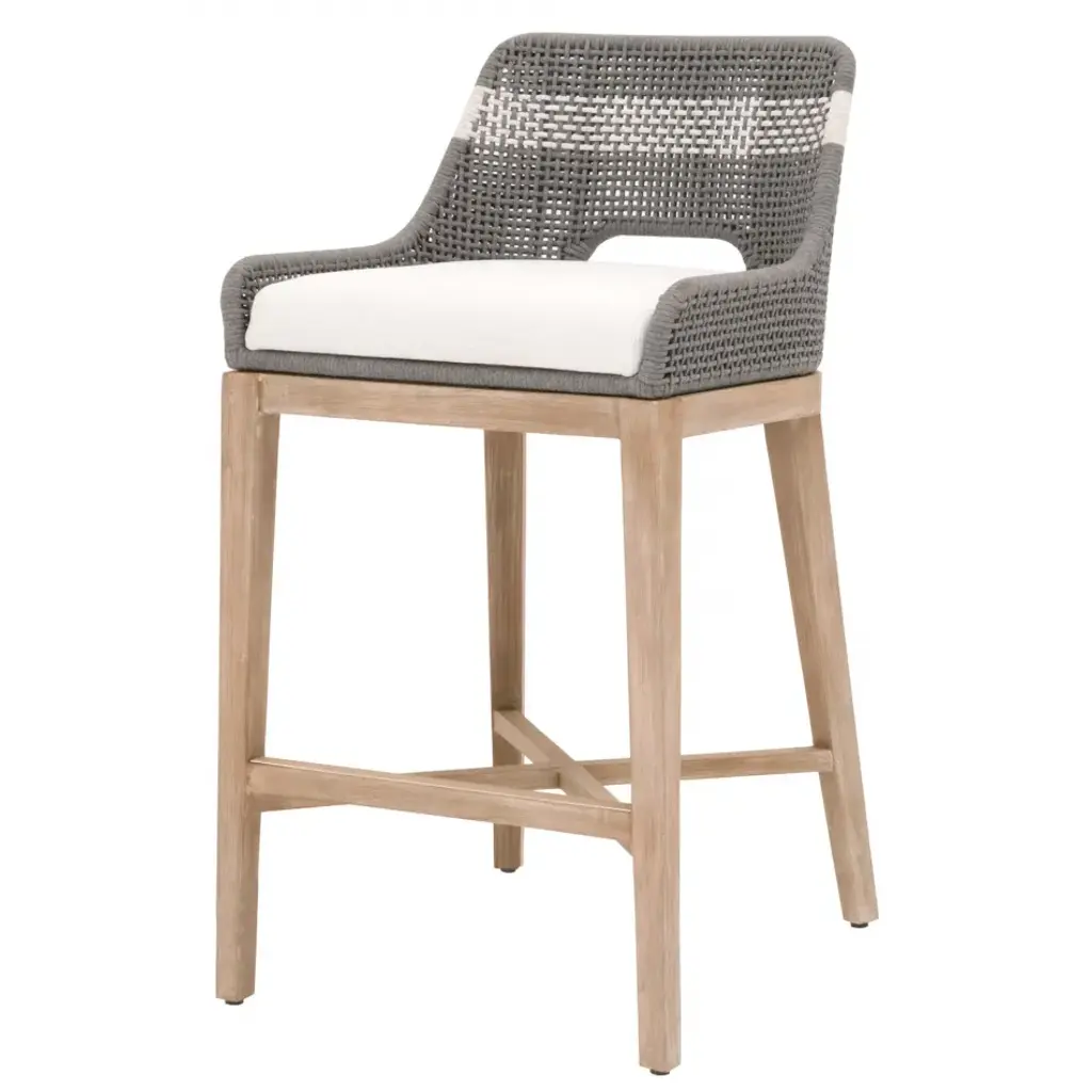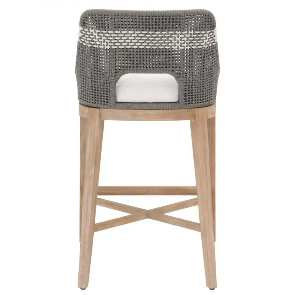 This woven barstool will add a touch of coastal style to your kitchen, bar or dining room. Constructed with a stainless steel frame and solid mahogany legs, this stool is not only sturdy, but durable. A rich dove colored rope is tightly woven with an eye-catching solid white speckle stripe interwoven at the center of the seat back. The mahogany legs feature crossed leg stretchers, a front foot rest, and a beautiful distressed natural gray finish. Paired with an upholstered seat cushion affixed to the base, the stool provides comfort with style and will be the perfect addition to any transitional or traditional dining room or bar.