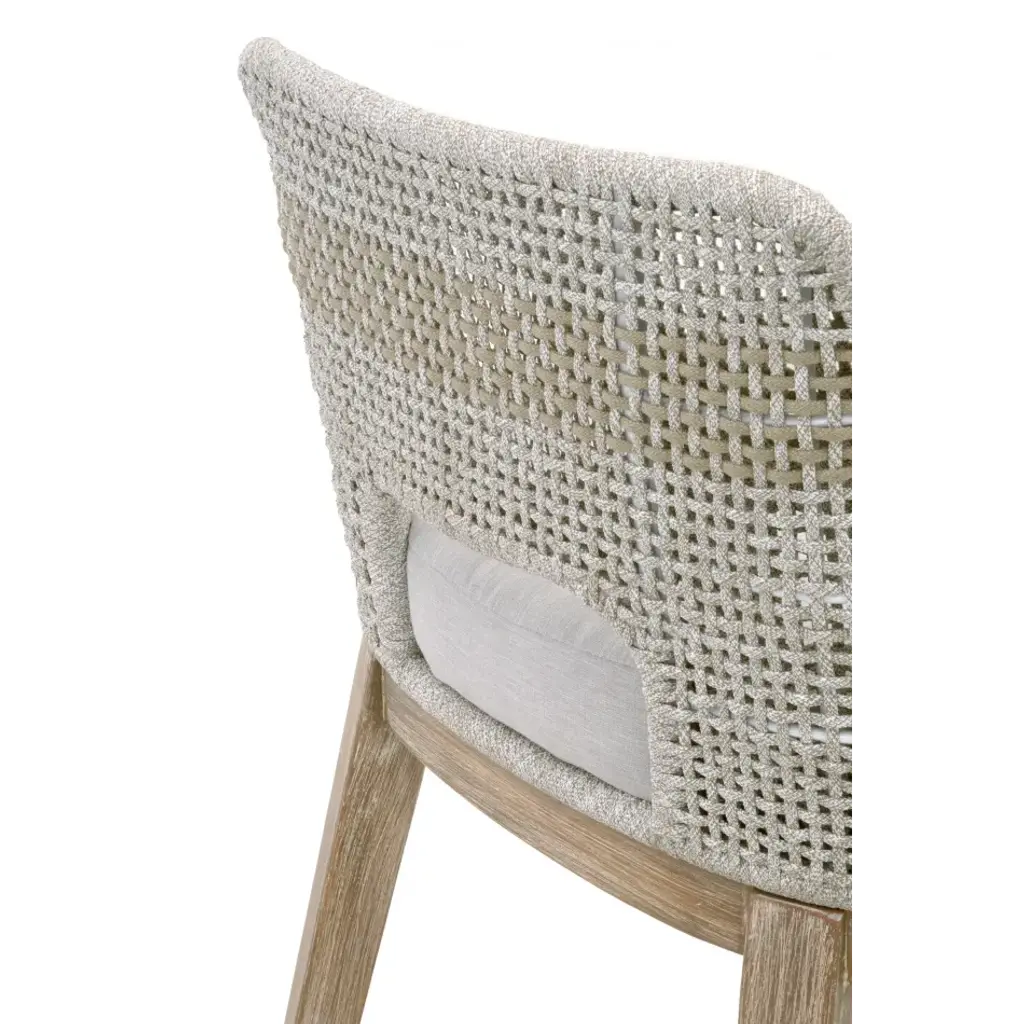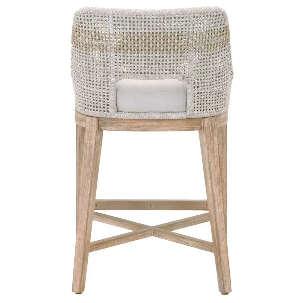 This woven counter stool will add a touch of coastal style to your kitchen, bar or dining room. Constructed with a stainless steel frame and solid mahogany legs, this stool is not only sturdy, but durable. A rich taupe and white colored rope is tightly woven with an eye-catching solid taupe stripe interwoven at the center of the seat back. The mahogany legs feature crossed leg stretchers, a front foot rest, and a beautiful distressed natural gray finish. Paired with an upholstered seat cushion affixed to the base, the stool provides comfort with style and will be the perfect addition to any transitional or traditional dining room or bar.