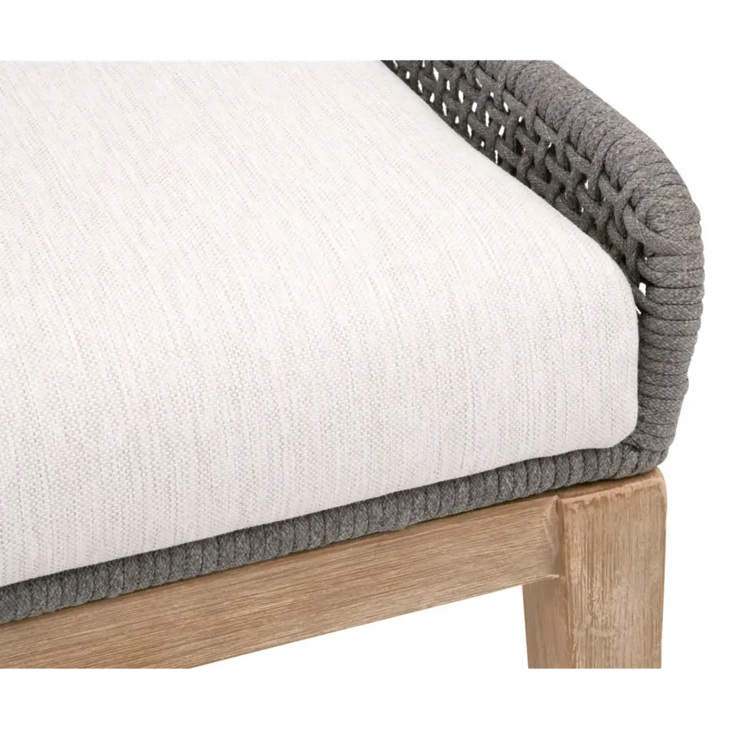 These woven side chairs will add a touch of coastal style to your kitchen or dining room. Constructed with a steel frame and solid mahogany legs, these dining chairs are not only sturdy, but durable. A rich dove colored rope is tightly woven with an eye-catching solid white speckle stripe interwoven at the center of the seat back. The mahogany legs feature a beautiful distressed natural gray finish. Paired with an upholstered seat cushion affixed to the base, the chairs provide comfort with style and will be the perfect addition to any transitional or traditional dining room.