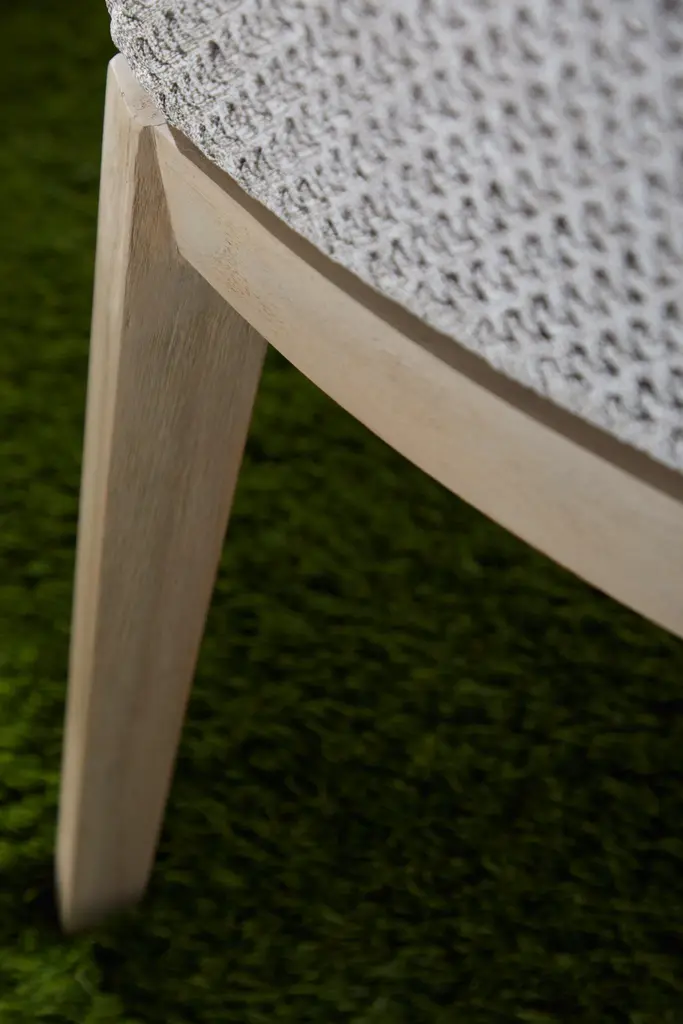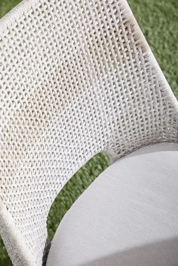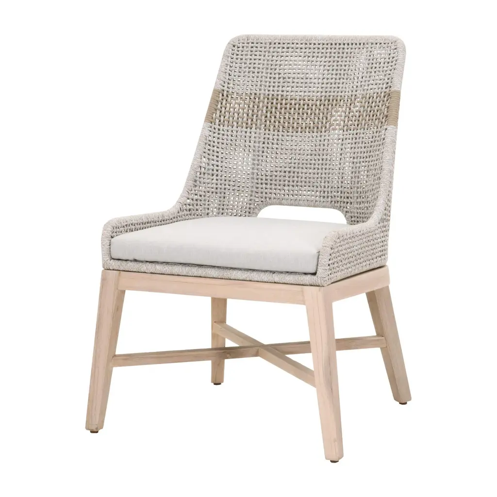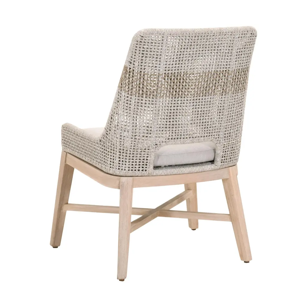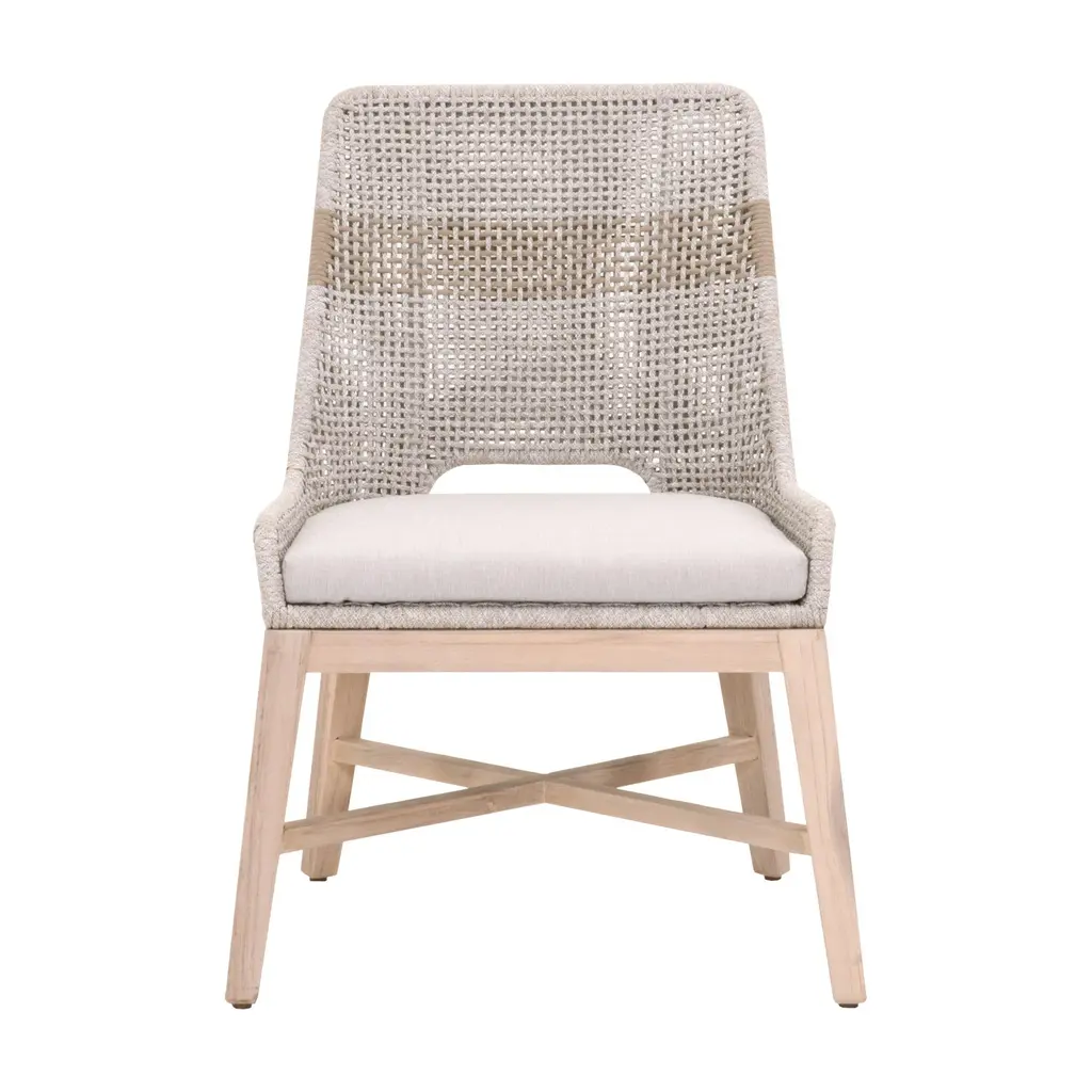 These woven outdoor dining chairs will add a touch of coastal style to your backyard or patio. Constructed with a stainless steel frame and solid gray teak legs, these side chairs are not only sturdy, but durable for outdoor use. A rich taupe and white colored rope is tightly woven with an eye-catching solid taupe stripe interwoven at the center of the seat back. The gray teak legs feature crossed leg stretchers and a beautiful wood grain finish. Paired with a removable all-weather seat cushion, the chairs provide comfort with style and will be the perfect addition to any outdoor space.