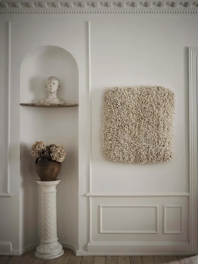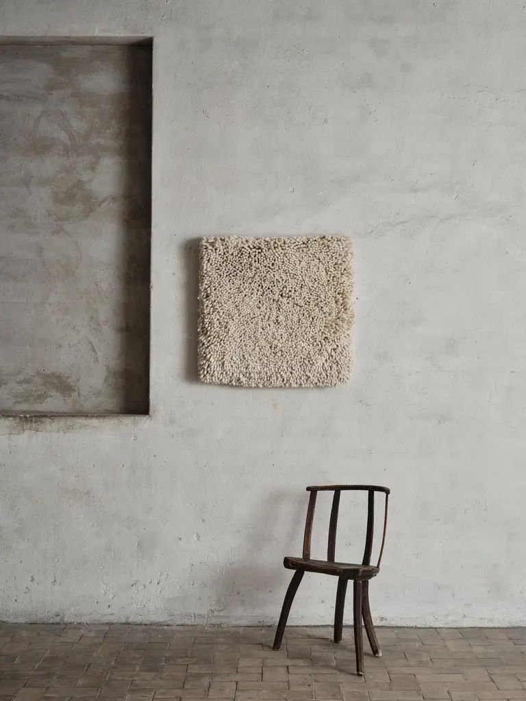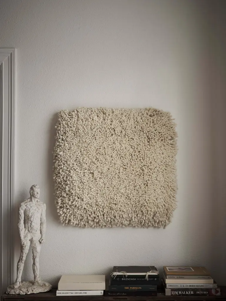 Tapestry no.02 by Cappelen DimyrDimensions: D70 x H70 cmMaterials: 85% wool 15% cottonTapestry no.02 is the purest form of bold minimalism. The simple square shape is contrasted with the bold and chunky pile height that creates a three dimensional expression on the wall.Wooden rings are attached on the back of the product for hanging.Construction: Hand knotted and woven. Please contact us.Cappelen Dimyr is a creative collective based in Copenhagen, passionate about creating contemporary artisanal rugs and tapestries in the finest natural fibers, handcrafted by specialists in India using traditional techniques. The world of Cappelen Dimyr is significantly bohemian, warm and artistic with a clear DNA – conscious, crafted and personal.The point of view is an interpretation of slow luxury with each object carefully designed and produced to stand the test of time.Cappelen Dimyr launched the first chapter of rugs in the autumn of 2019 and now offers both rugs and tapestries, available online and with carefully selected retailers worldwide.