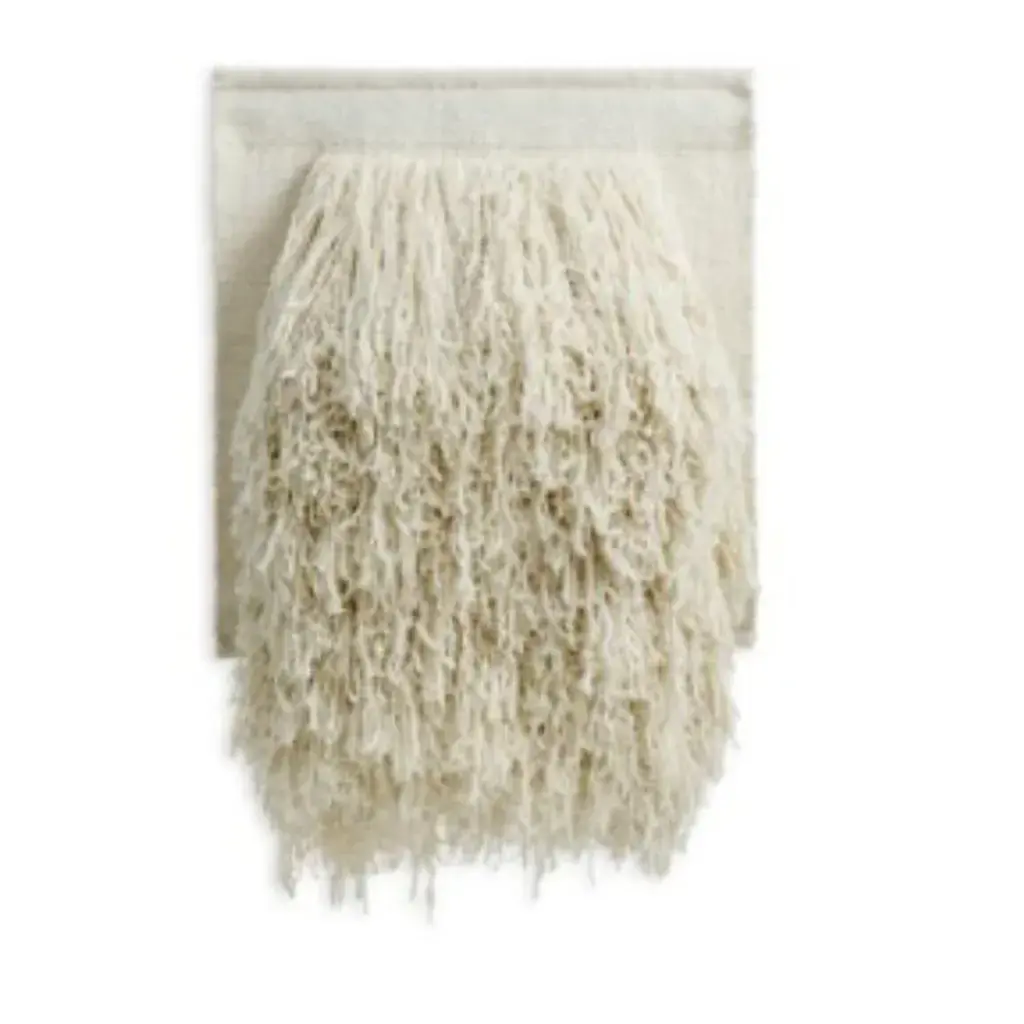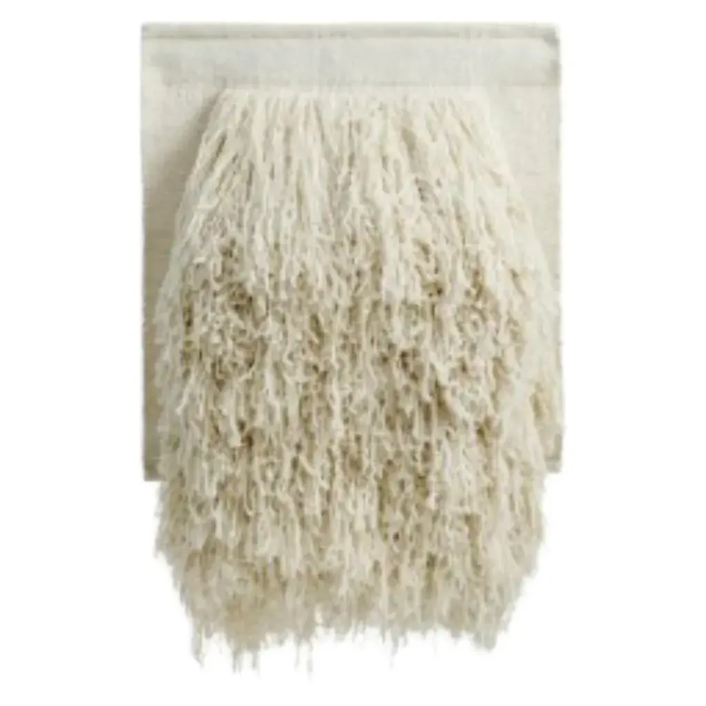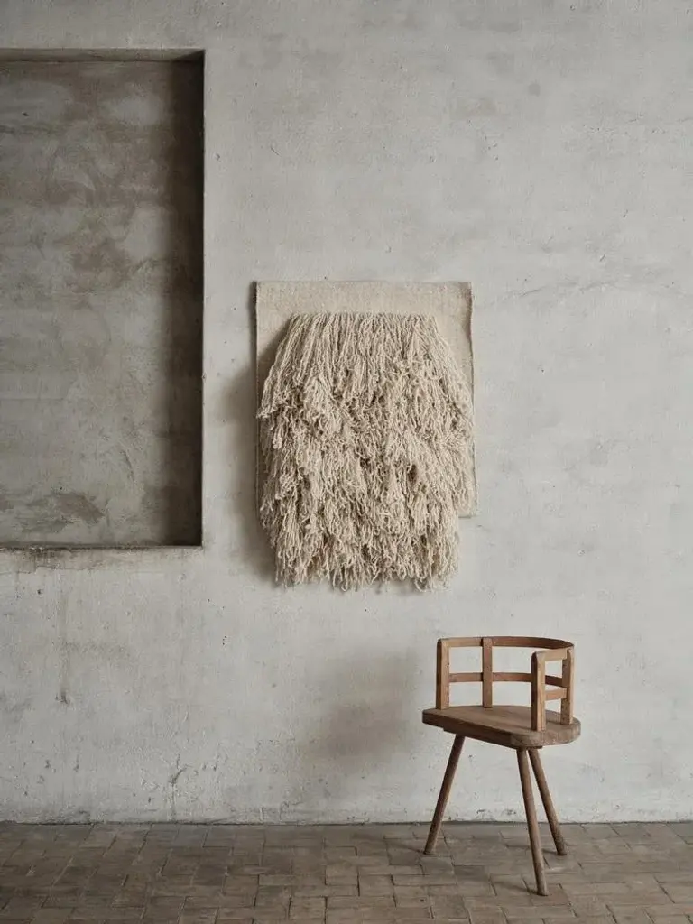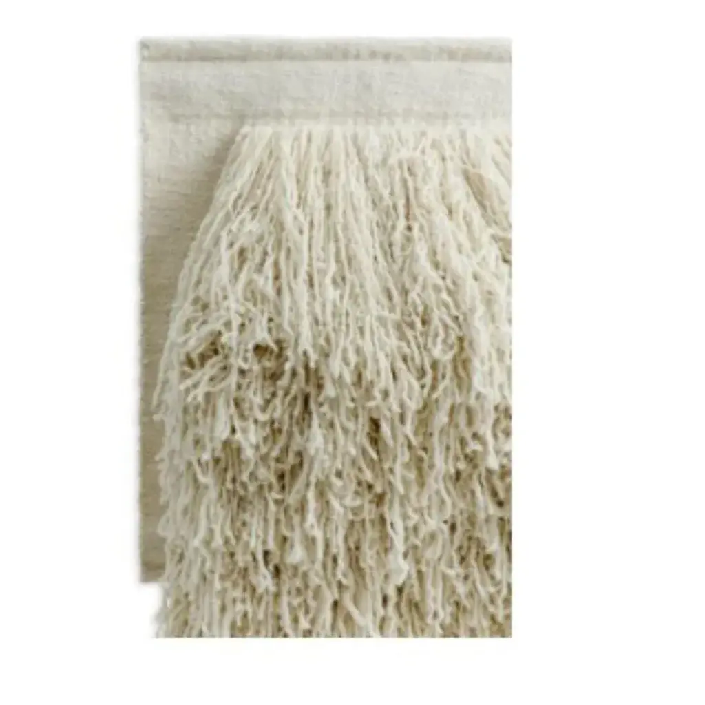 Tapestry no.04 by Cappelen Dimyr Dimensions: D85 x H95 cm Materials: 85% wool 15% cotton Tapestry no.04 is an expressive wall piece, perfectly balancing soft and bold. Its long handspun yarn in natural white New Zealand wool lends the piece a tactility that makes it stand out; literally and metaphorically. It is an avantgarde interpretation of traditional textile art – handcrafted and unique. The piece is hung using Sheesham wood planks, inserted in pockets on the flat weaved backing. Sheesham, one of the most durable and sustainable woods, is a native to India, where the tapestries are handcrafted. Please contact us. Cappelen Dimyr is a creative collective based in Copenhagen, passionate about creating contemporary artisanal rugs and tapestries in the finest natural fibers, handcrafted by specialists in India using traditional techniques. The world of Cappelen Dimyr is significantly bohemian, warm and artistic with a clear DNA – conscious, crafted and personal. The point of view is an interpretation of slow luxury with each object carefully designed and produced to stand the test of time. Cappelen Dimyr launched the first chapter of rugs in the autumn of 2019 and now offers both rugs and tapestries, available online and with carefully selected retailers worldwide.