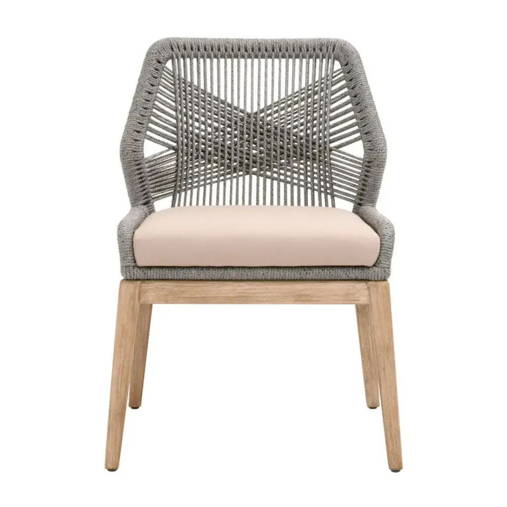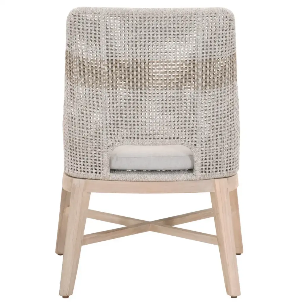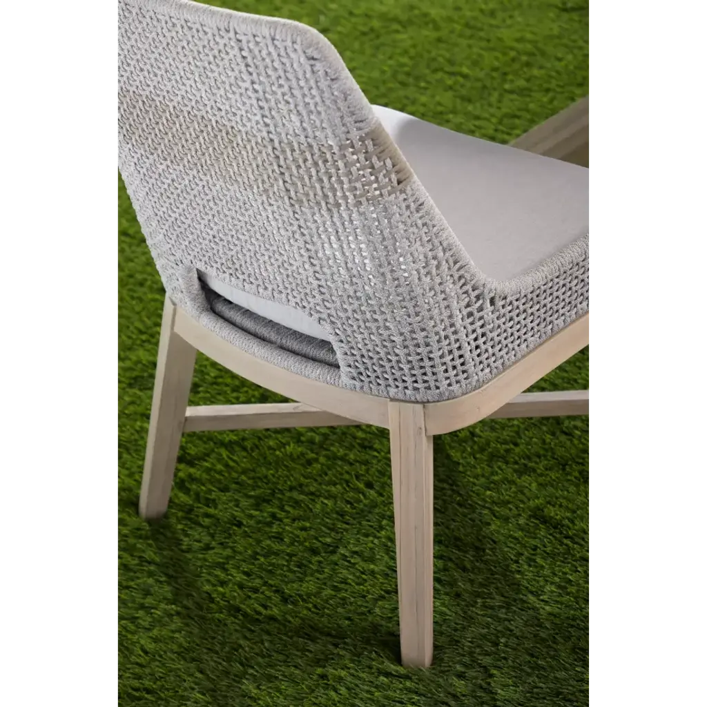 These woven outdoor dining chairs will add a touch of coastal style to your backyard or patio. Constructed with a stainless steel frame and solid gray teak legs, these side chairs are not only sturdy, but durable for outdoor use. A rich taupe and white colored rope is tightly woven with an eye-catching solid taupe stripe interwoven at the center of the seat back. The gray teak legs feature crossed leg stretchers and a beautiful wood grain finish. Paired with a removable all-weather seat cushion, the chairs provide comfort with style and will be the perfect addition to any outdoor space.