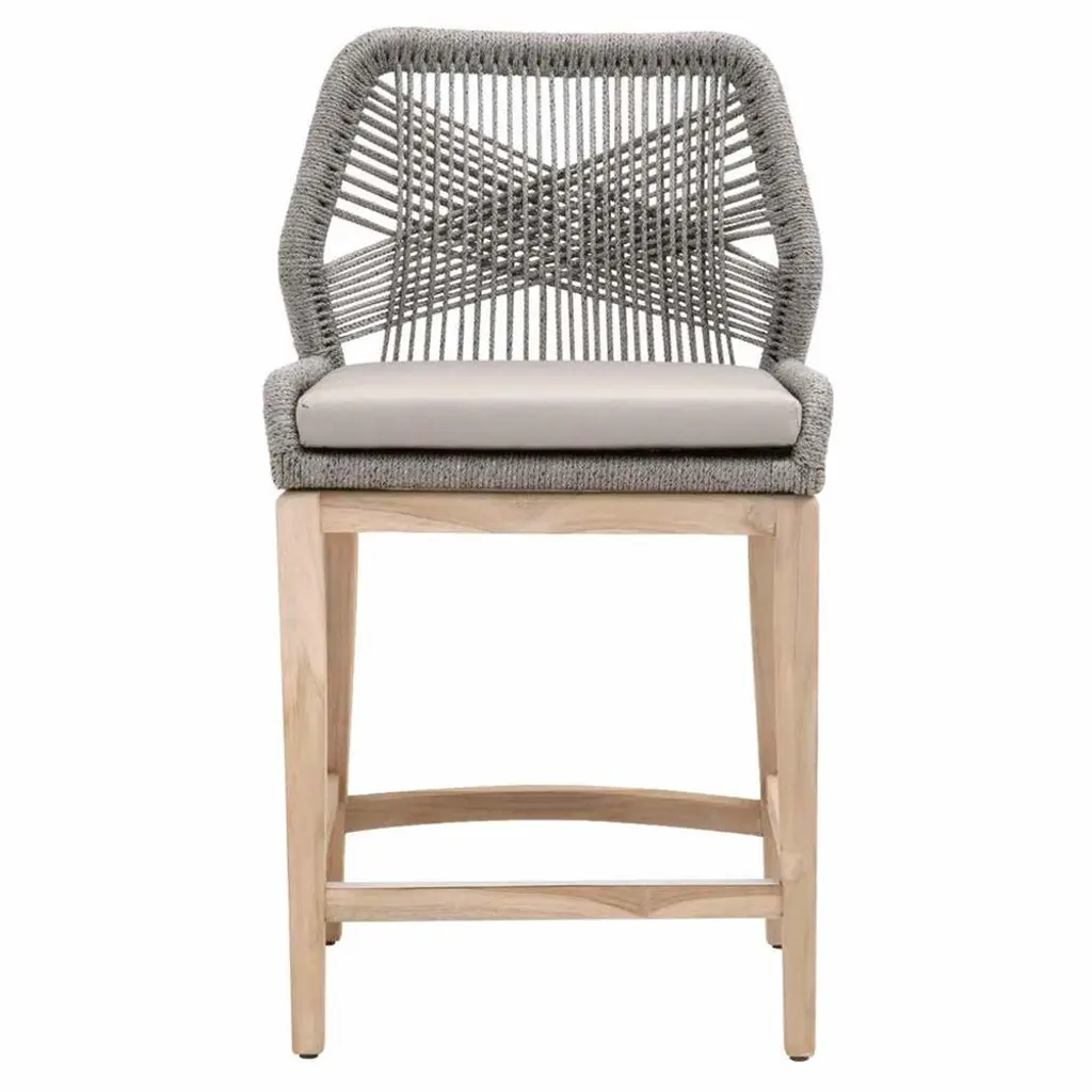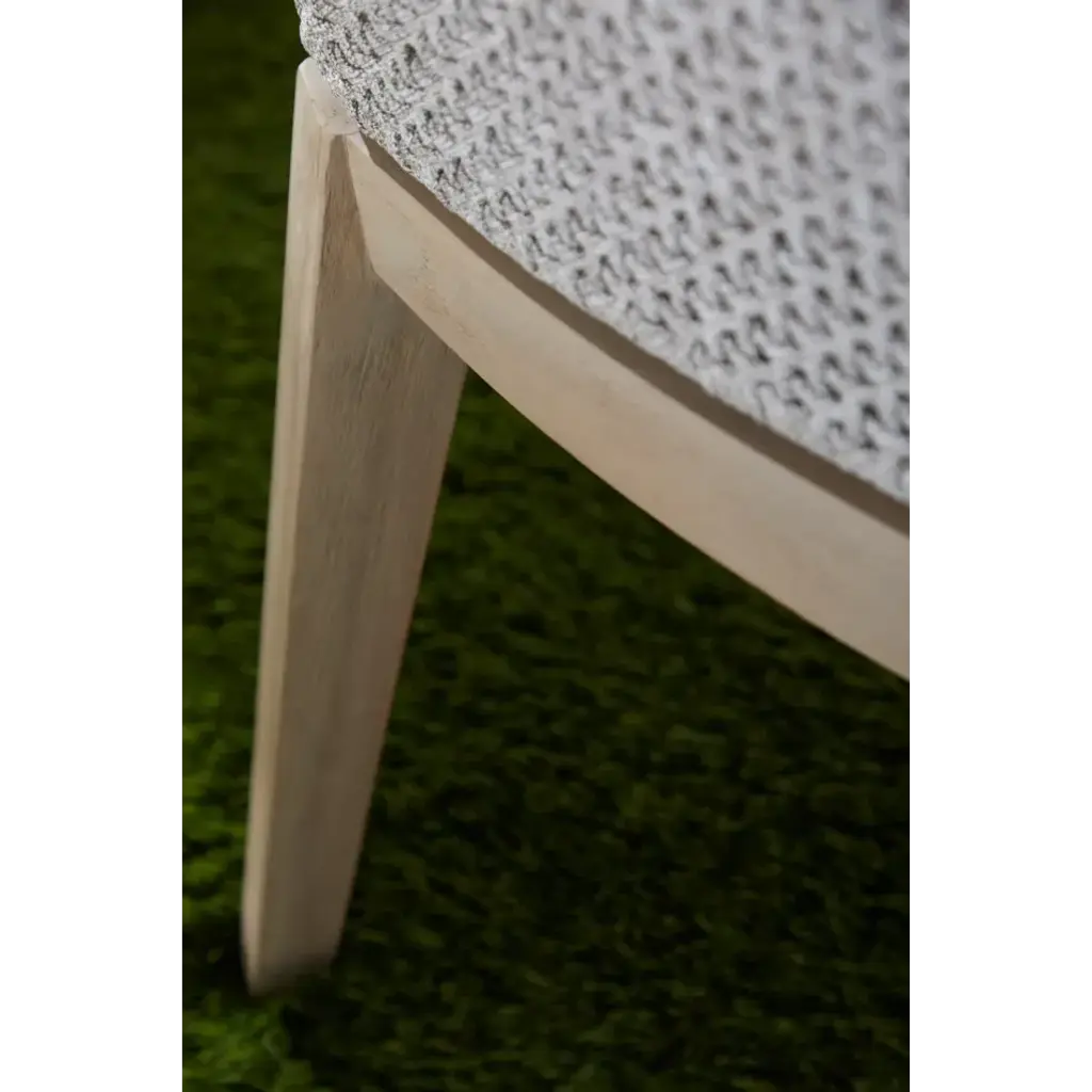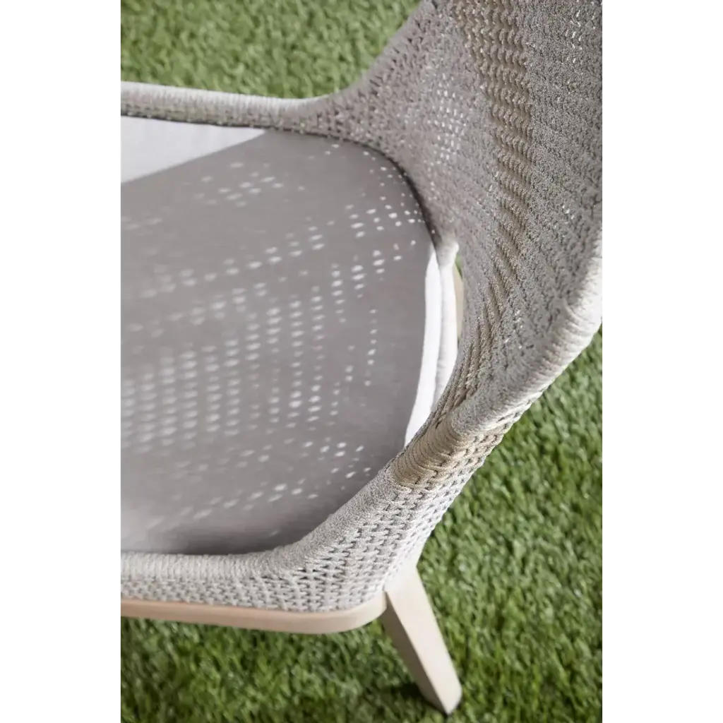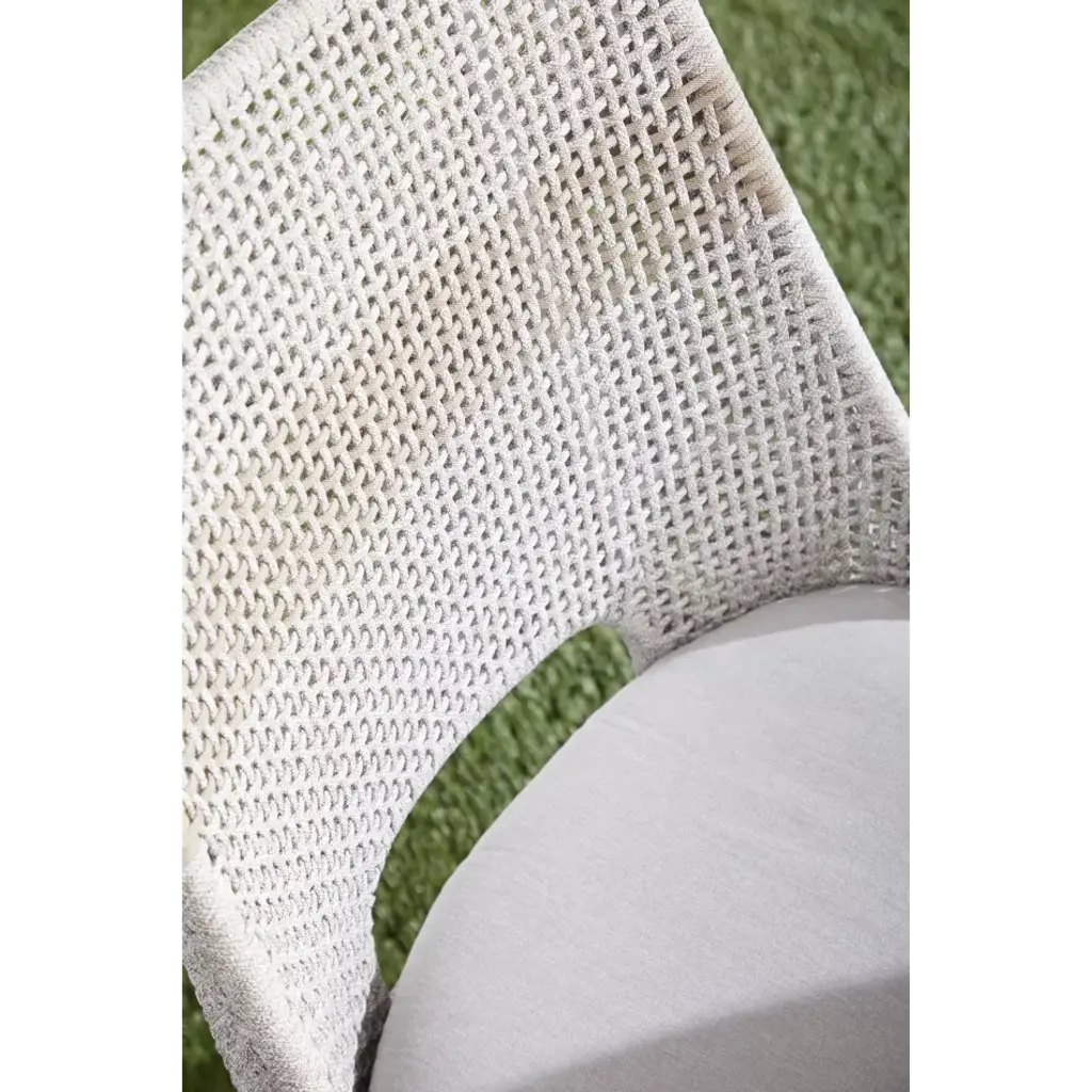 These woven outdoor dining chairs will add a touch of coastal style to your backyard or patio. Constructed with a stainless steel frame and solid gray teak legs, these side chairs are not only sturdy, but durable for outdoor use. A rich taupe and white colored rope is tightly woven with an eye-catching solid taupe stripe interwoven at the center of the seat back. The gray teak legs feature crossed leg stretchers and a beautiful wood grain finish. Paired with a removable all-weather seat cushion, the chairs provide comfort with style and will be the perfect addition to any outdoor space.