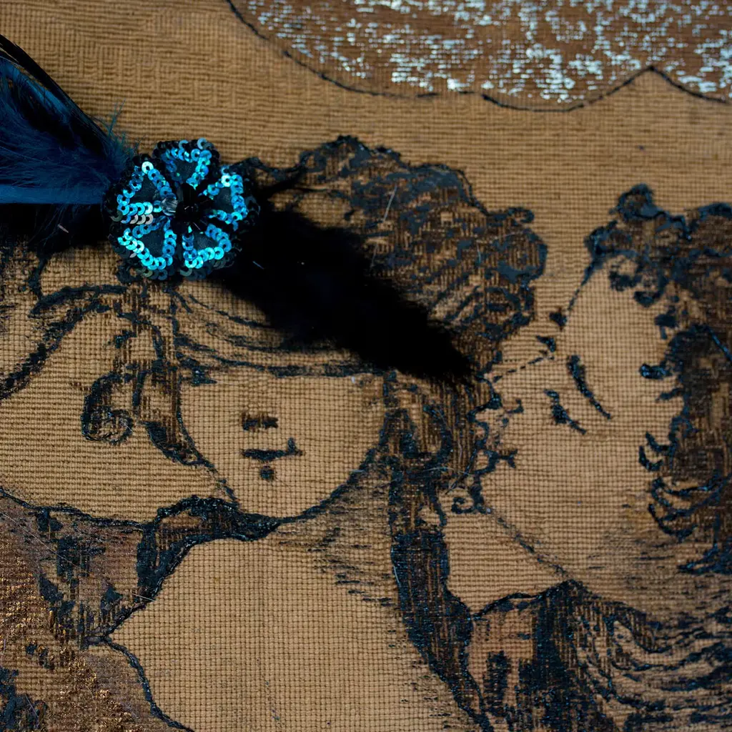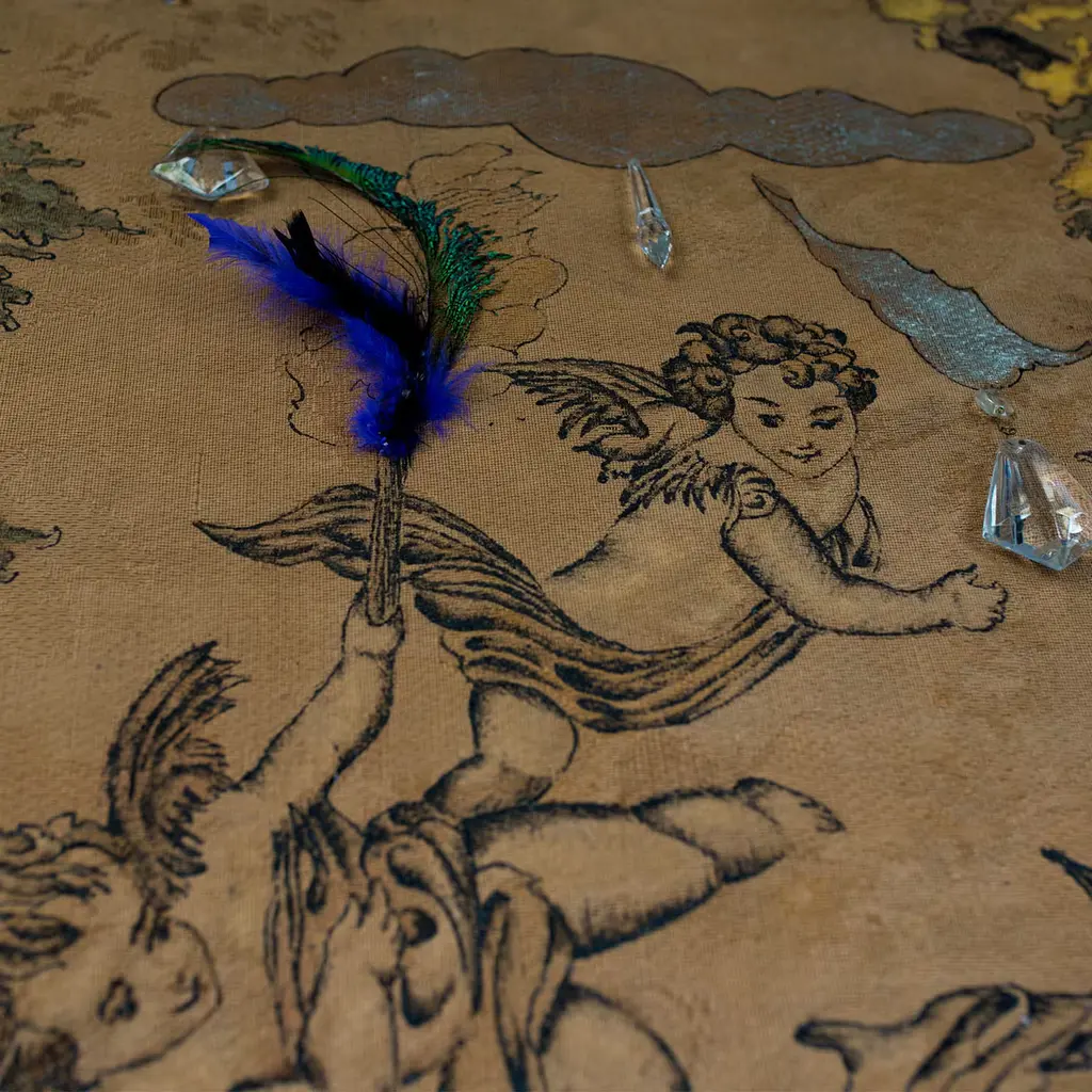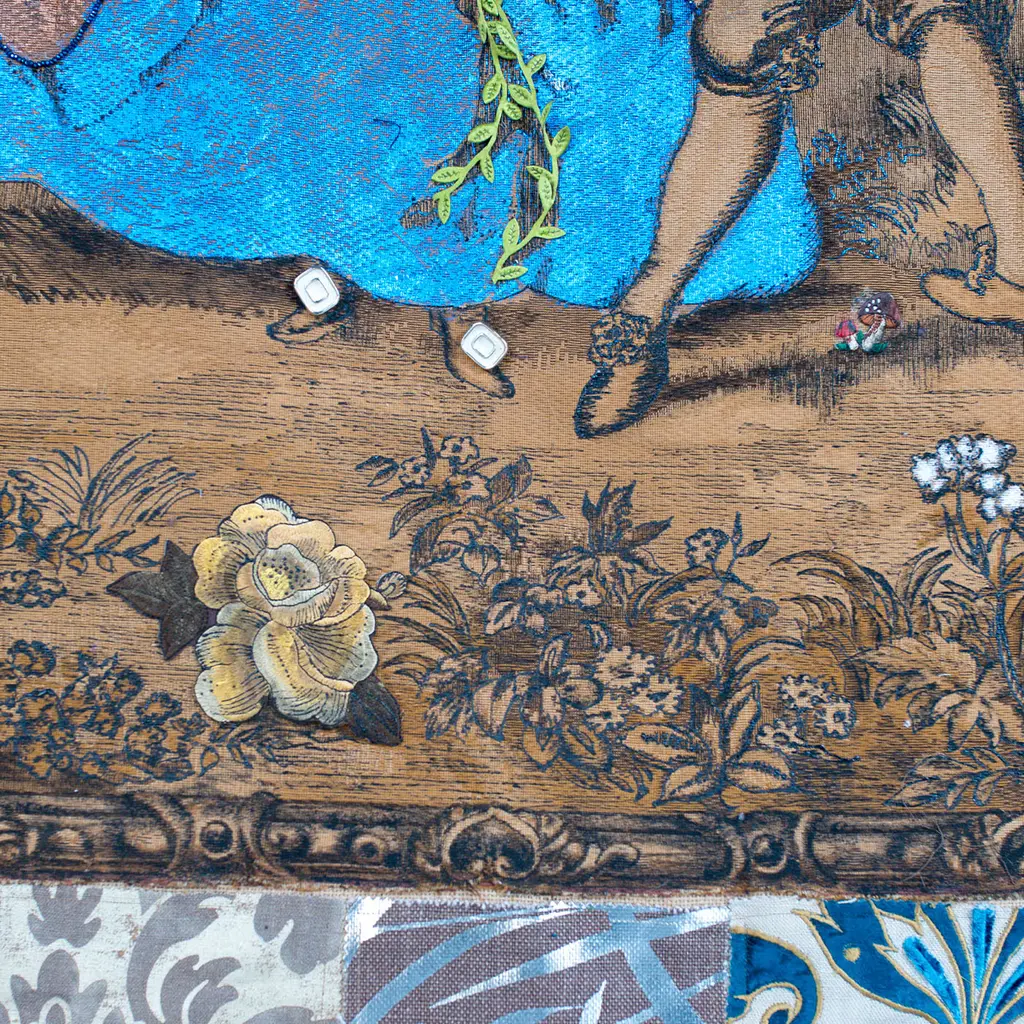The aim of the work involves subverting traditional imagery and rewriting the fabric’s narrative through various mixed mediums and techniques, such as hand painting, sewn threads, metallic foil, old ornamental trimmings, collaging pieces of old and antique fabrics, and much more. The intention behind this work is to invert conventional concepts, concentrating on individual motifs for embellishment and constructing an entirely new context. This piece is unique.