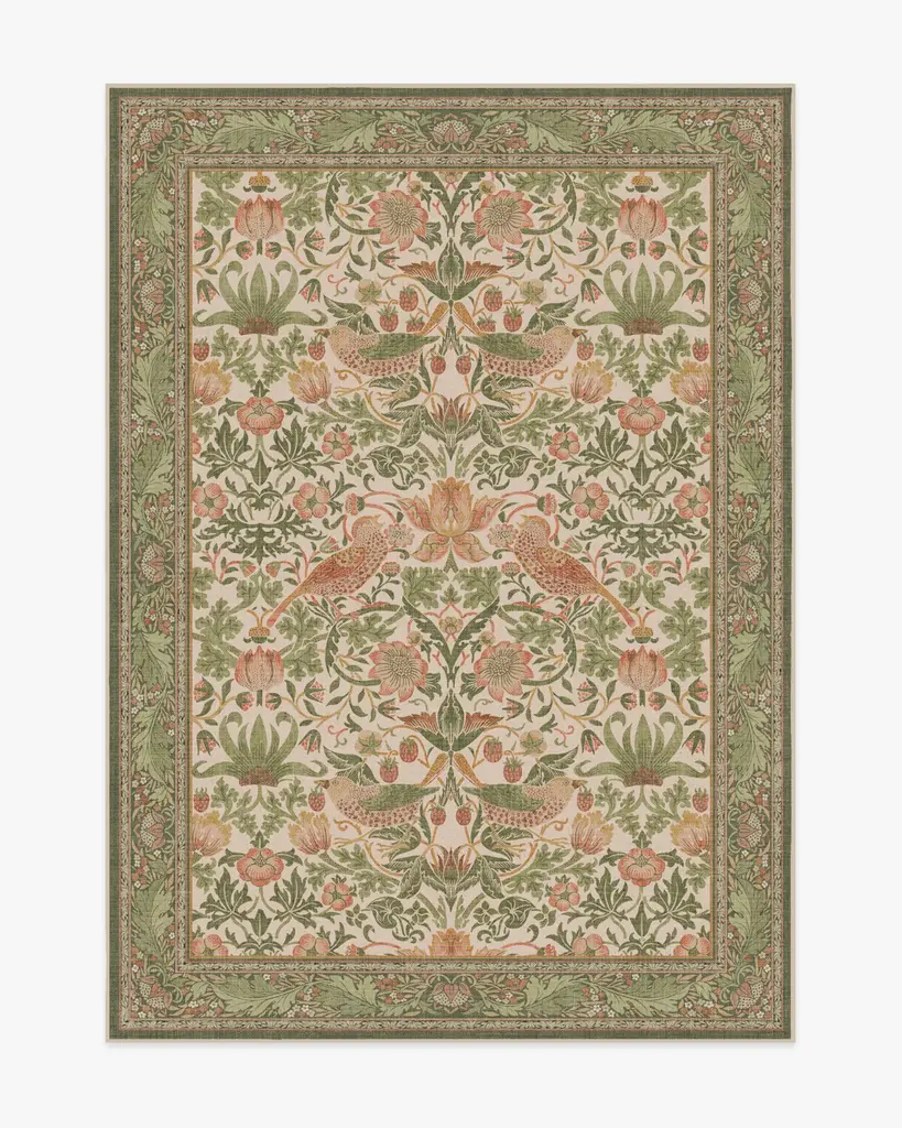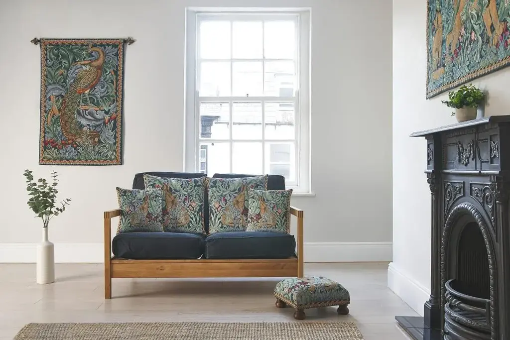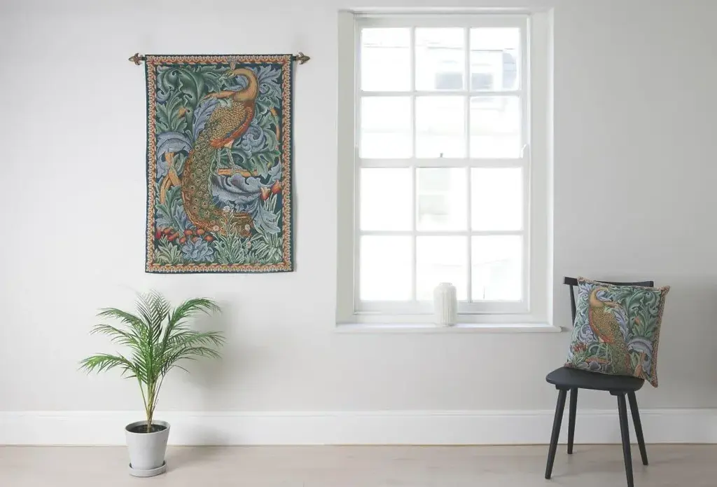 This design is from The Forest Tapestry, one of the finest collaborative tapestries designed by William Morris in which he coordinated the talents of his associates. The peacock itself was designed by Philip Web, based on a charming series of drawings, and incorporated by Morris into a background of swirling acanthus leaves, in the style of his first tapestry, Vine and Acanthus (1879). The details in the foreground were added by J H Dearle. William Morris (1834-1896) became well-known for his designs in the decorative arts and the development of various crafts, including tapestry-weaving. Favouring Medievalism and using the painstaking methods of the craftsman, he adapted the arts of the Middle Ages for the modern world. Morris re-introduced quality and style in the decorative arts, and experimented with vegetable dyes, developing a unique palette. This design was woven circa 1887 by the weaving firm of Morris and Company at the Merton Abbey Workshops in Surrey. The tapestry was shown at the 1890 Arts and Crafts Exhibition and was purchased by Mr Alexander Ionides, who hung it in the study of his residence in Holland Park, London. The original may be seen in the Victoria & Albert Museum in London. This beautiful tapestry is woven on a jacquard loom by skilled weavers, keeping alive the centuries old tradition of tapestry manufacturing from generation to generation. This tapestry is fully lined incorporating a sleeve along the top for hanging with a Hines hanging rod. Alternatively, this tapestry can be hung with a wooden batten which is a concealed method of hanging. Composition: 80% cotton, 16% viscose, 4% polyester Finish on reverse: This tapestry is fully backed with luxury cotton lining incorporating a sleeve along the top for hanging purposes. See Hanging Options below for more information.