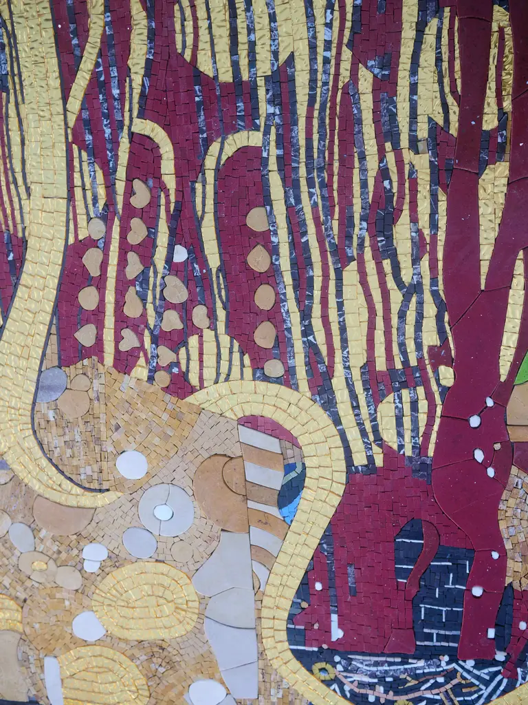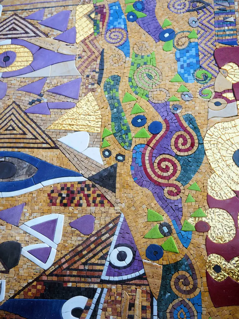 A monumental mosaic mural, a testament to the passage of time and the enduring power of human creativity, invites viewers into a world of interwoven narratives and historical echoes. The composition, a rich tapestry of geometric patterns, stylized figures, and symbolic motifs, tells a story of civilizations past and present. From the ancient symbols of the sun and moon to the intricate patterns of the Tree of Life, each element of the mosaic carries a profound meaning, inviting contemplation on the human experience. The mosaic's vibrant colors, ranging from earthy browns and greens to shimmering golds and blues, create a visual tapestry that is both captivating and awe-inspiring. As visitors explore this monumental artwork, they are invited to journey through time, connecting with the past and envisioning the future.