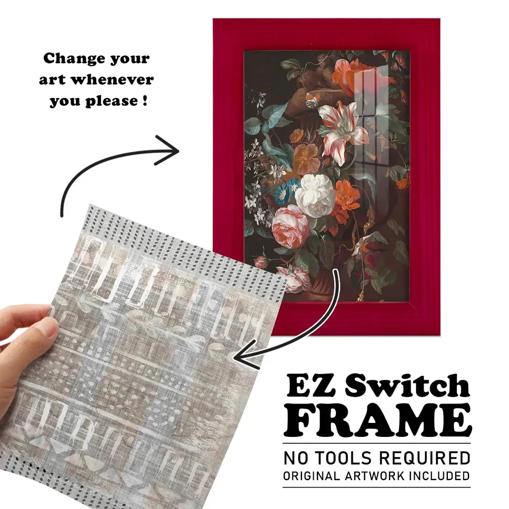 Traders Tapestry IV -EZ SWITCH Framed Print w/glass-Cherry Red A delightful, framed print. Featuring a solid wood frame with real wood glass. This premium print is giclee quality. In addition, every frame features a removable back and table top stand. This allows you to change your art in the future or to just stand the art on a table for a new look. We are sure you'll enjoy our new series of EZ SWITCH Framed Art. Solid Wood Frame Real Glass Removable / Replaceable Art Built in Tabletop Stand Sizes range from 4x6 up to 12x15 - buy just one or pair them up as sets as you see fit.