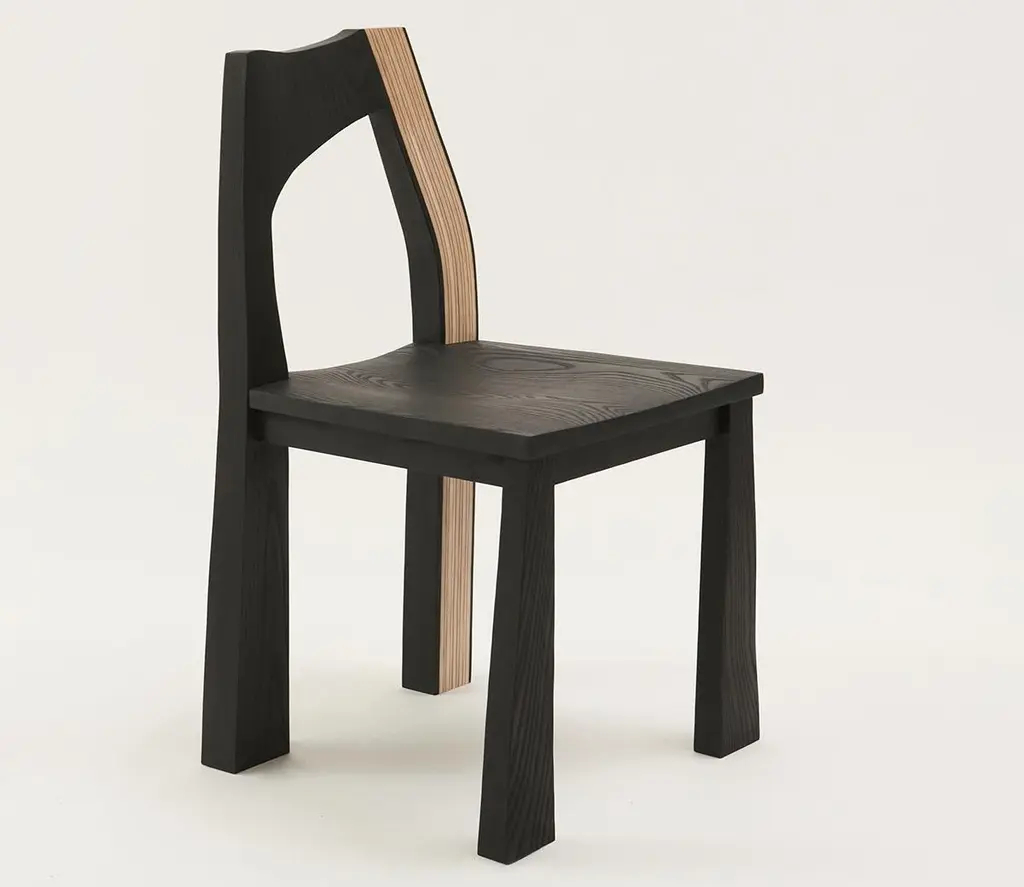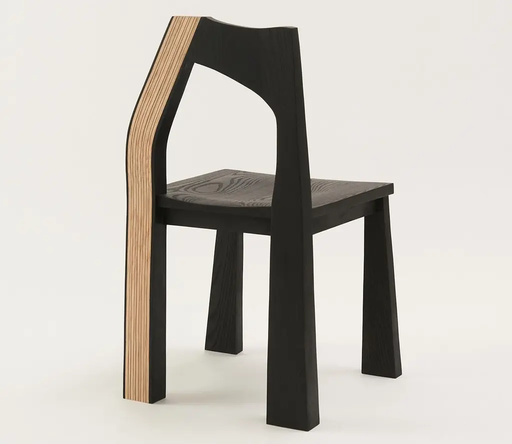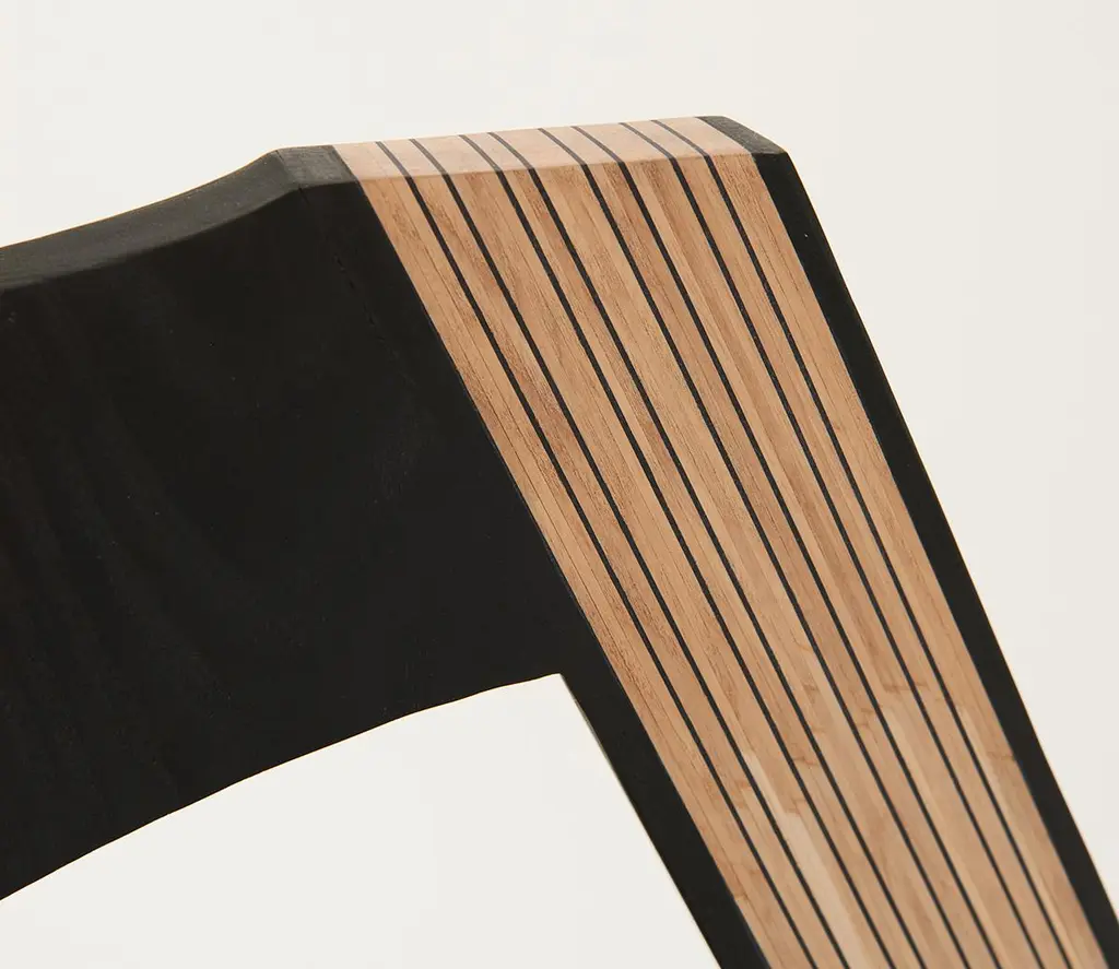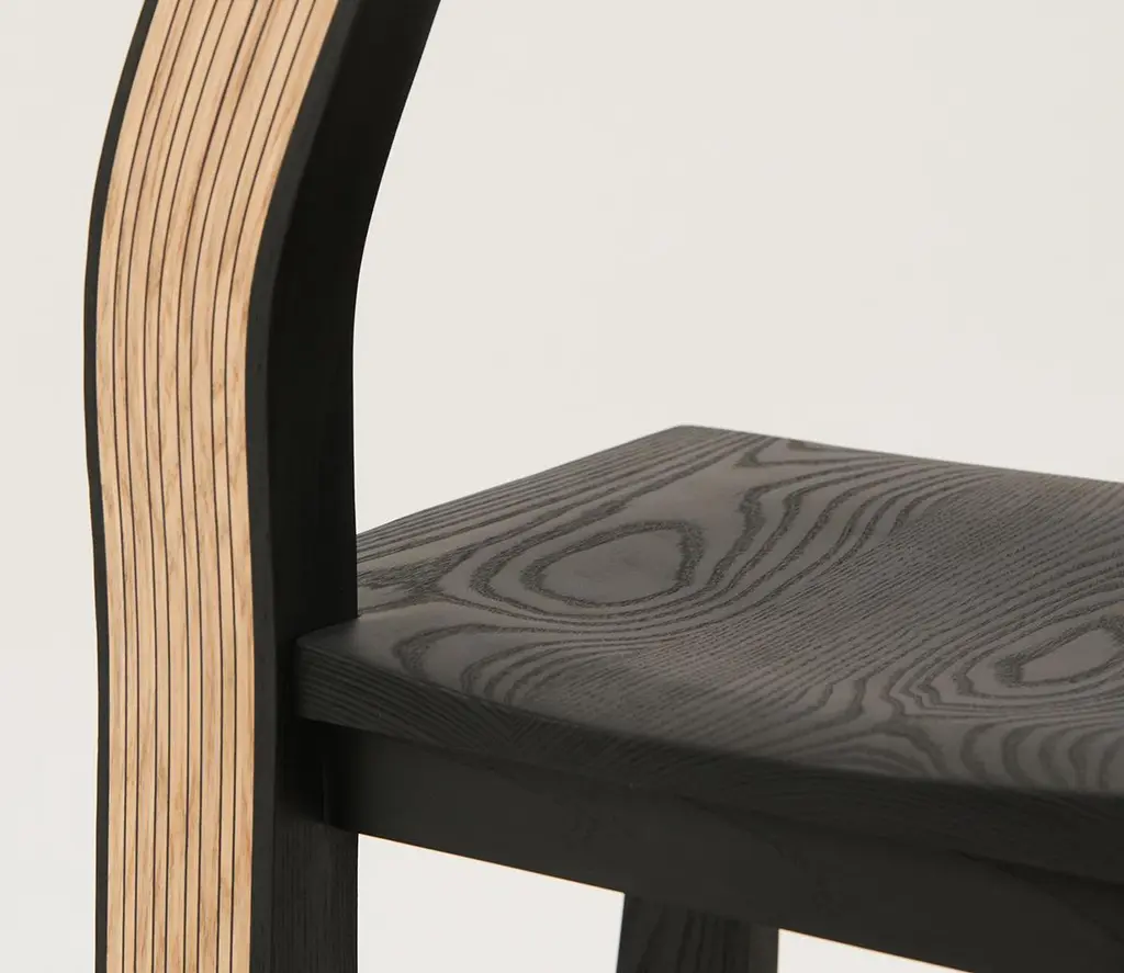 The Tapestry chair is inspired by delicately draped textiles. The gentle curve of the back provides a composition similar to that of a drawn curtain, and creates softness out of a typically rigid material. This chair is made of solid hand-carved ash and dyed using India ink. The contrasting striped back is made using a process of stack lamination with white and black veneer. Designed to be used as a dining chair, the Tapestry is handmade in Brooklyn and can be customized in different wood species, finishes, and sizes.