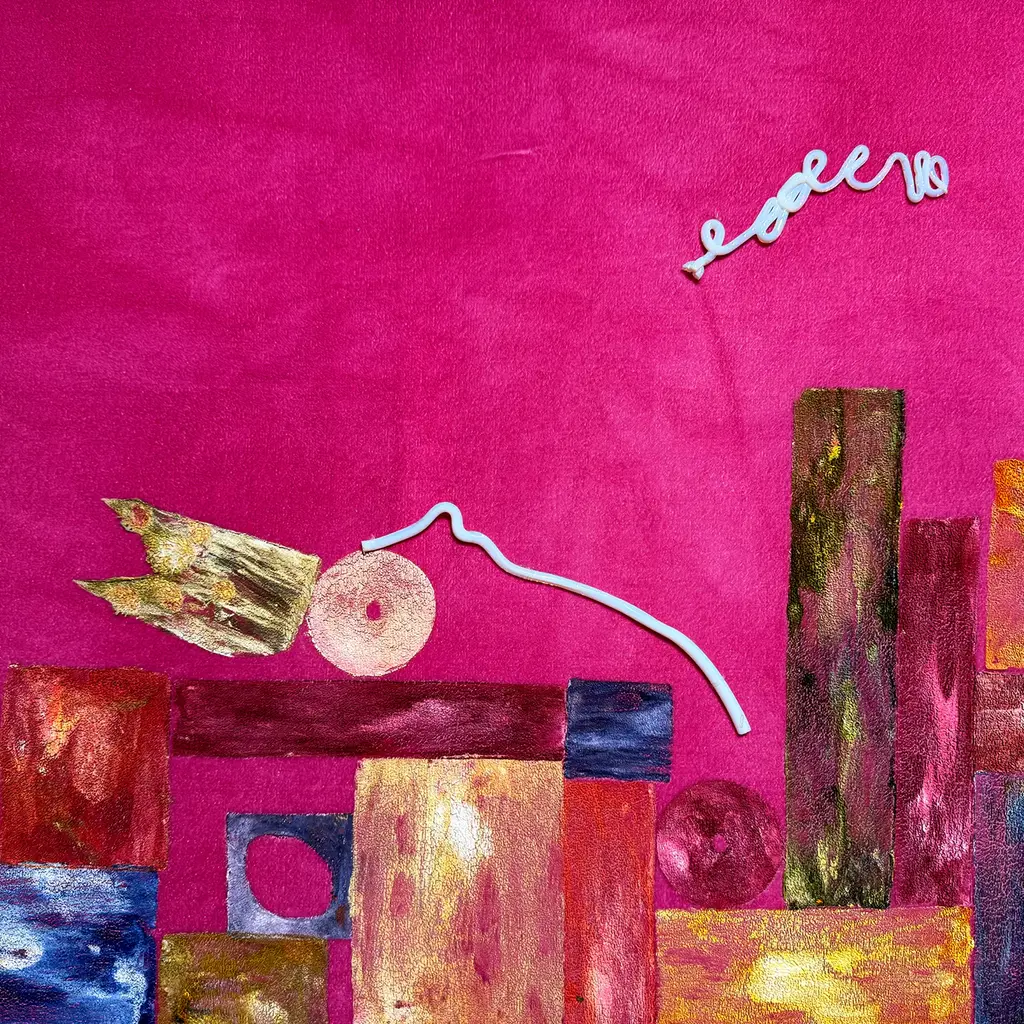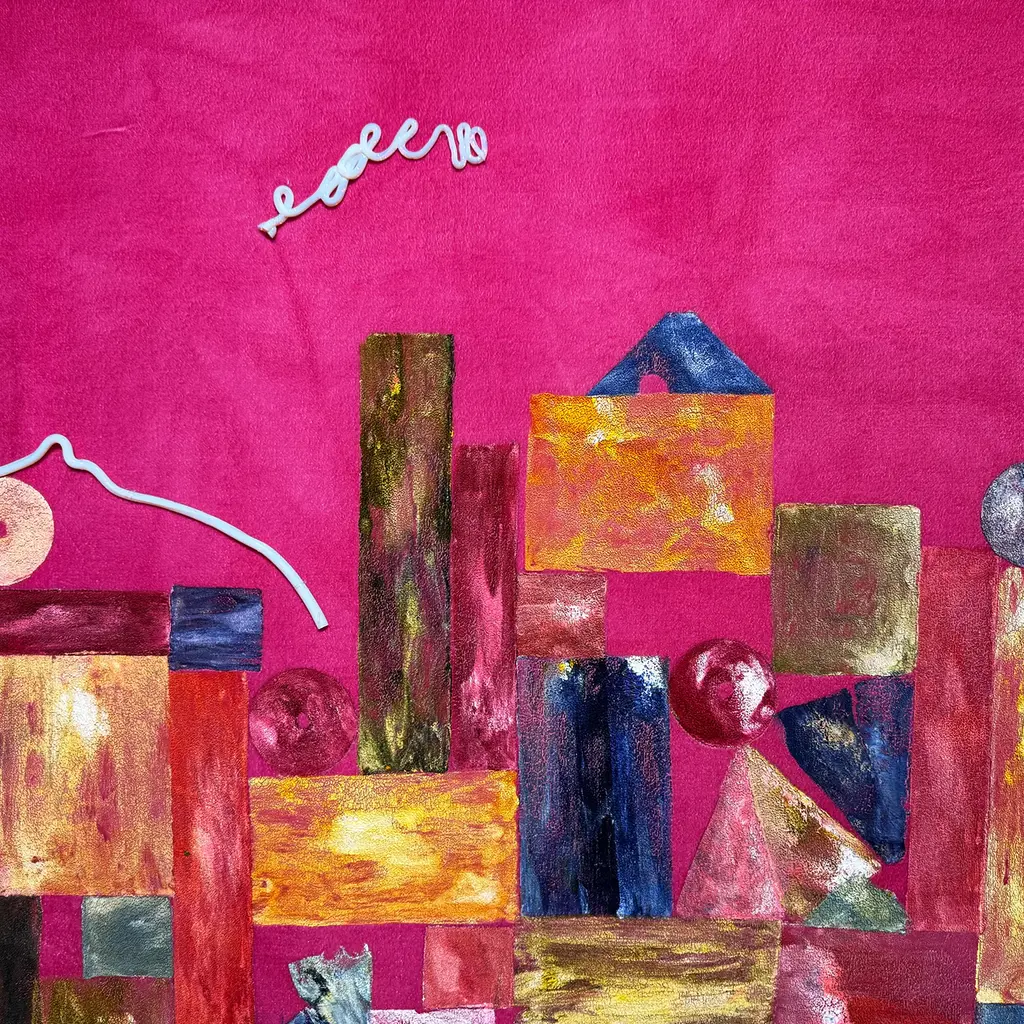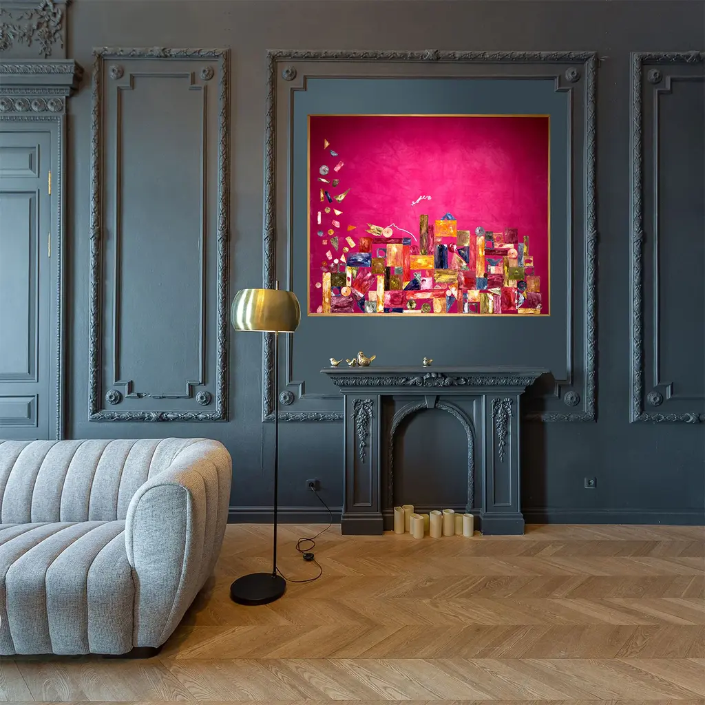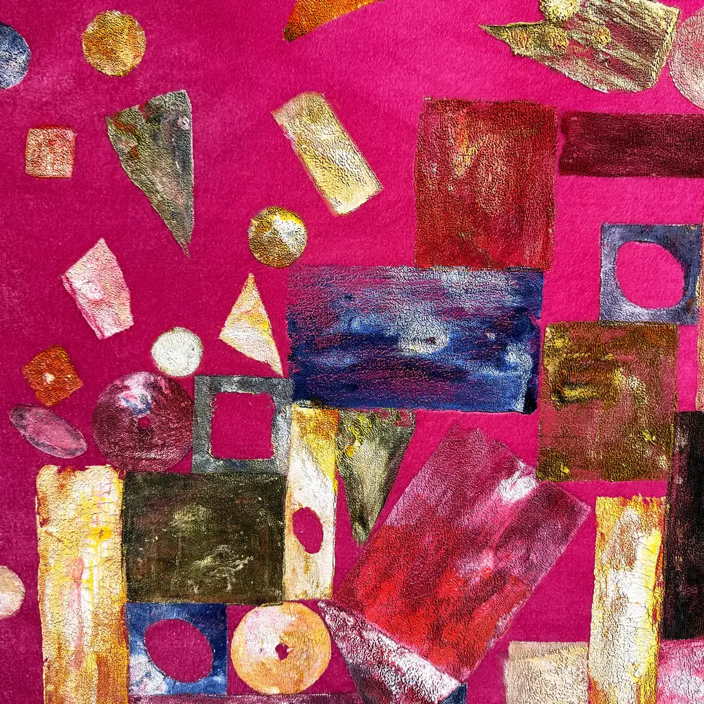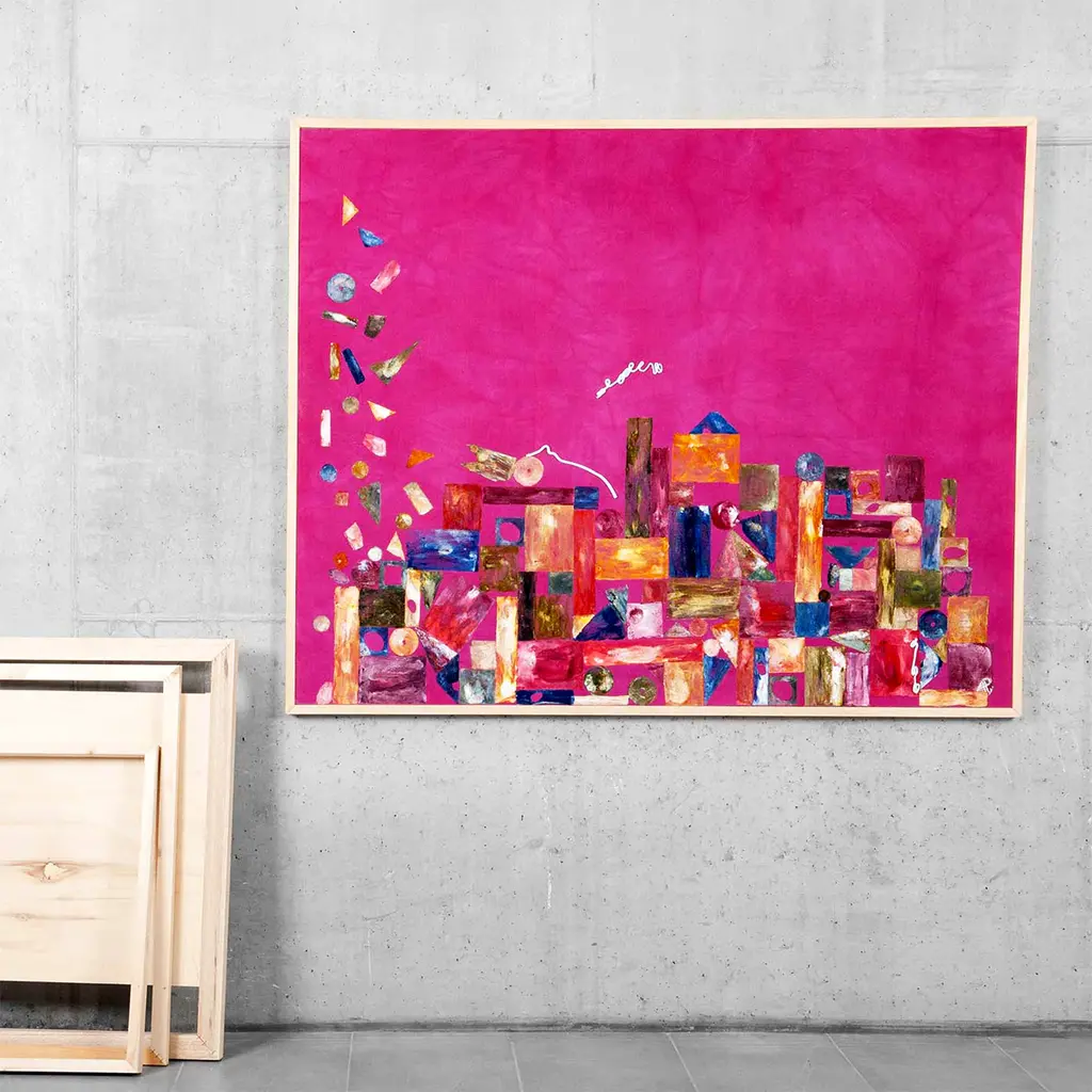 This tapestry features a vivid pink velvet base dyed with a unique technique using crimson and bordeaux pigments, creating dynamic light and perspective effects. Painted with natural pigments and color pastes, it showcases intricate geometric shapes in warm tones. It is enhanced with Murano glass details that add depth and conceptual value. Mounted on a sturdy wooden frame and bordered with a natural wood frame, this tapestry brings a refined and elegant touch to contemporary interiors.