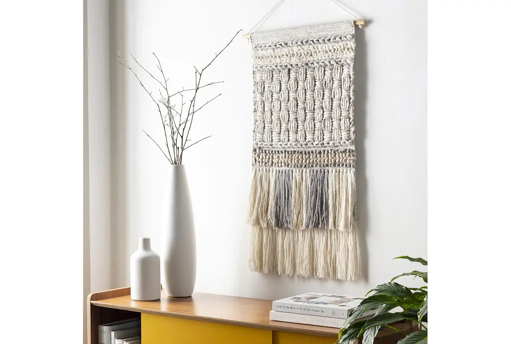 Add a touch of modern charm to your space with the Wall Tapestry- Basketweave Khaki Grey Beige Multicolor Fiber. This woven tapestry features a beautiful blend of khaki, light grey, medium grey, ivory, and dark brown, making it a versatile piece for any room. Perfect for dorms, this tapestry brings a cozy, warm feel to your walls.