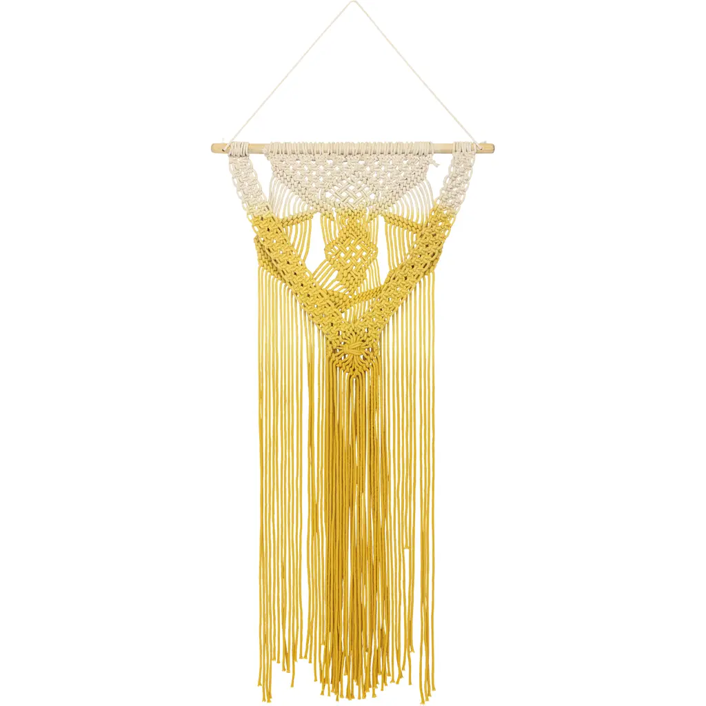Enhance your dorm room with the Wall Tapestry- Macrame Fiber Shades Of Blue 29X20 by Surya. This traditional woven tapestry features a beautiful blend of dark blue, pale blue, and beige colors, creating a soothing and stylish atmosphere. Made from 100% cotton and wood, it offers a unique boho-chic design that will complement any space.