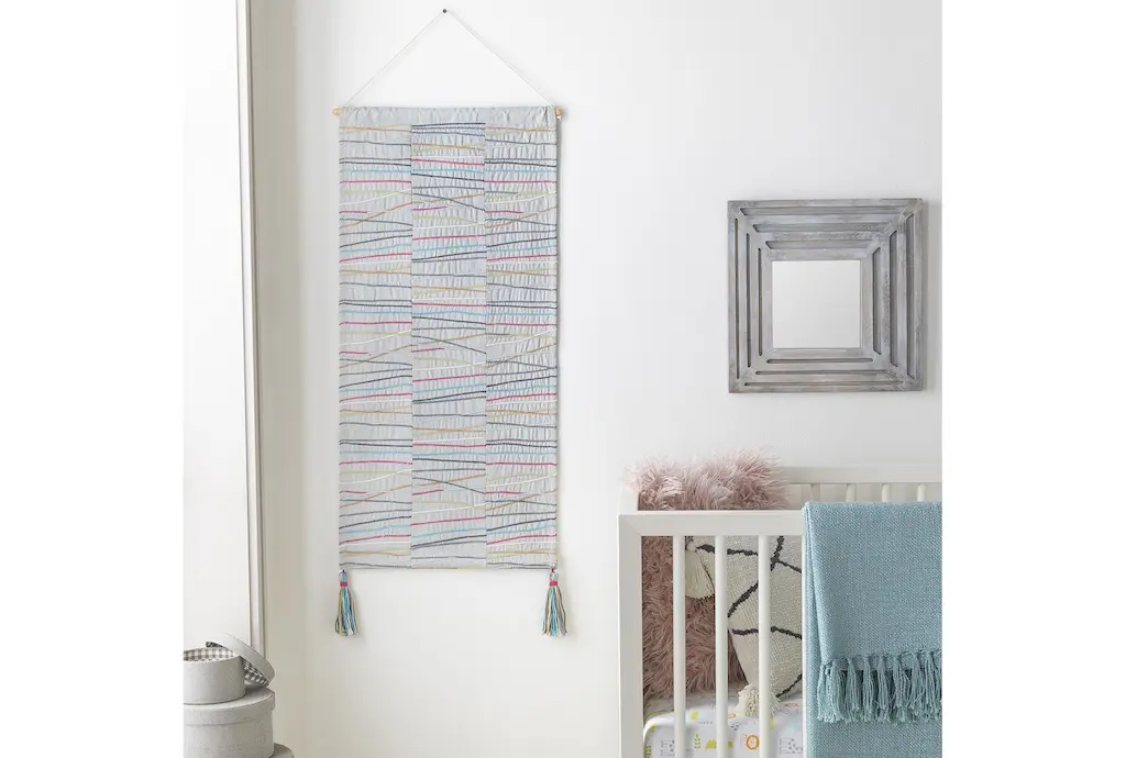 Enhance your dorm room decor with the Wall Tapestry by Surya. This rectangular tapestry features a beautiful array of colors including ice blue, beige, bright pink, sky blue, navy, medium grey, camel, light grey, lime, and teal. Made with 100% cotton, this piece is both durable and stylish.