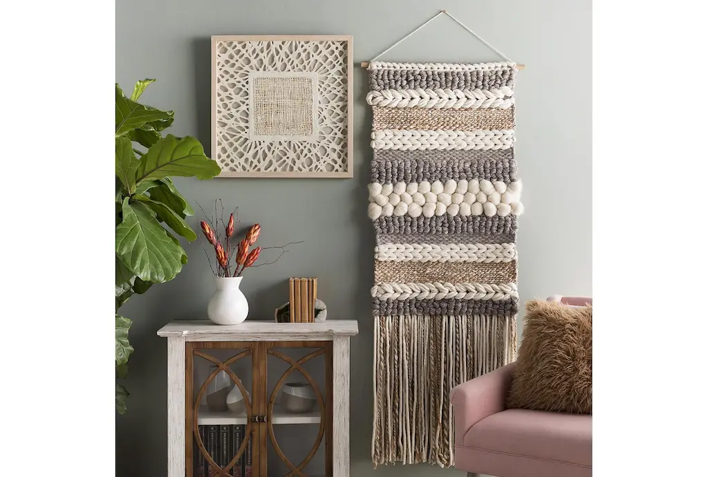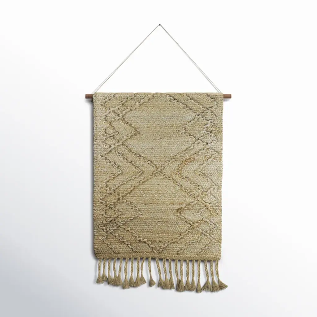 Add a touch of rustic charm to your dorm with the Wall Tapestry- Textured Fringe Natural Beige Multicolor Fiber 24X70. Featuring a beautiful blend of camel, cream, and saffron colors, this tapestry is crafted from a mix of viscose, wool, and jute fibers. The tall rectangle shape and textured fringe design make it a standout piece in any room.