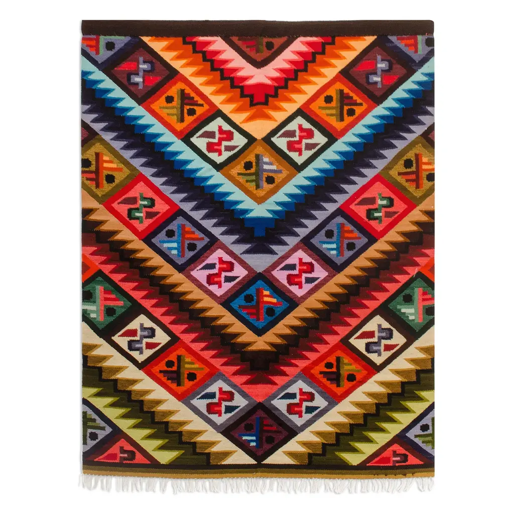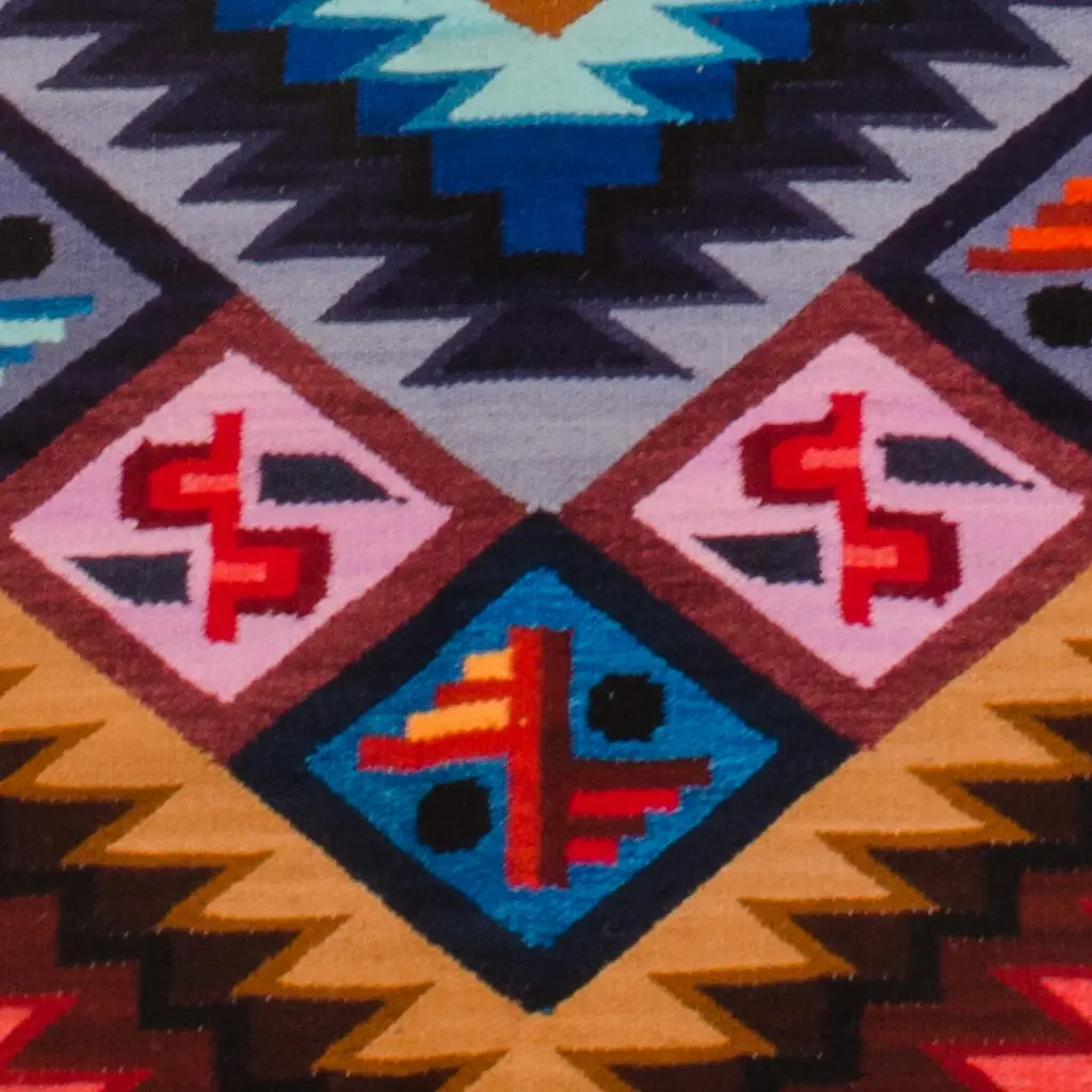 David Laura Zanabria designs a hypnotic composition. It depicts tocapus, the stylized glyphs of Inca inspiration that were once used as an alphabet. Zanabria uses intense colors and weaves the tapestry on a traditional loom. His style derives from the textile legacy of Ayacucho artistry. Titled "Tocapus en colores" in Spanish.