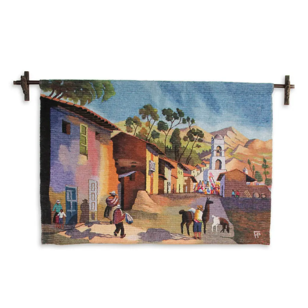 Palian Huancayo is nestled in the Andean highlands, fortunate in its landscape and clear blue skies. People are renowned for their religious zeal, and their church stands like a proud testament to their faith. Francisco Huaynate captures the village's serene ambience in a colorful tapestry. Woven on a traditional loom, the tapestry exemplifies the style of San Pedro de las Cajas.