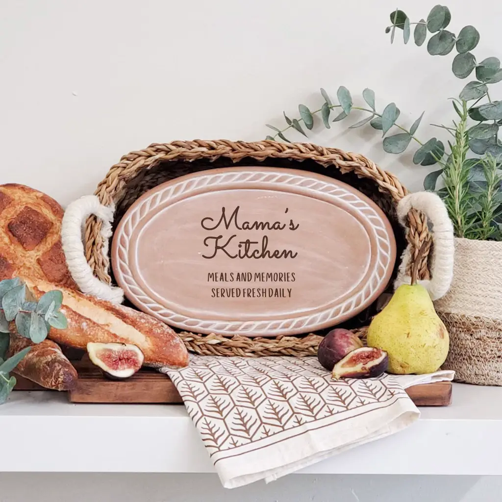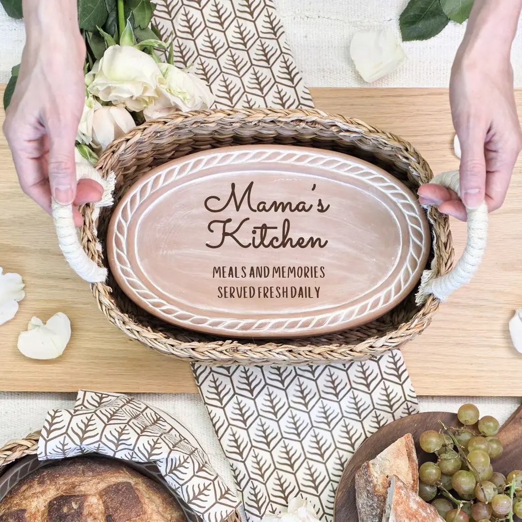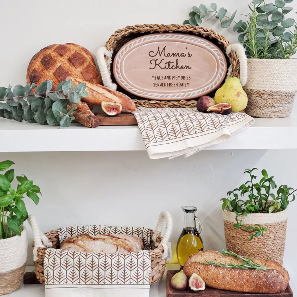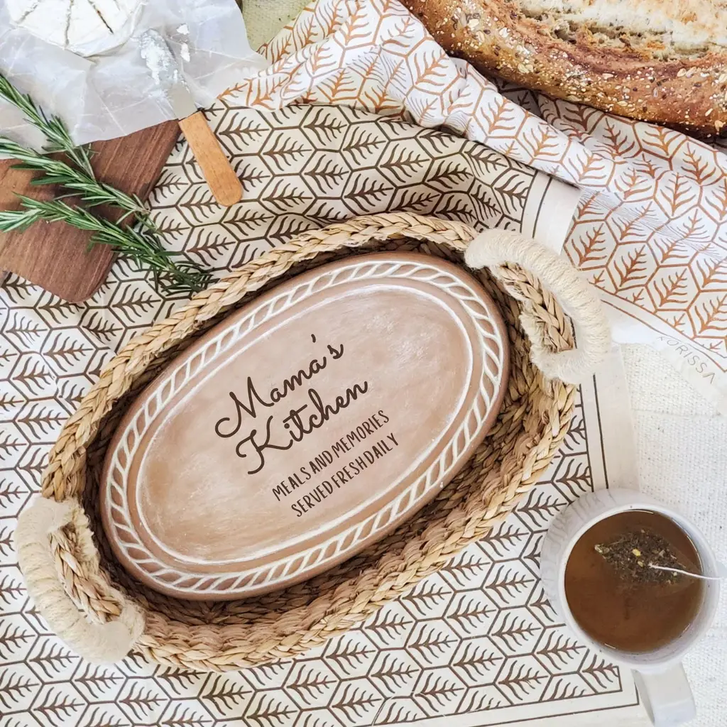 Give mom the gift of daily warmth and comfort with the bread warmer and basket. More than just a bread warmer, it's a symbol of your love, keeping her bread fresh and warm, just like her hugs. This beautifully handcrafted terracotta plate, nestled in a sustainably woven seagrass basket, is a testament to both eco-consciousness and exquisite design. Designed and curated by KORISSA, and lovingly handmade by Fair Trade artisans in Bangladesh, it's a gift that warms the heart and home.Included items,(1) Terracotta Bread warmer, (1) Seagrass basket and (1) Tea towelEach product is designed and curated by KORISSA, sustainably handmade by Fair Trade artisans in Bangladesh.