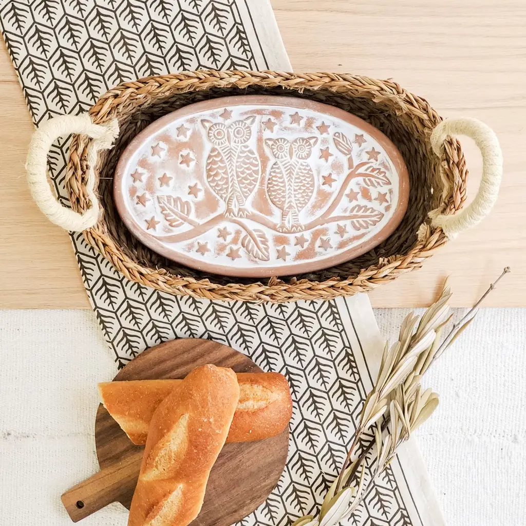 Add a bit of artisan-inspired style to the kitchen with a terracotta bread warmer and hand screen printed tea towel. Engraved with an owl design and cut to fit neatly into an oval basket, this terracotta special bread warmer is naturally insulating, and the basket itself has been handwoven from sustainably grown seagrass. The tea towel is great for drying dishes or hands in the kitchen, lining a bread basket. They are the best gift items for anyone who loves bread!Included items,(1) Terracotta Breadwarmer, (1) Seagrass basket and (1) Tea towel of your choice. Each product is designed and curated by KORISSA, sustainably handmade by Fair Trade artisans in Bangladesh.