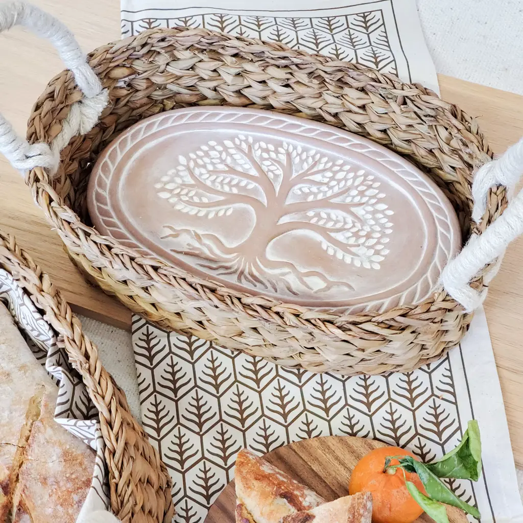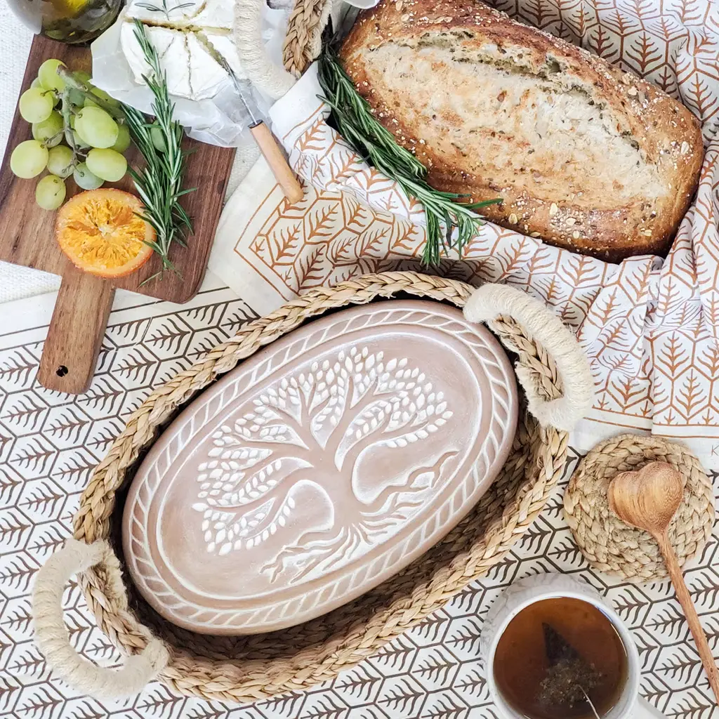 Add a bit of artisan-inspired style to the kitchen with a terracotta bread warmer and hand-screen-printed tea towel. Engraved with tree of life design and cut to fit neatly into an oval basket, this terracotta special bread warmer is naturally insulating, and the basket itself has been handwoven from sustainably grown seagrass. The tea towel is great for drying dishes or hands in the kitchen, lining a bread basket. They are the best gift items for anyone who loves bread!