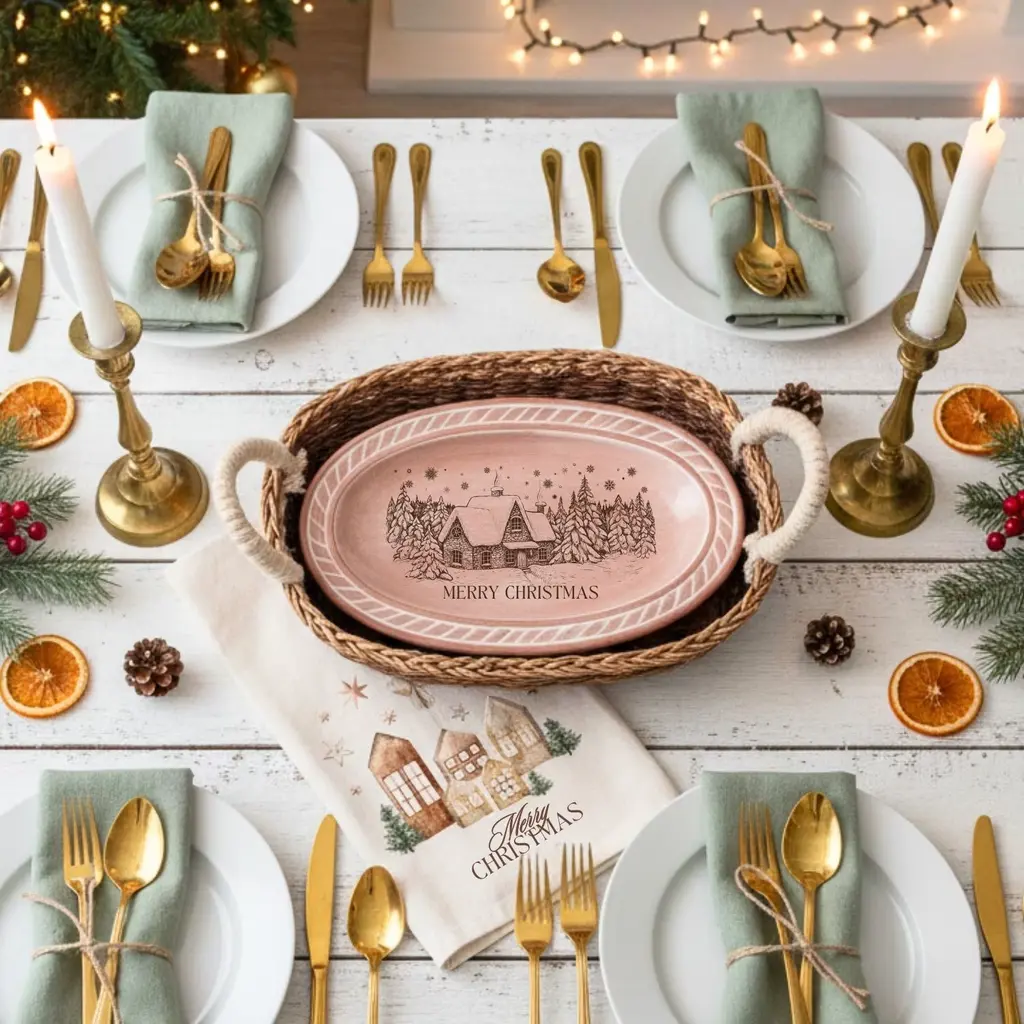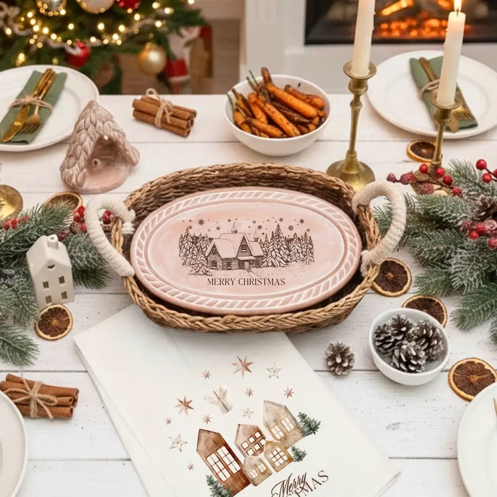 Bring the warmth of the season to your table with our charming Christmas Village Bread Warmer & Woven Basket set and Tea Towel Set. This isn't just a kitchen accessory; it's a celebration of holiday gatherings, designed to keep your bread warm and your celebrations full of good cheer. The set features a terracotta warmer with a cheerful Christmas village design, ready to be heated and placed inside the basket. The warmer fits snugly within a handwoven, sustainably sourced basket, creating a rustic and inviting display that perfectly complements your holiday decor.It's ideal for festive dinner parties, holiday meals, or simply enjoying fresh, warm bread on a chilly winter evening. Included items,(1) Terracotta Bread warmer, (1) Seagrass basket and (1) Tea towel