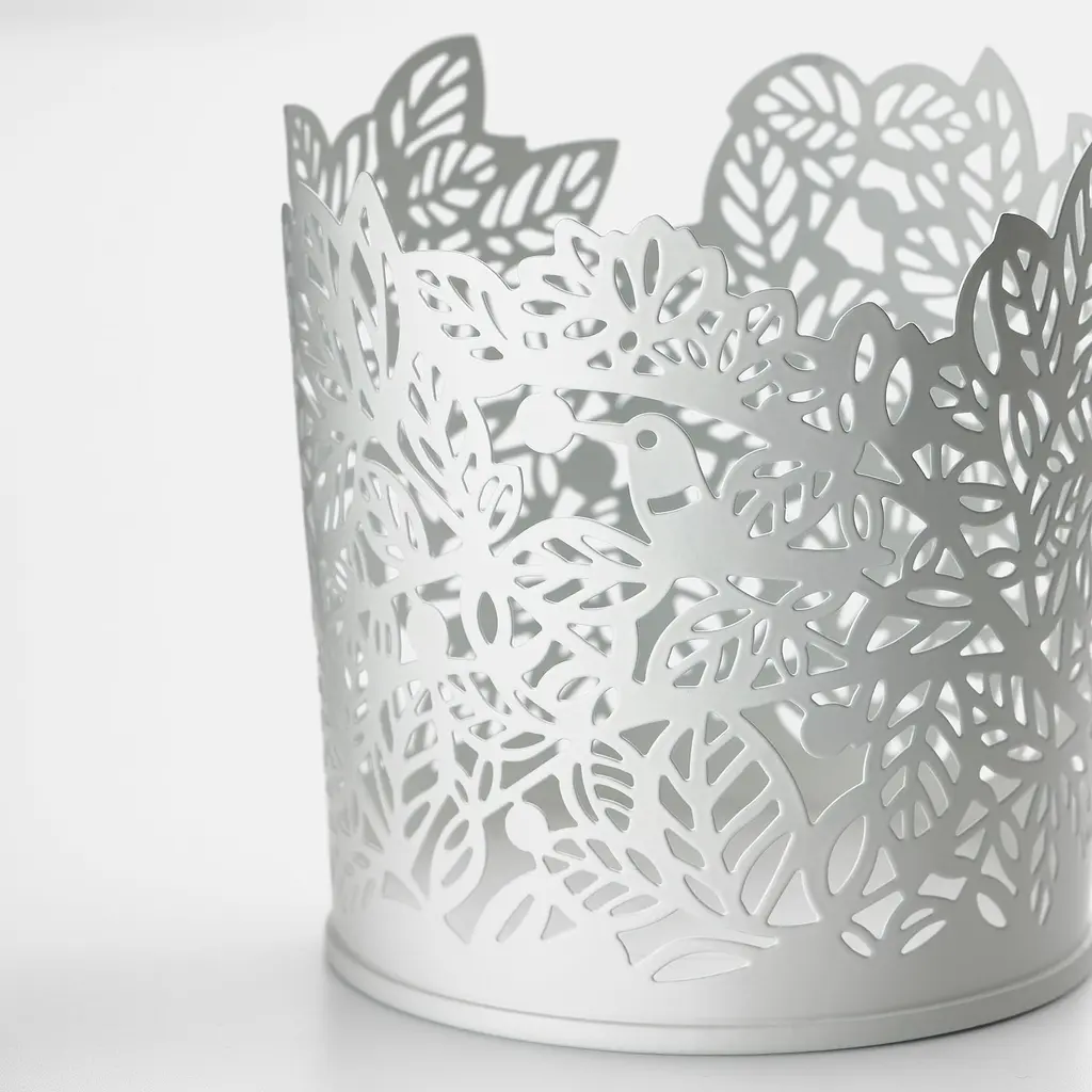 SAMVERKA Tealight holder - white 3 ¼ ". The SAMVERKA series has a nice pattern with birds and leaves that adds a romantic touch to your plants and candles. The warm light from the candle shines decoratively through the pattern on the candle holder.