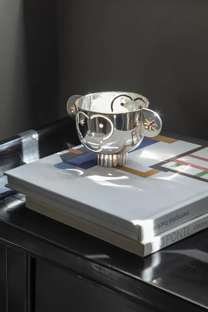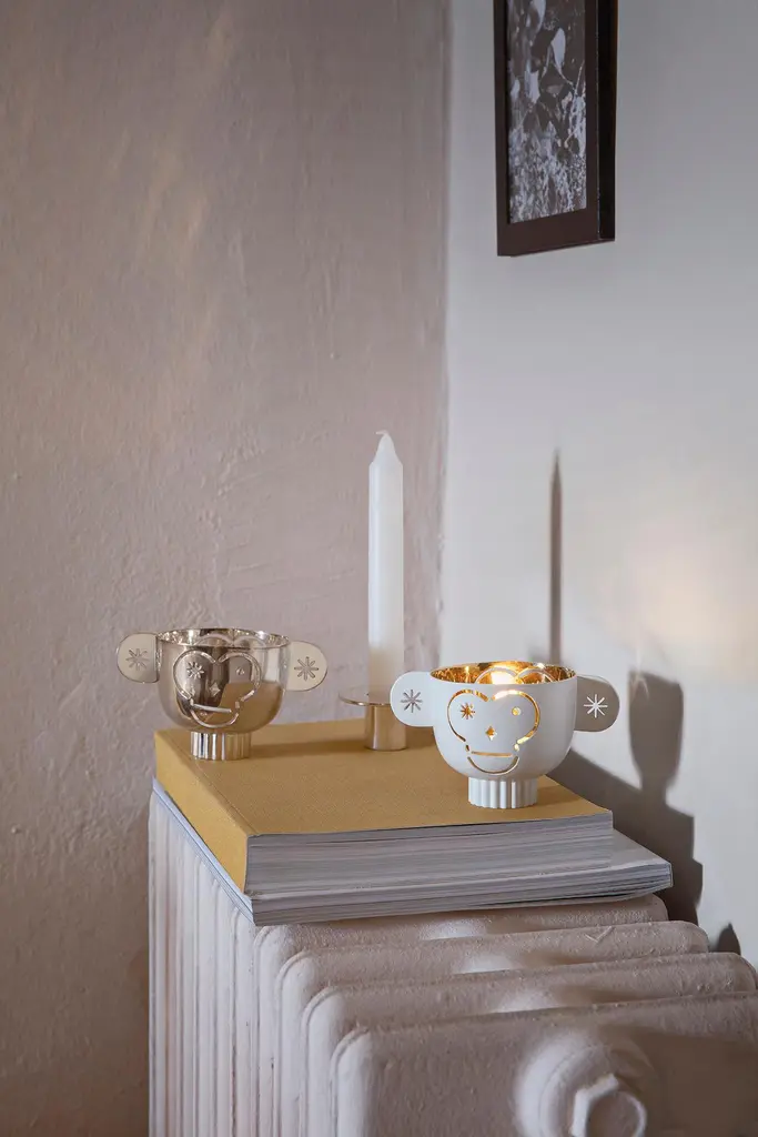 Monkos is a tealight holder designed by Jaime Hayon, a tableware piece made to be remembered. The details show the sophisticated crafting technique of metal, feature that makes Monkos an object whose reflections and sparkles are always noticed, even without candlelight. Its singular character-like shape is warm and inviting.