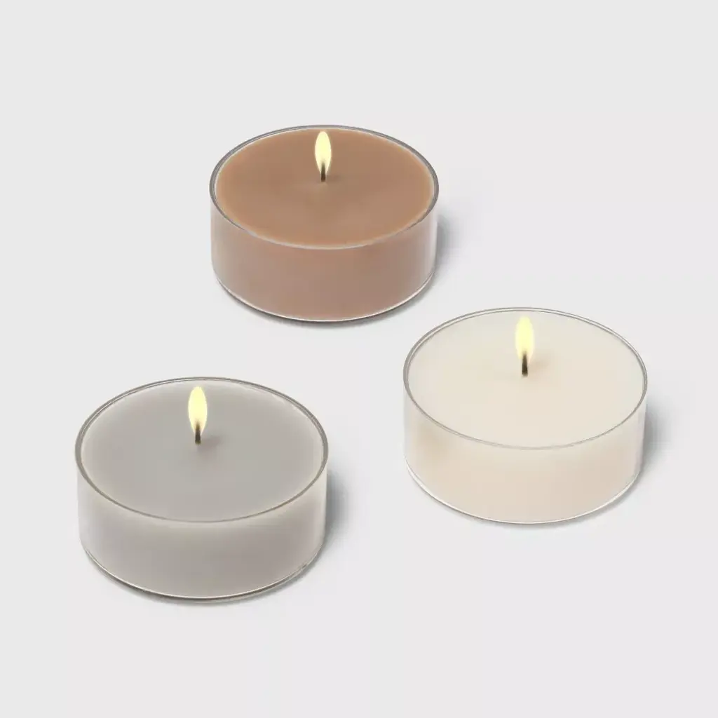 Brighten up your indoor and outdoor spaces instantly with this 24-Pack of Tealight Candles from Threshold™. Great for everyday use or special occasions, this pack of cylindrical tealights in three colors brings warm style to any space. They feature the lovely scents of vanilla bean & amber, cozy cashmere and ashwood & palo santo to help you create a lovely ambiance, and each one burns for up to 4 hours. Threshold™: Quality & Design / Casual classics for house and home.