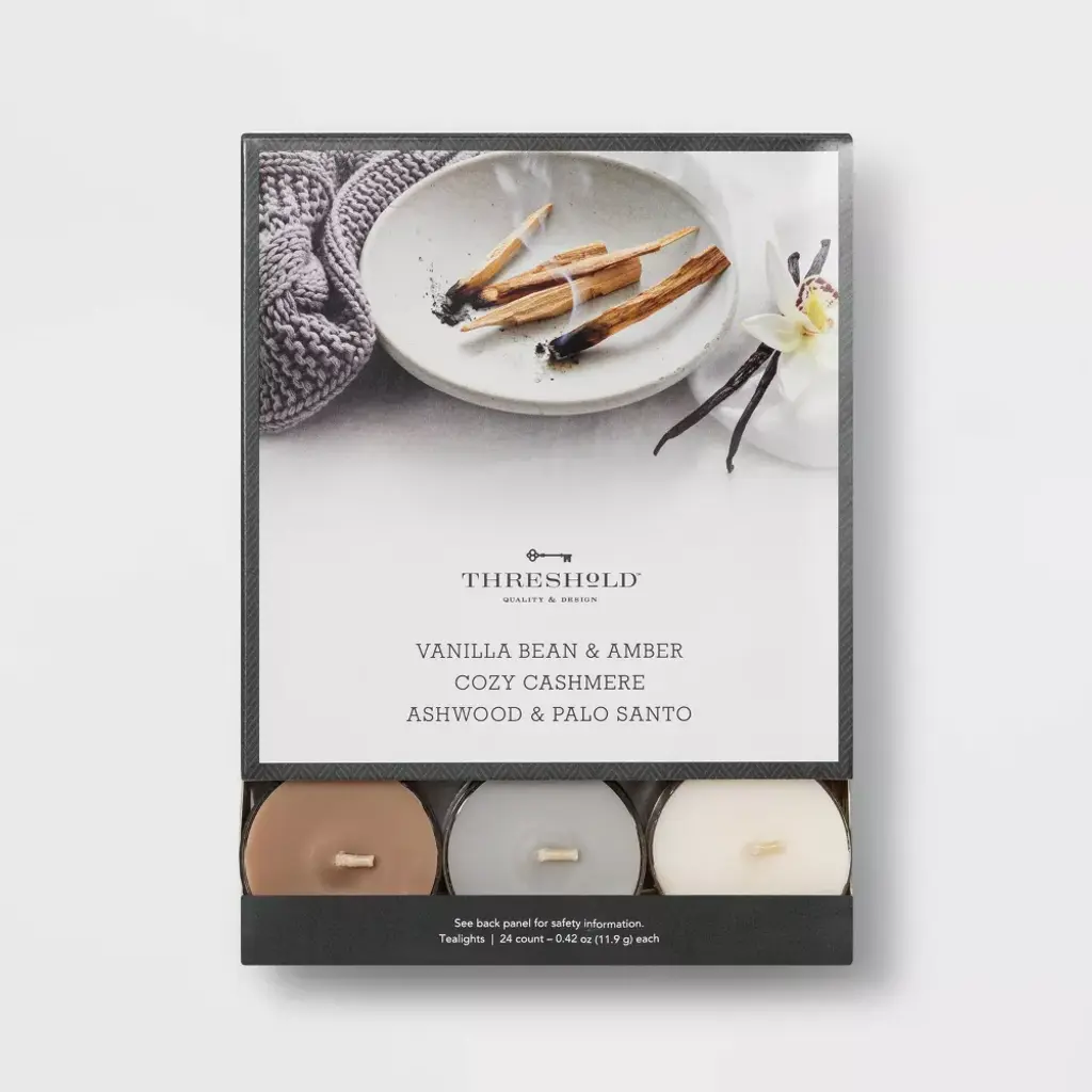 24pk Tealight Vanilla Bean And Amber/cozy Cashmere/ashwood Candle - Threshold™: Palm Oil & Paraffin Wax, 4Hr Burn Time