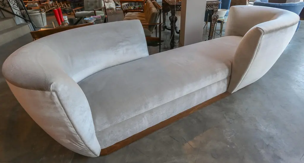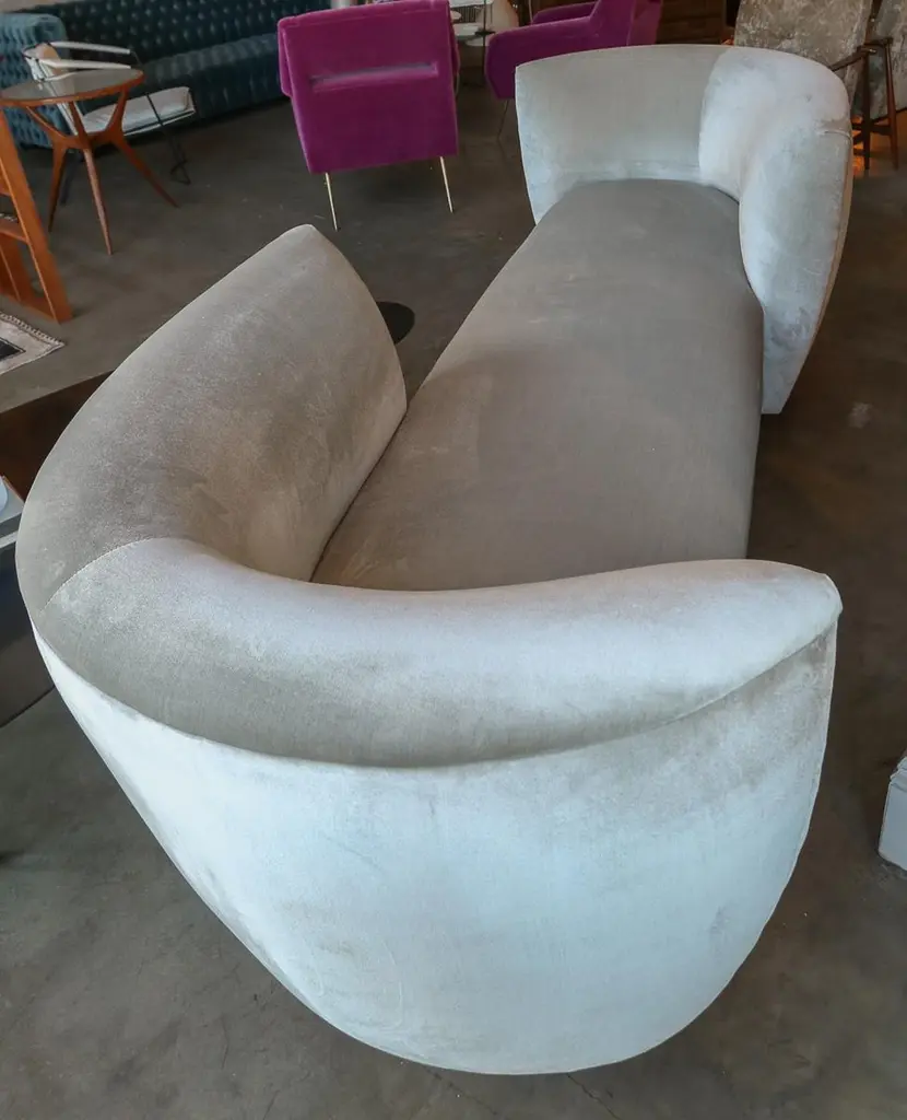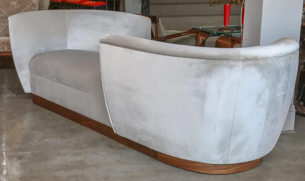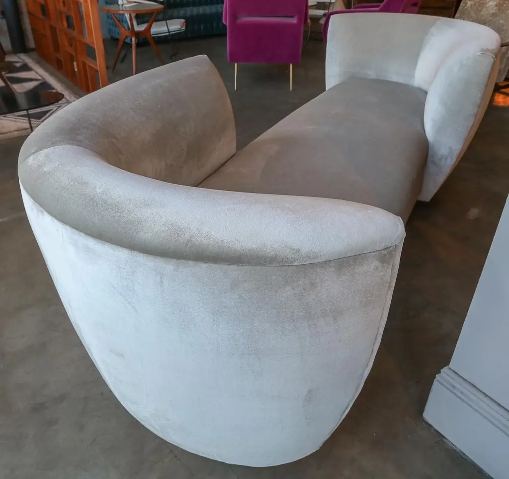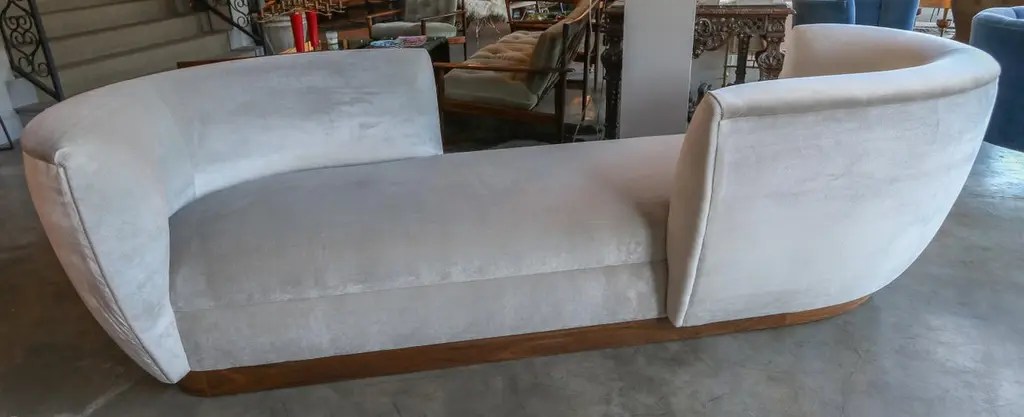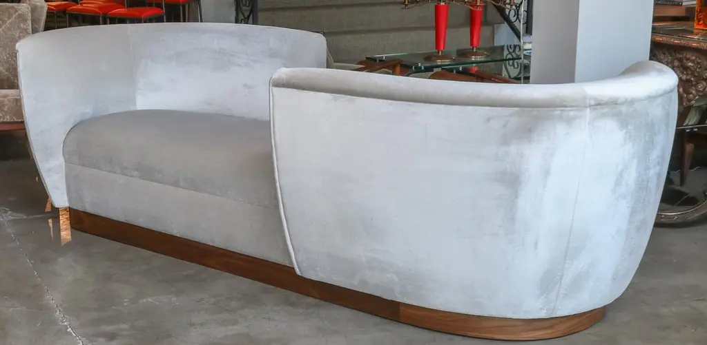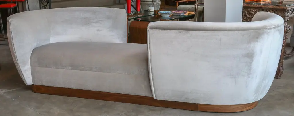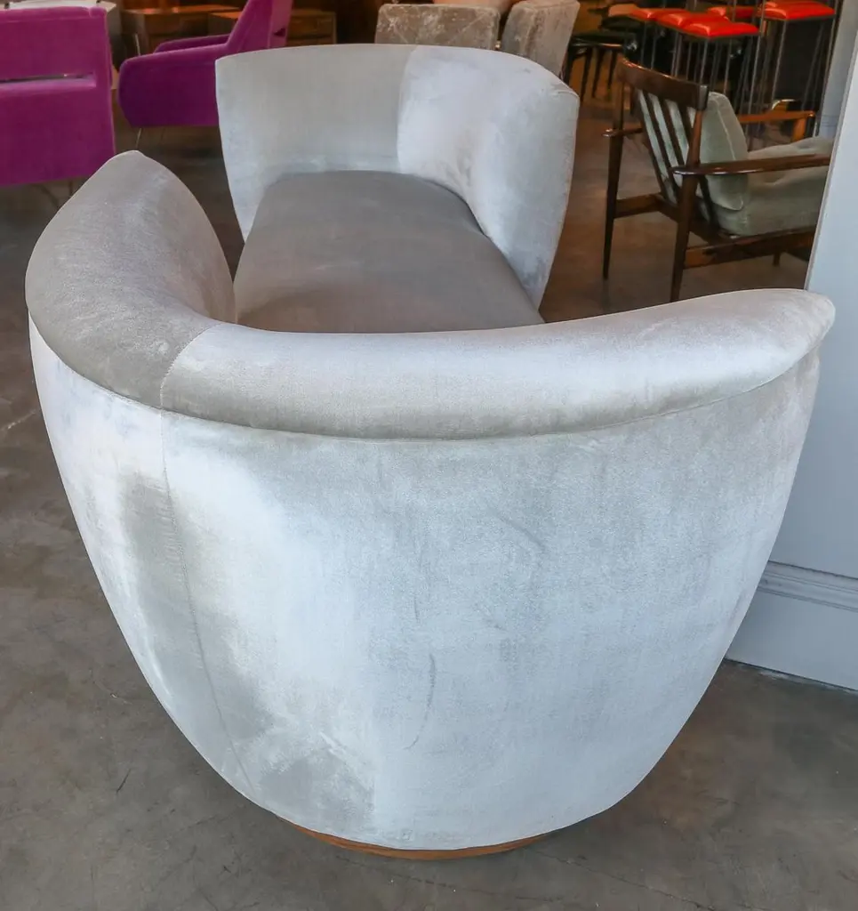 Custom tete-a-tete sofa bench in grey silk velvet with American walnut wood base. Made in Los Angeles by Adesso Imports. Can be done in different fabrics, colors, sizes and woods.Length between the arms: 51".