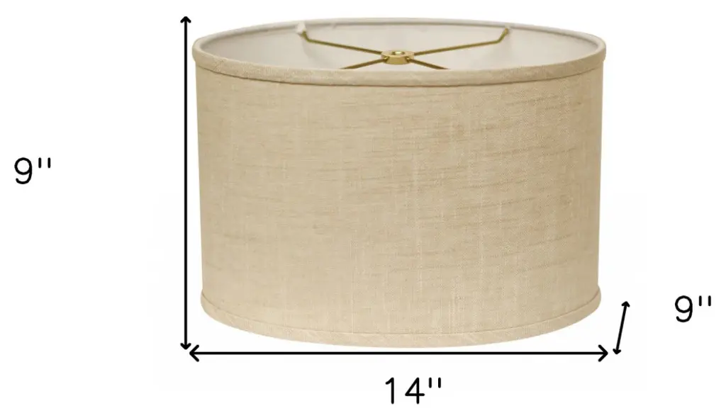 This Light Wheat Throwback Oval Linen Lampshade has a hint of mid-century modern flair and will be a great addition to your lamp base. This hardback lampshade includes a standard washer fitter that fits over a standard harp and can be used with your existing finial design. This high quality crafted oval shape has a slight slant to give it some visual interest and is crafted of the finest linen innsbruk cotton with a fold on top and bottom of the shade. 9" x 14" x 9"High Quality Fabric Lamp Shade.Includes Brass Finish Washer. Washer fitters sits on top of the harp.Intended for use with customer''s own finial.Shade measures (9x14)" top diameter x (9x14)" bottom diameter x 9" slant heightFeatures high-quality construction made from Linen Cotton Fabric.