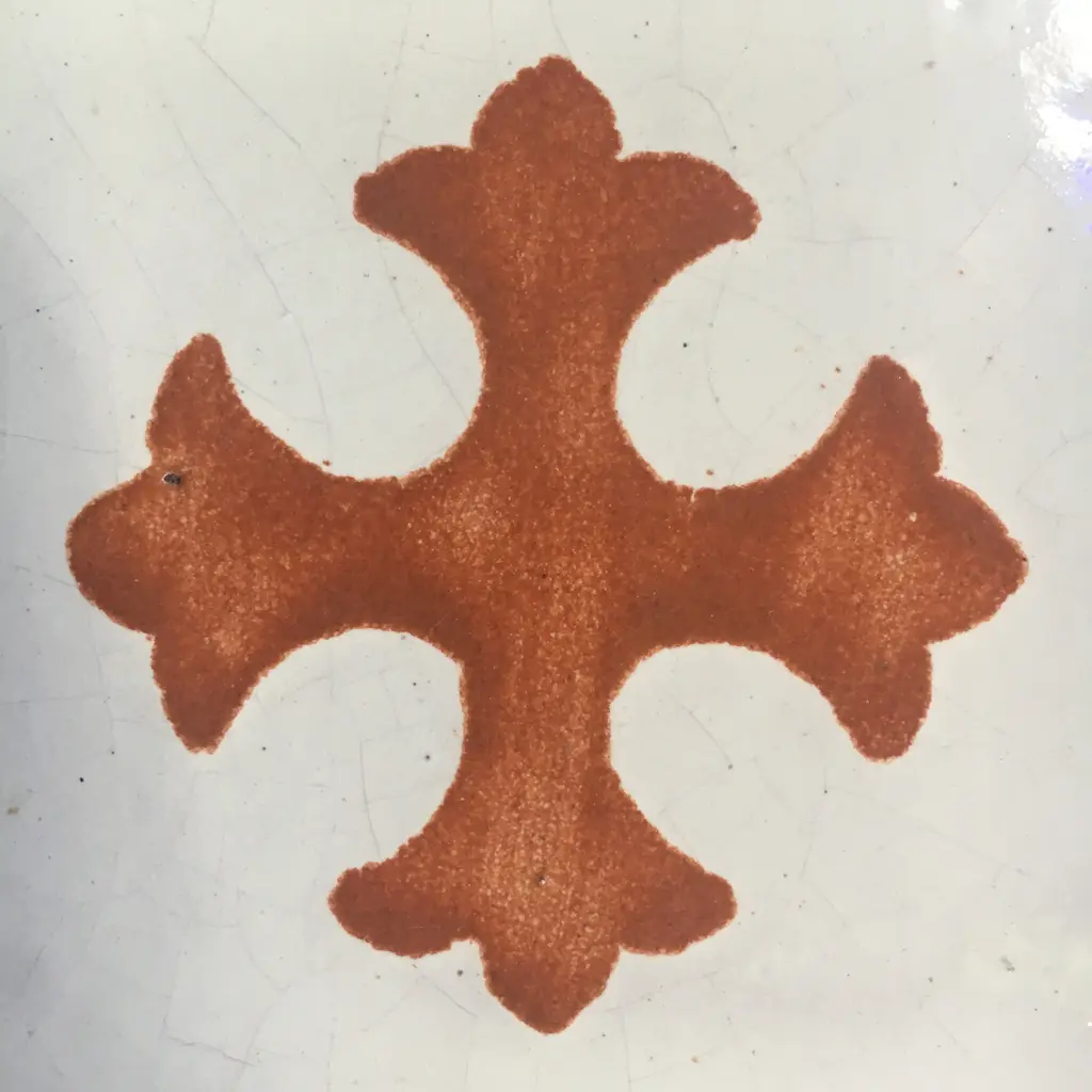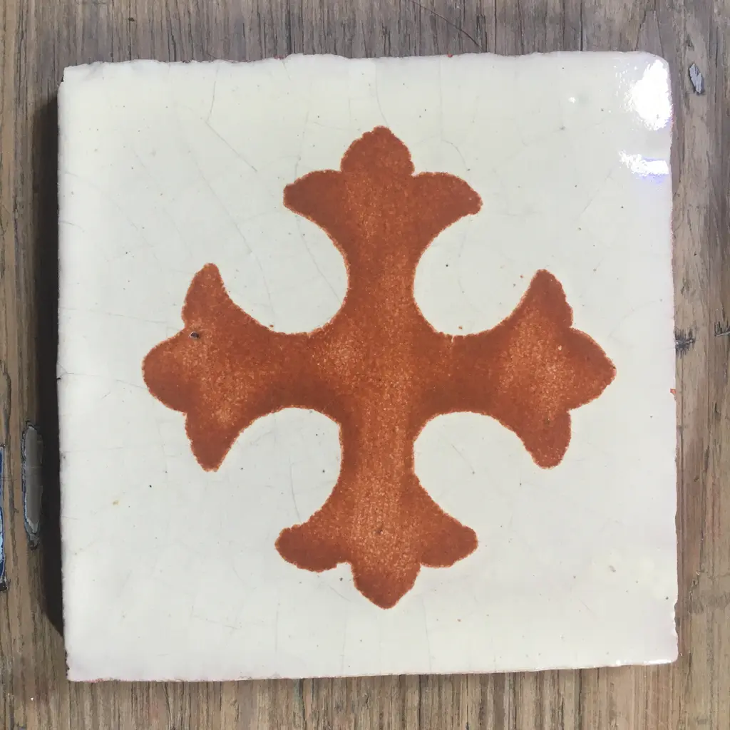 Hand-thrown and truly unique glazed tiles with Gothic cross center in an earthy red ocher tone. The field color is off-white with age-related crazing and character. *If interested in purchasing multiples, please message me so that I can help set up a cost-effective and efficient means of shipping them for you. Dimensions: 4" x 4" x .3125" Spanish Colonial Collection Highlight 0.26