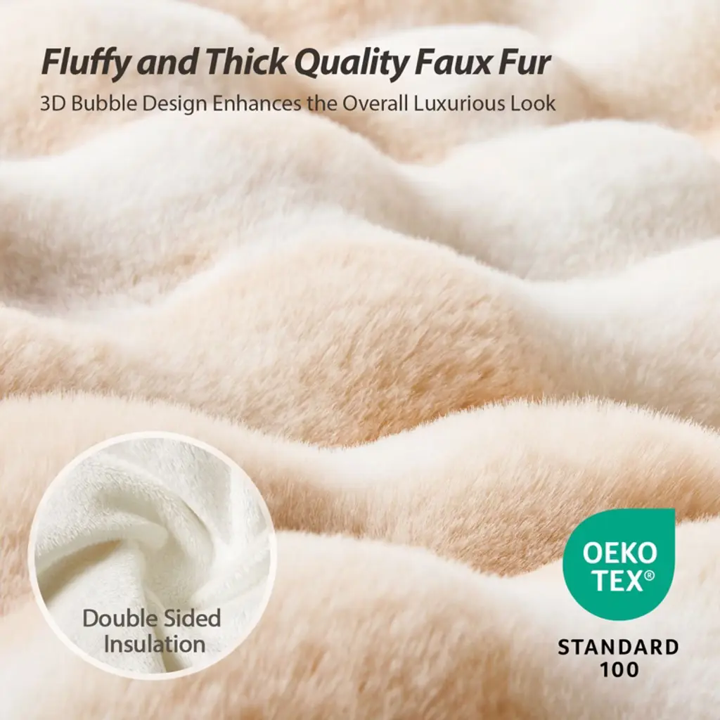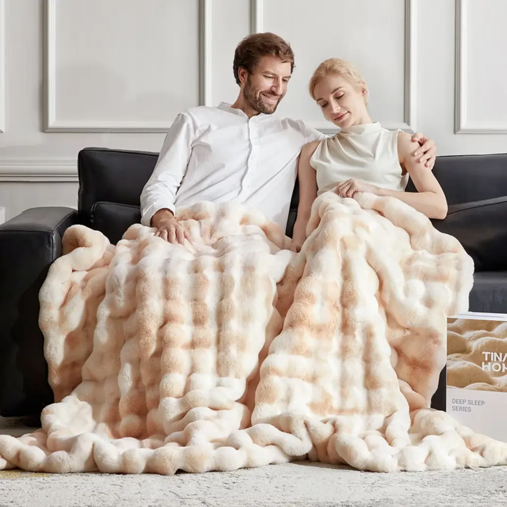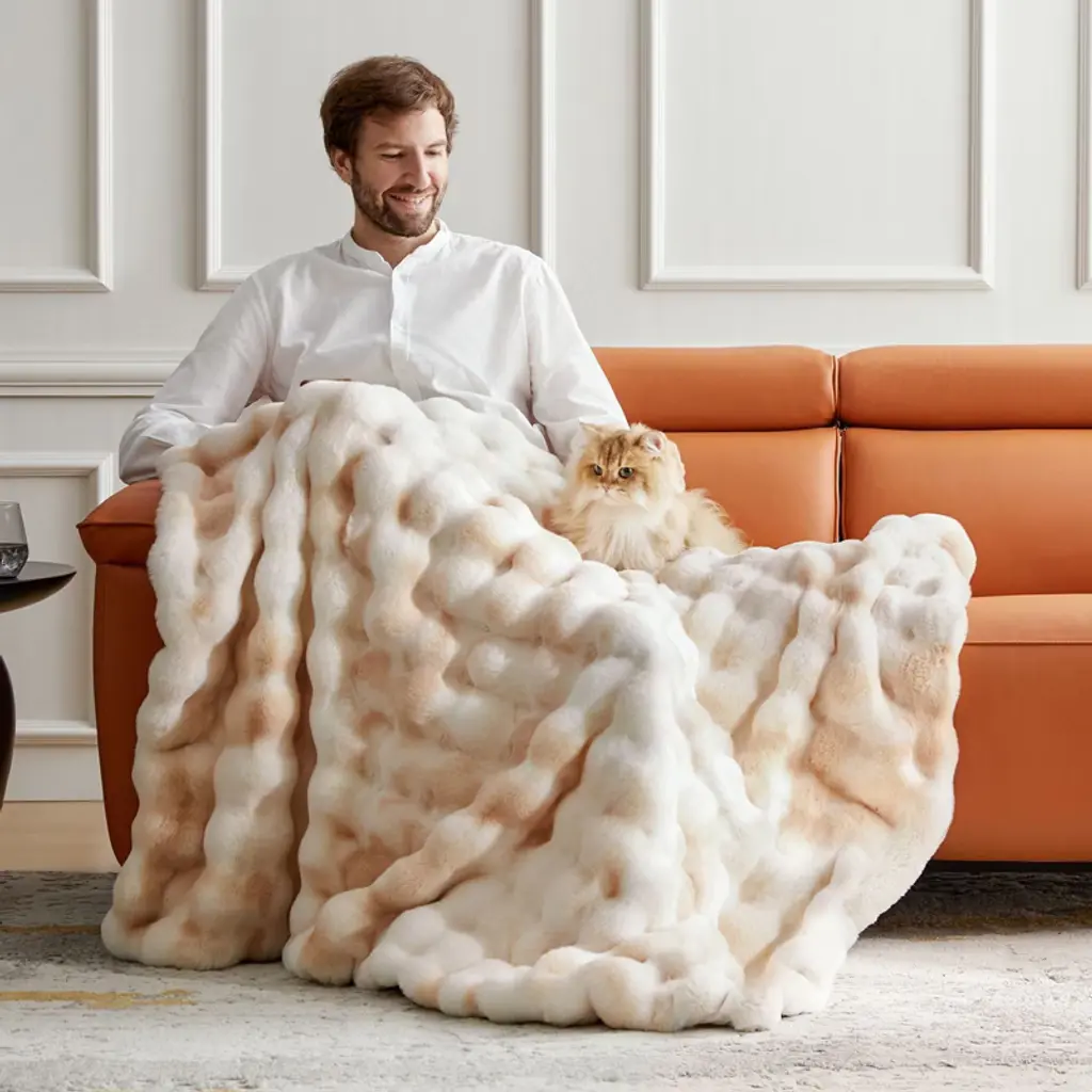 Indulge in the luxurious comfort of this fur throw, featuring a plush 750GSM faux rabbit fur front with a silky mink-like touch, crafted using an tie-dye process for a natural, stylish look. The premium crystal velvet on the reverse side offers a soft, skin-friendly feel and excellent warmth. Its unique 3D bubble design enhances texture and adds a touch of elegance, making it a suitable accent piece for any bedroom, living room, or home space. Designed for easy maintenance, this throw is machine washable, ensuring hassle-free care. With its exquisite packaging, it also makes a thoughtful and elegant gift for loved ones.