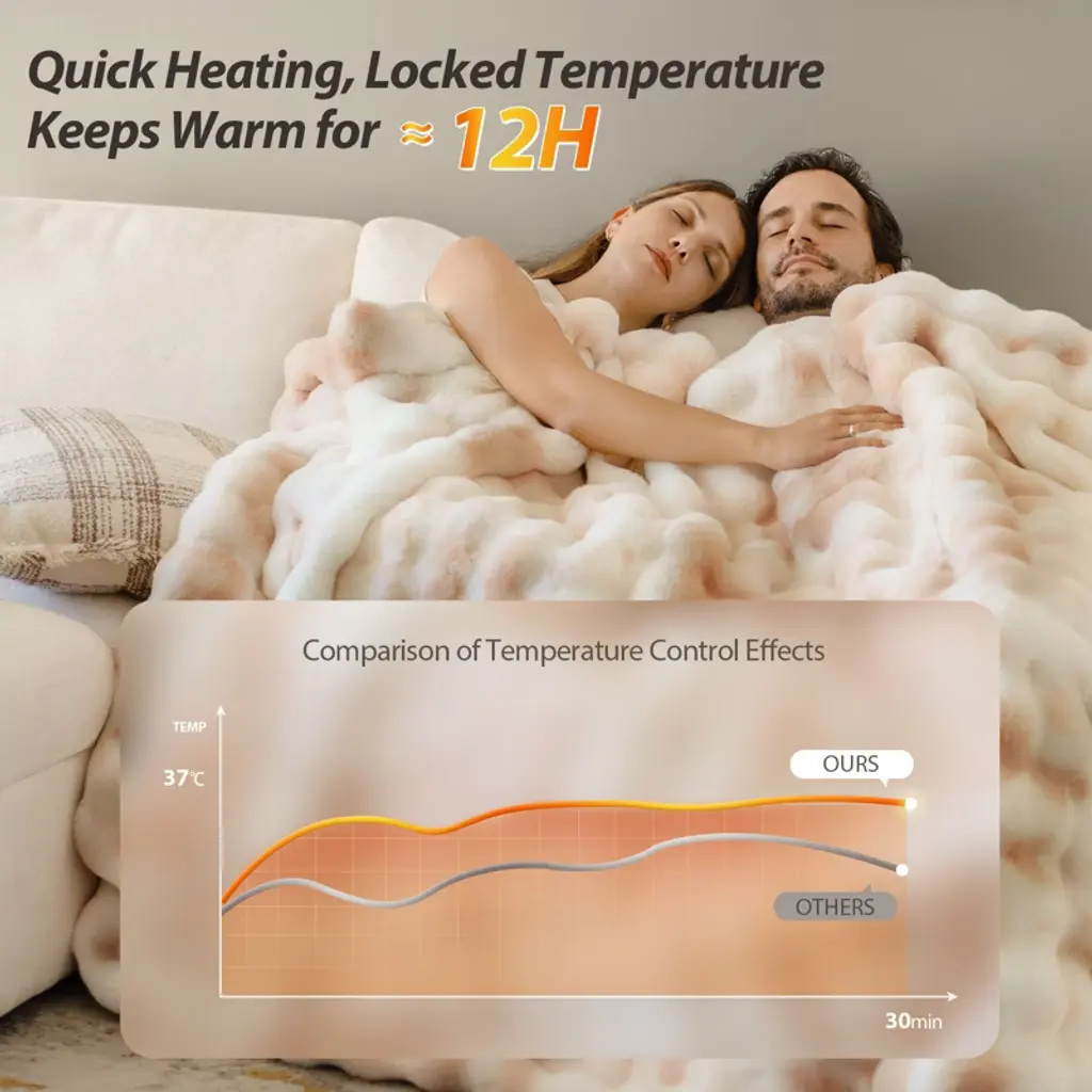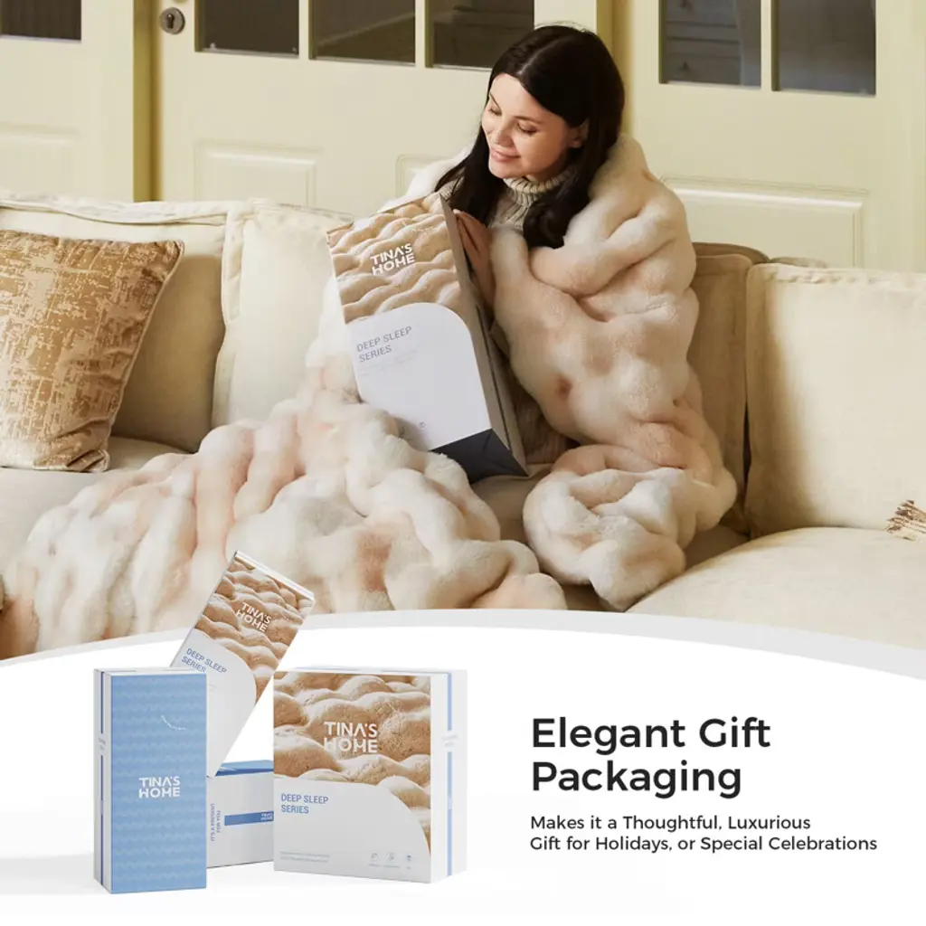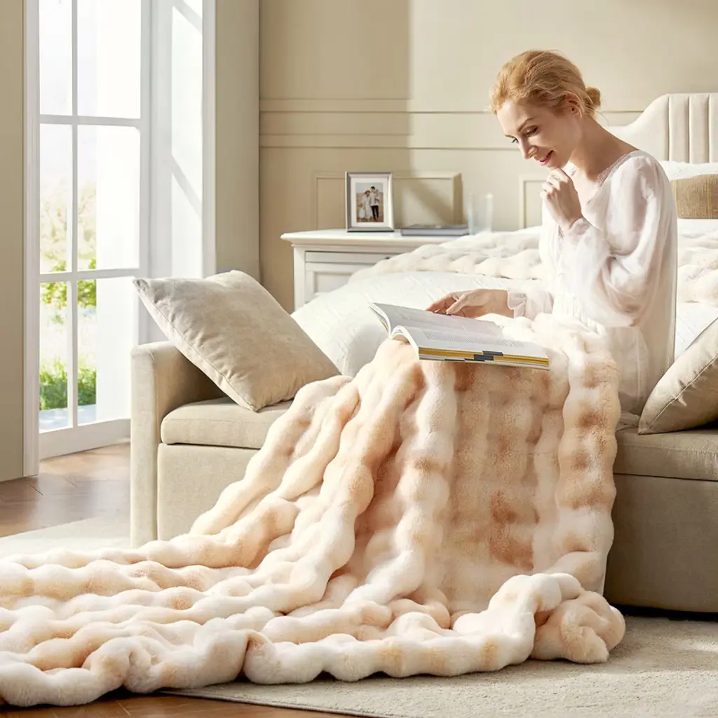 Indulge in the luxurious comfort of this fur throw, featuring a plush 750GSM faux rabbit fur front with a silky mink-like touch, crafted using an tie-dye process for a natural, stylish look. The premium crystal velvet on the reverse side offers a soft, skin-friendly feel and excellent warmth. Its unique 3D bubble design enhances texture and adds a touch of elegance, making it a suitable accent piece for any bedroom, living room, or home space. Designed for easy maintenance, this throw is machine washable, ensuring hassle-free care. With its exquisite packaging, it also makes a thoughtful and elegant gift for loved ones.