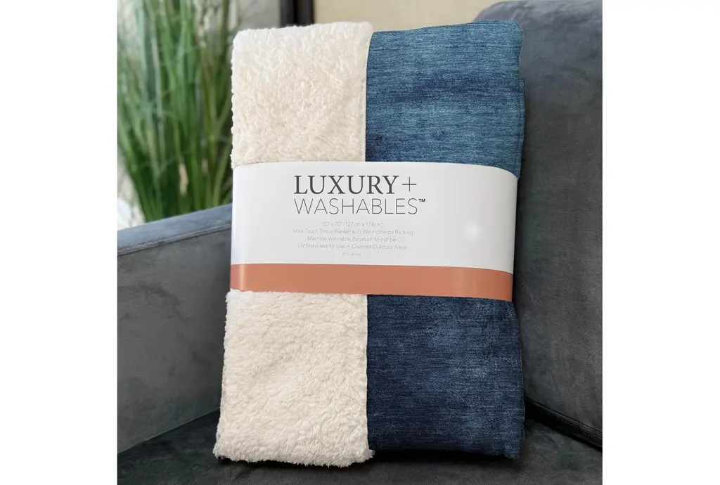 Introducing the 50" x 70" Denim Blue Libby Color Block Throw Blanket. This modern throw blanket brings a touch of contemporary style and cozy comfort to your living space. Crafted from durable polyester, it features a striking denim blue color block design that will enhance any room.