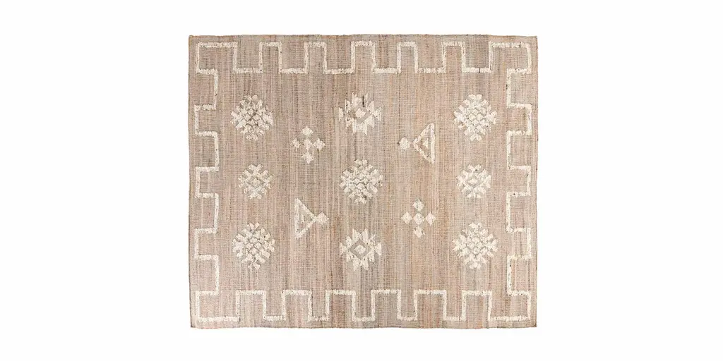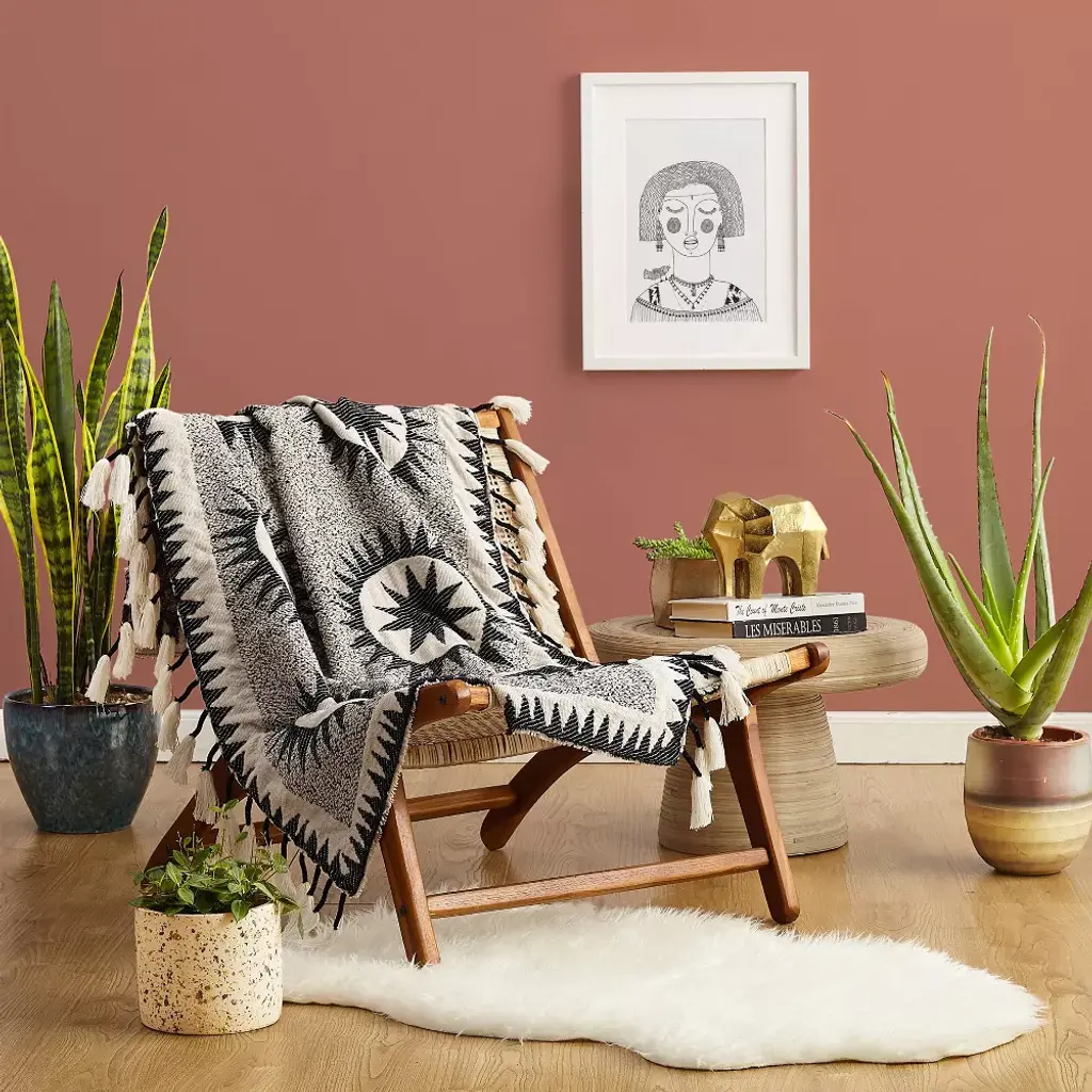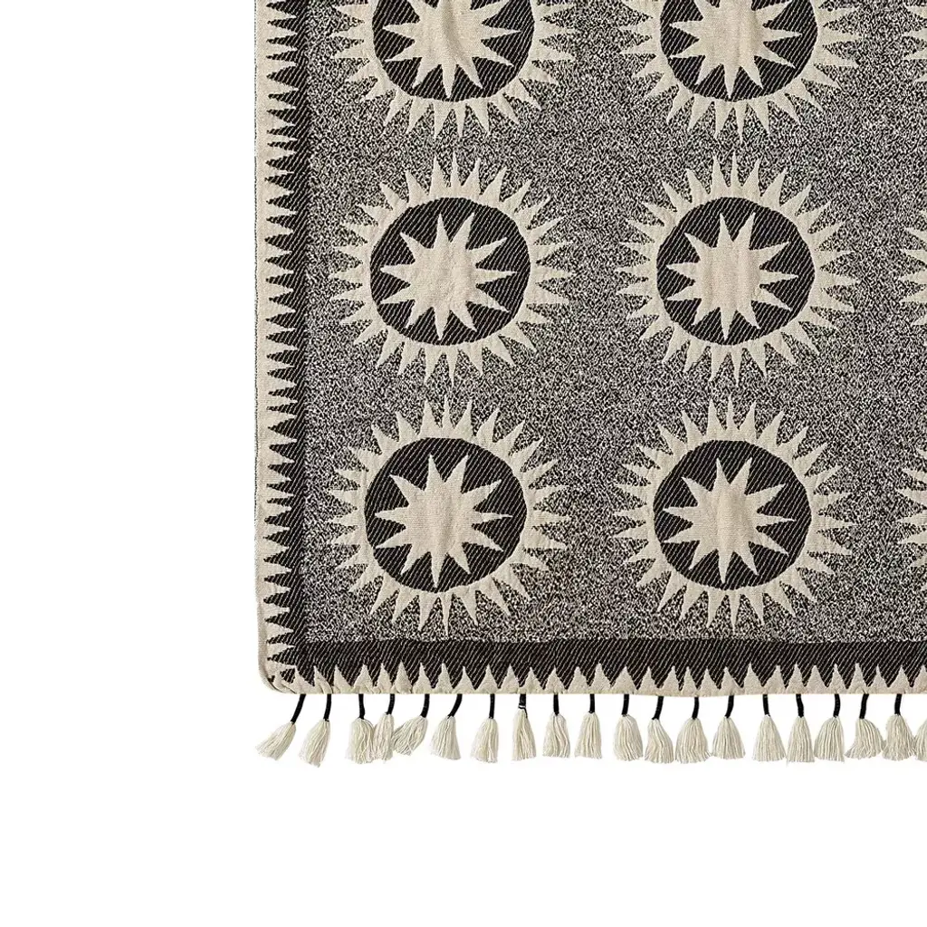 Designed by Justina Blakeney, the Soleil Throw blanket is Justina's modern spin on a traditional suzani quilt. The sun medallions are meant to radiate positive energy. The black dots combined with the suns symbolize the infinite nature of the cosmos. This pattern is featured on a cream background. The look is made complete by rows of tassels that give the modern throw a boho flair.