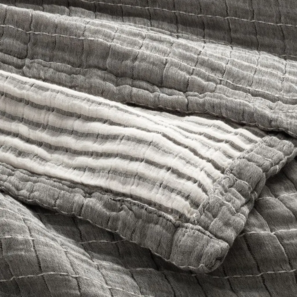 Fine cotton threads weave a grey bed throw with a cloud-soft hand feel and irresistible fluffiness. With a double-layer construction for an extra-downy finish, the blanket's puckered grey grid reverses to cream with grey pinstripes. Drape the throw across the foot of the bed for an inviting layer of warmth and coziness. Machine washable and low maintenance, our elegant yet relaxed Ardine grey bed throw is a Crate and Barrel exclusive.