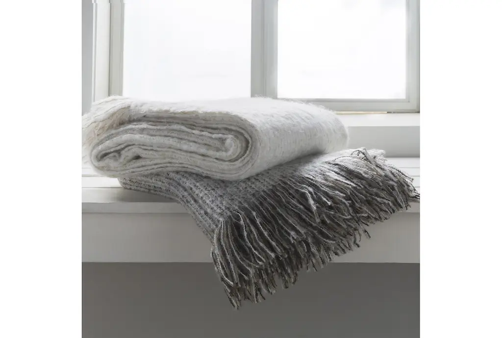 This Accent Throw-Taupe Fringe product is a modern-style throw made of 100% acrylic fiber material, featuring a beige color with taupe, white, and charcoal accents and a fringe detail.